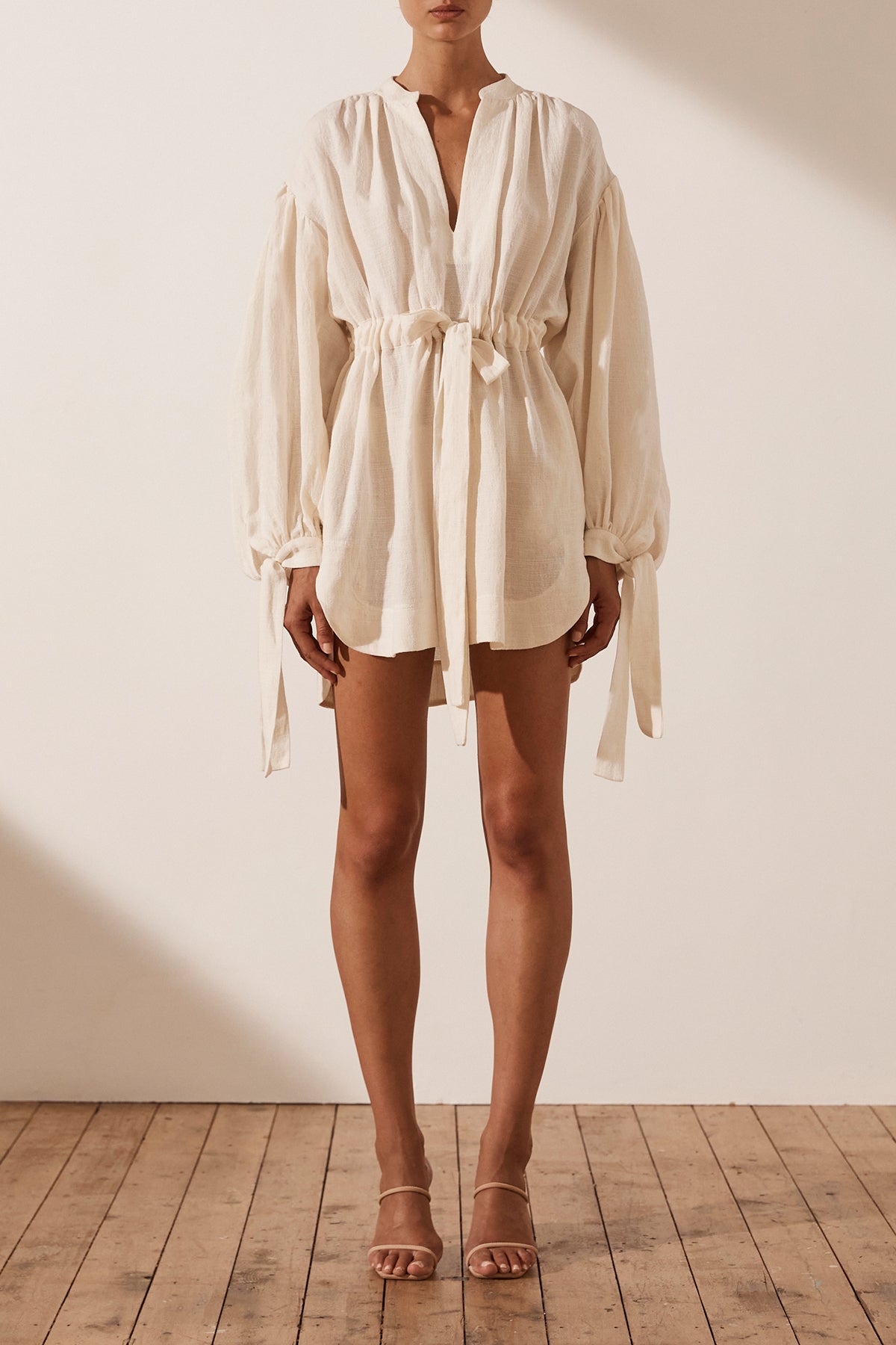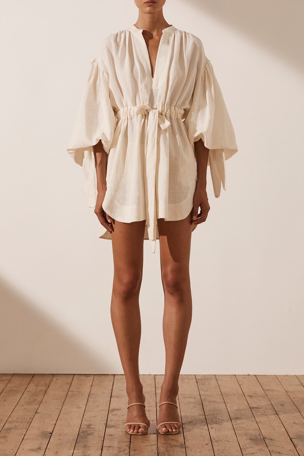 This stunning Shona Joy Brigitte Balloon Sleeve Mini Dress is perfect for your upcoming Spring events. It is made of a premium linen blend fabric & beautiful balloon sleeves with tie detailing at the cuffs. Perfect forever piece for your wardrobe.