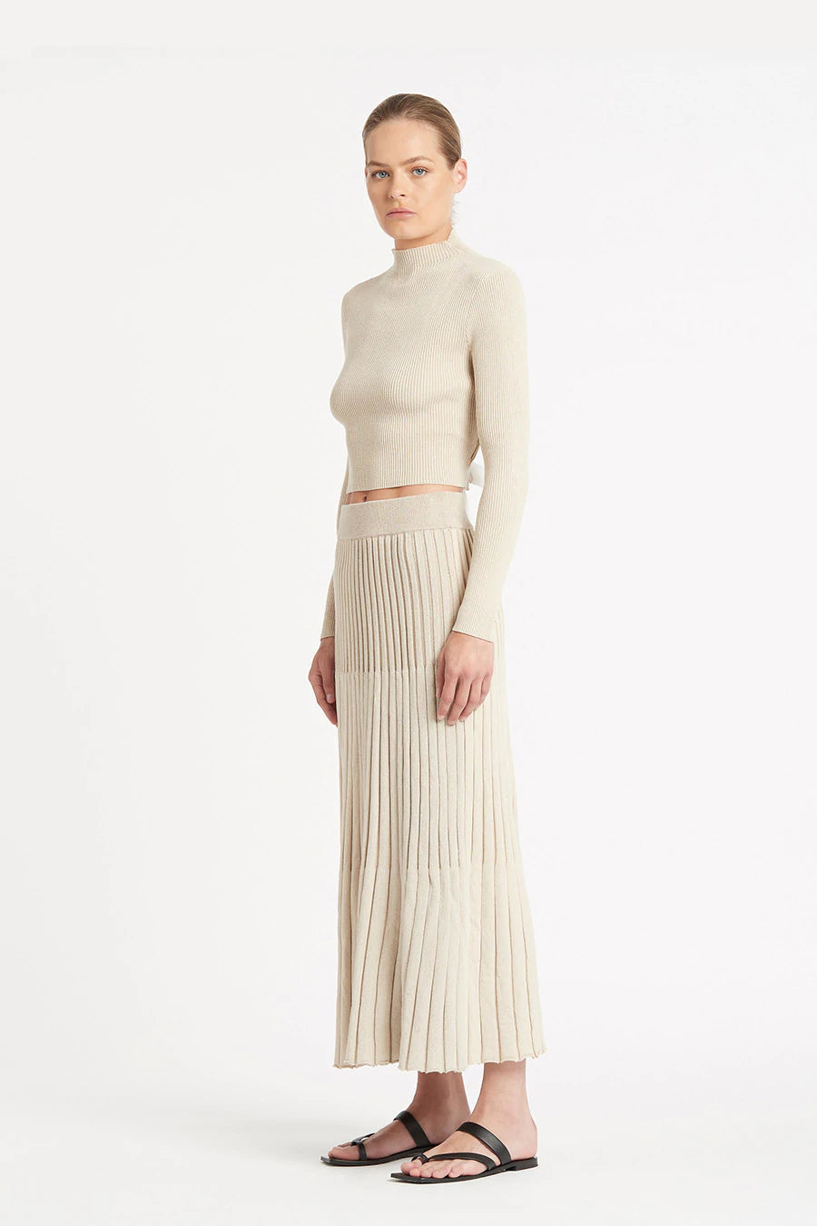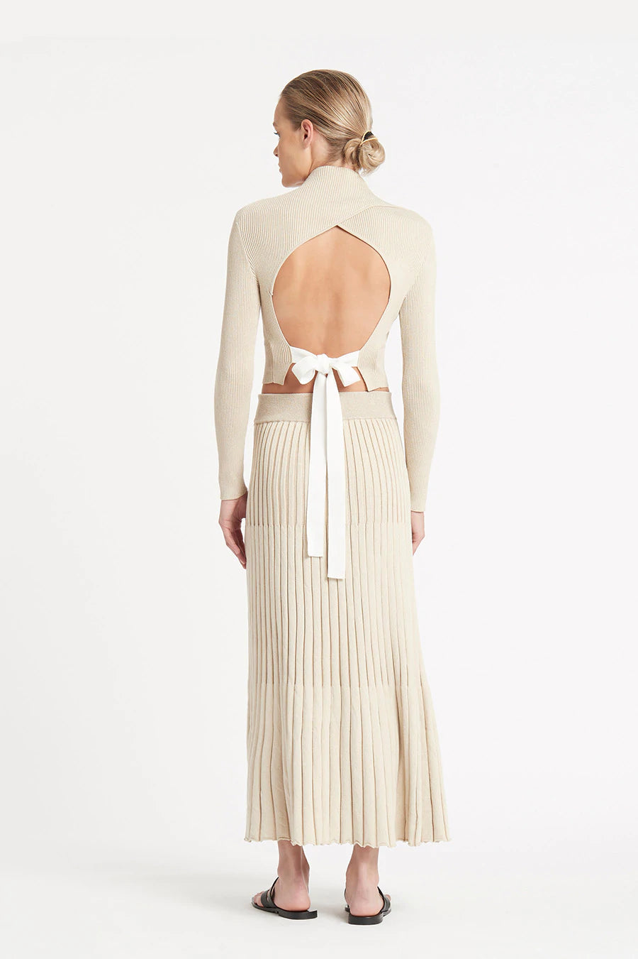 A cropped knit top, features open back with contrast tie.Cropped lengthSlim fitHigh neckOpen backContrast tieRibbed knit fabricationStretch