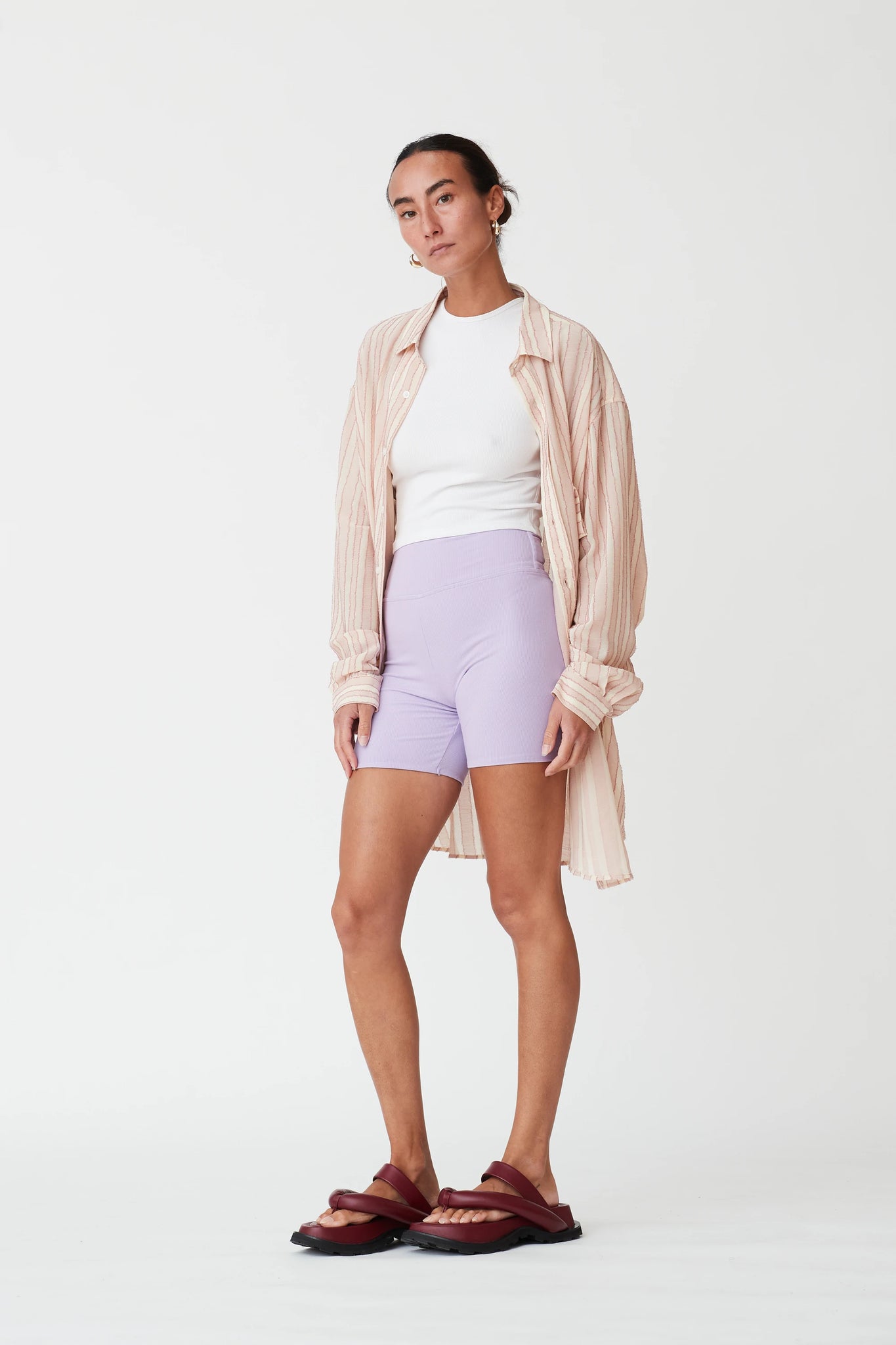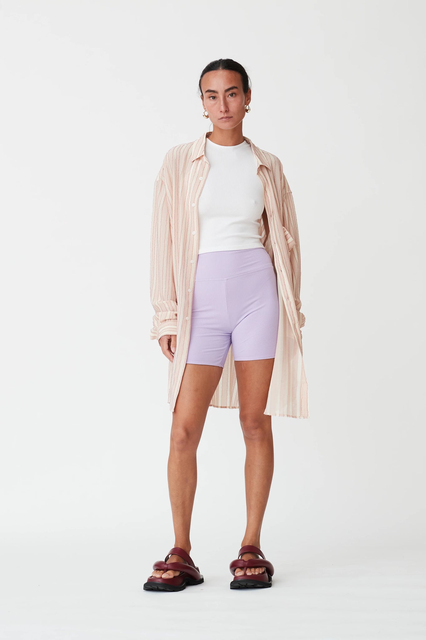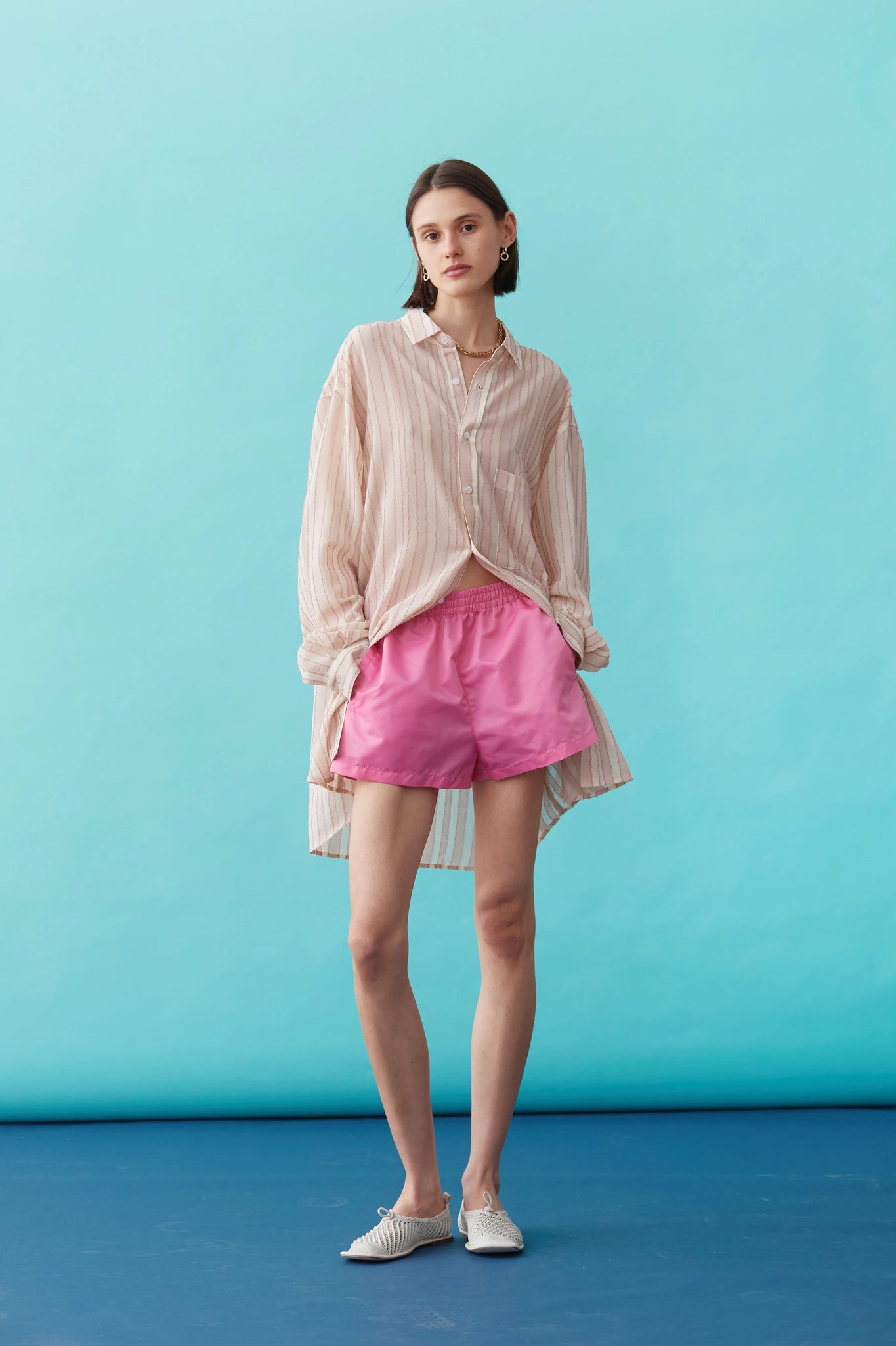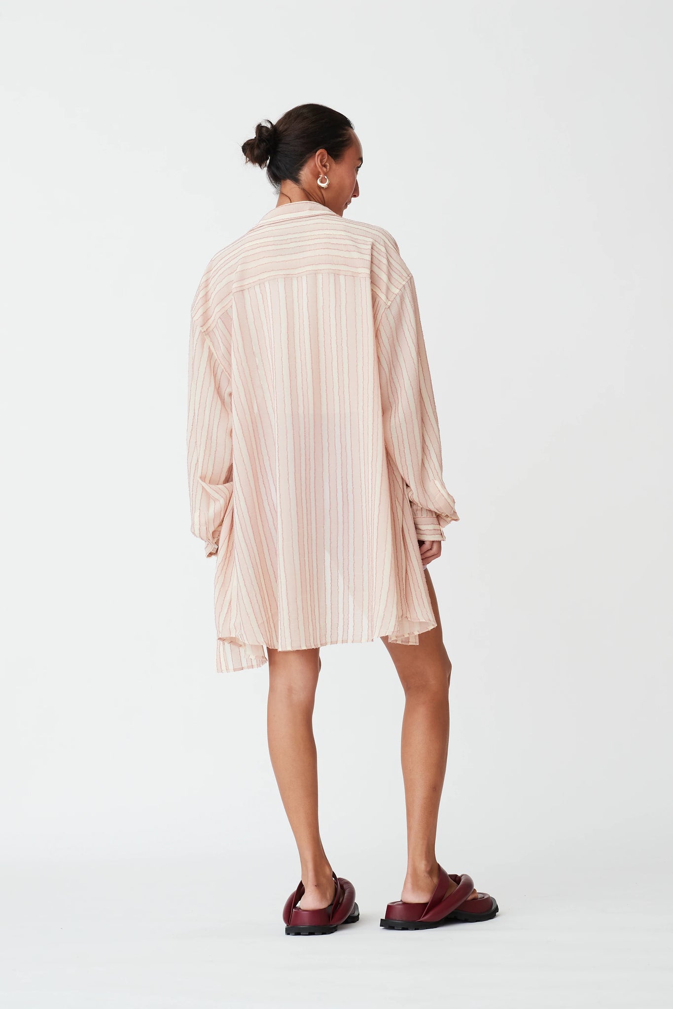 A textural button down in muted pink, the Olivia is a short sleeve style with our signature oversized fit and slight sheerness.