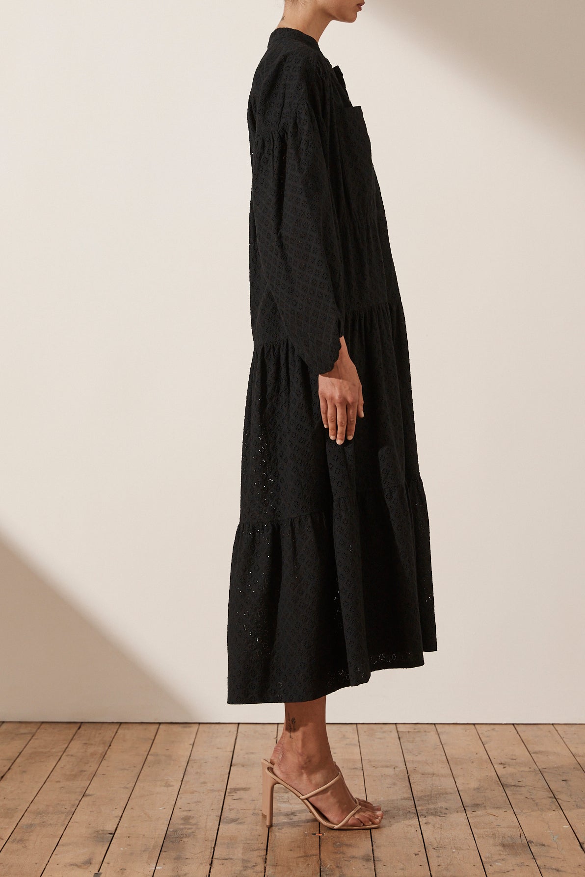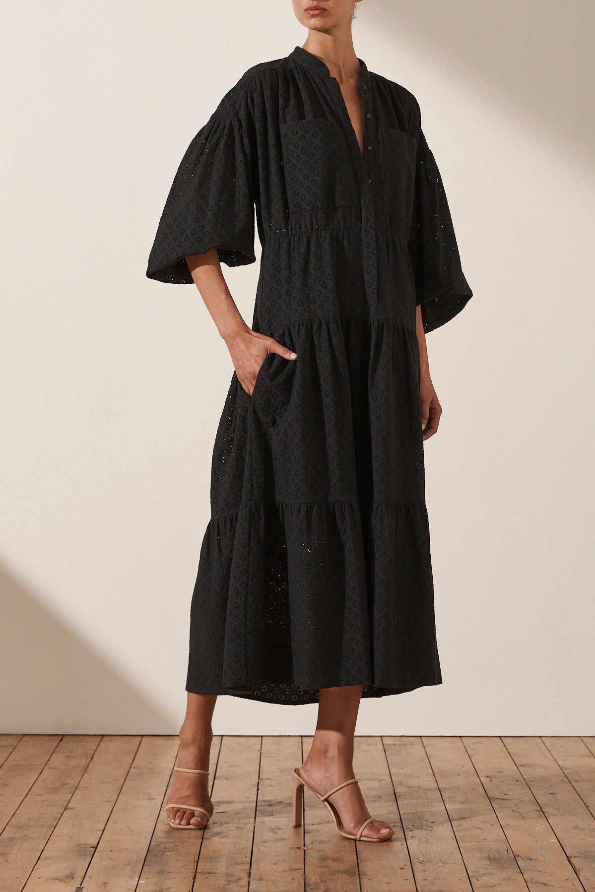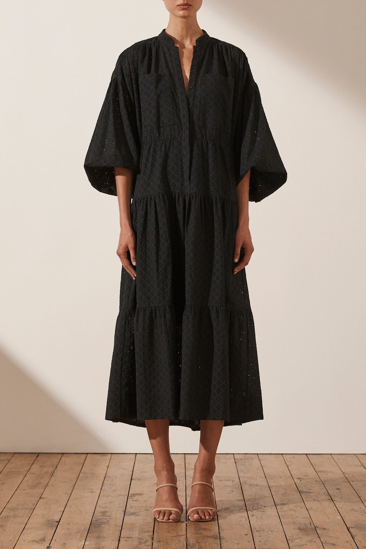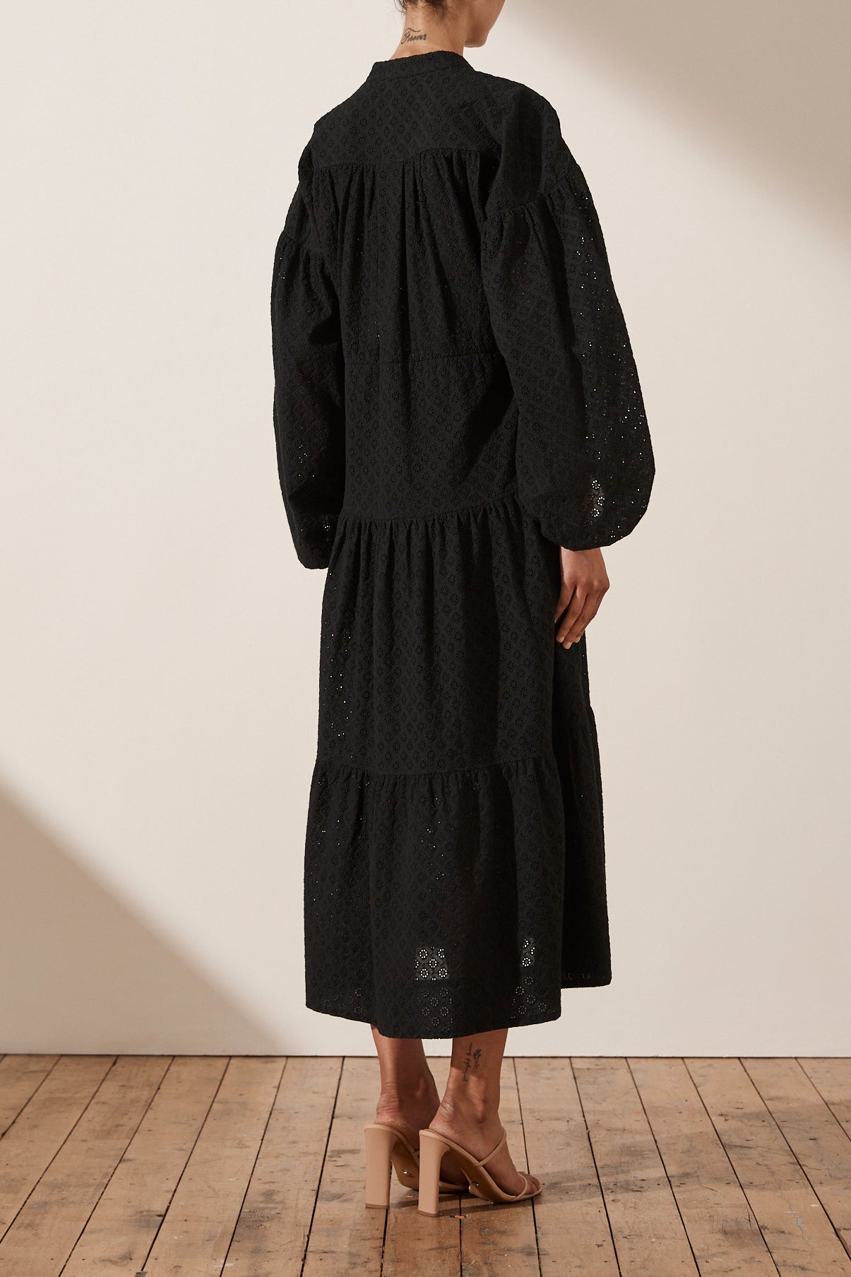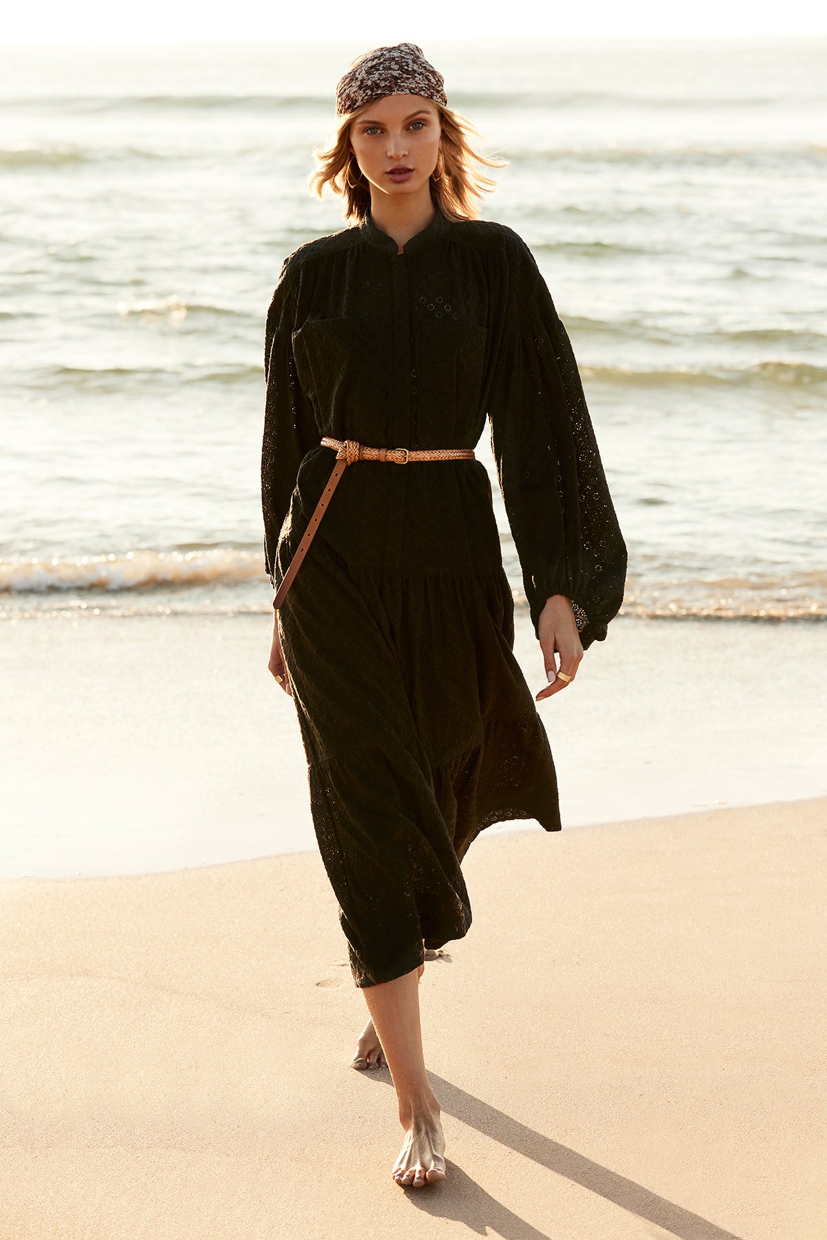 Textured cotton broderie anglaise High neckline Balloon sleeve with elasticated cuffs Stand collar Midi length Pockets at waist Medium weight, non-stretchy woven 100% Cotton broderie anglaise Unlined Designed in Australia Made in China Our model wears a AU6/US2...Read more