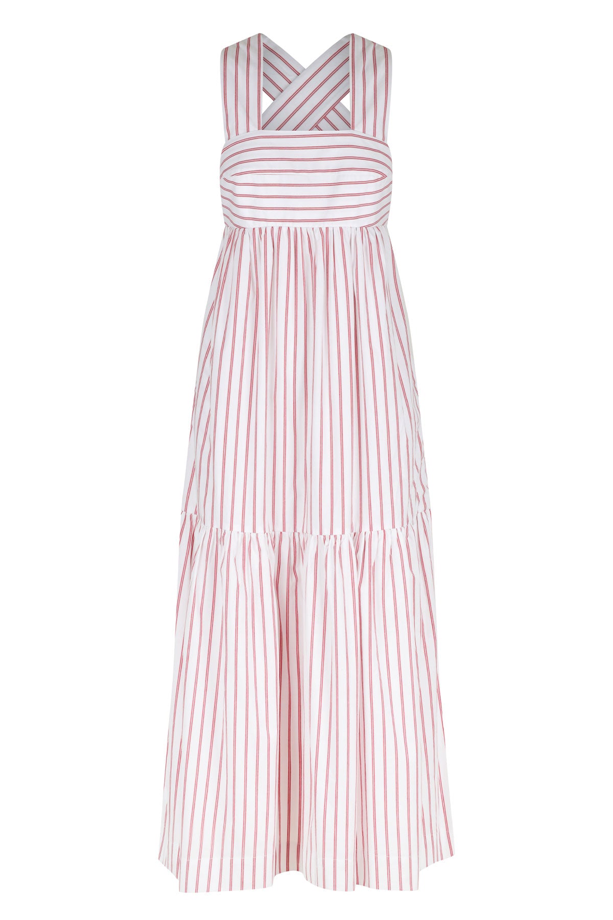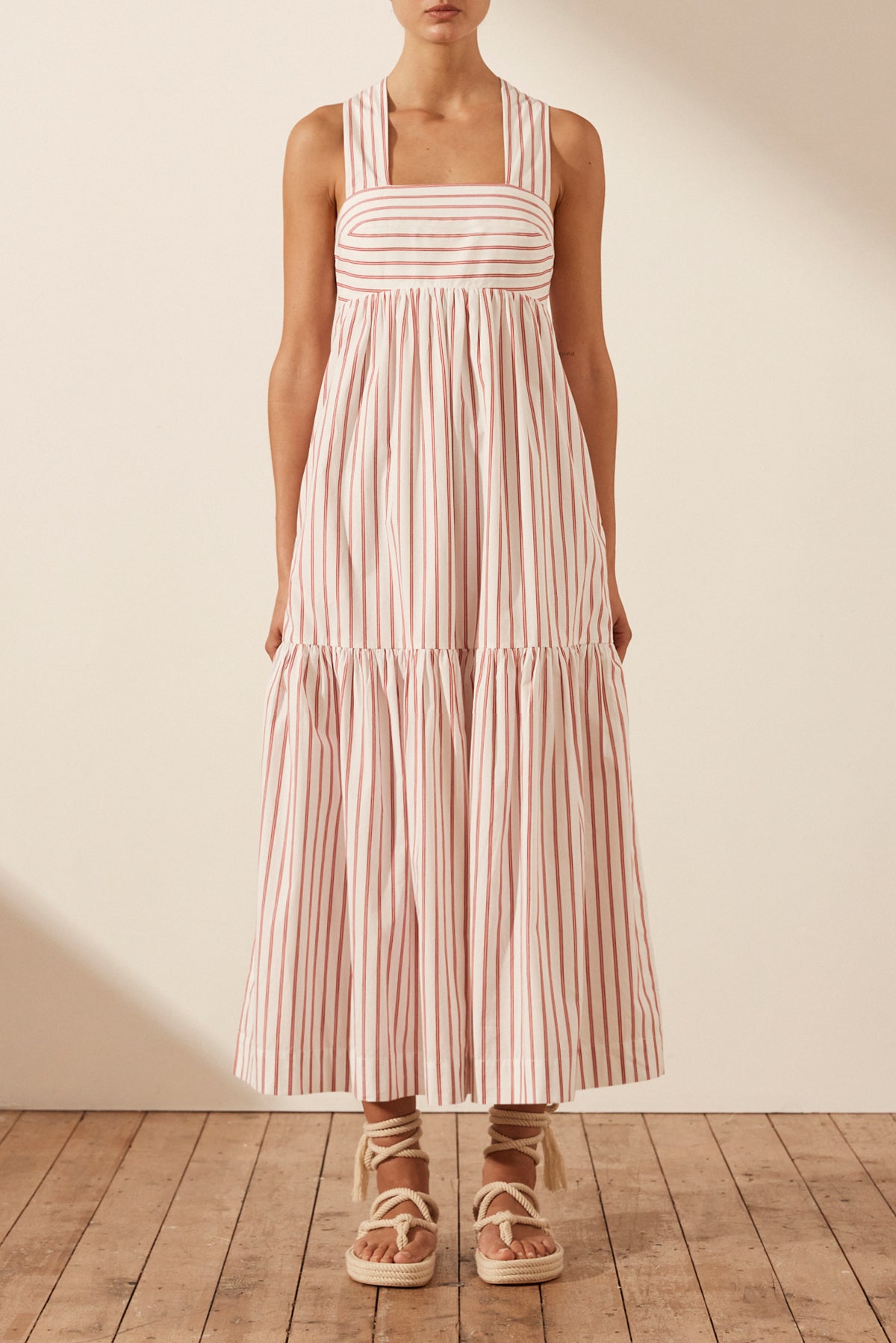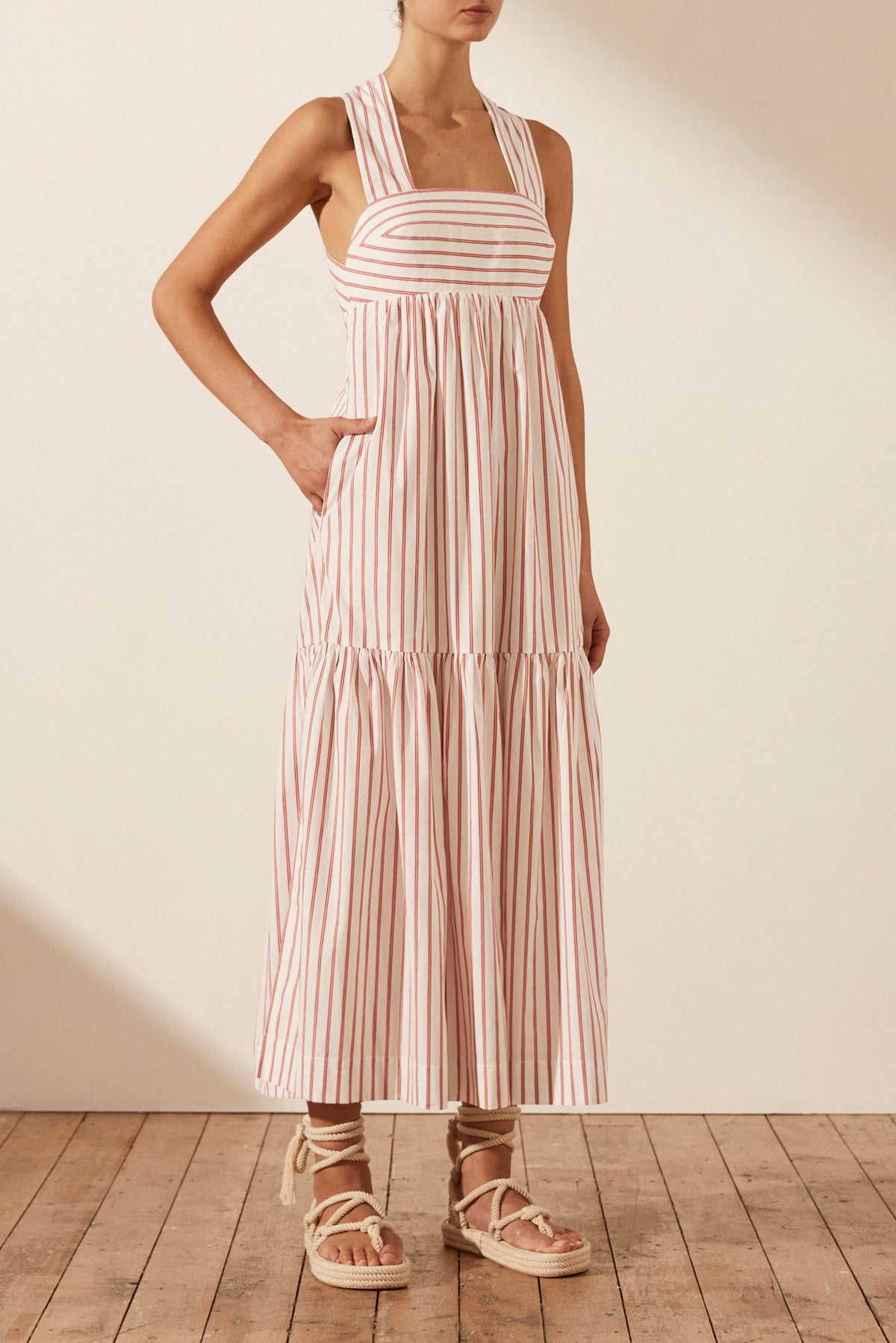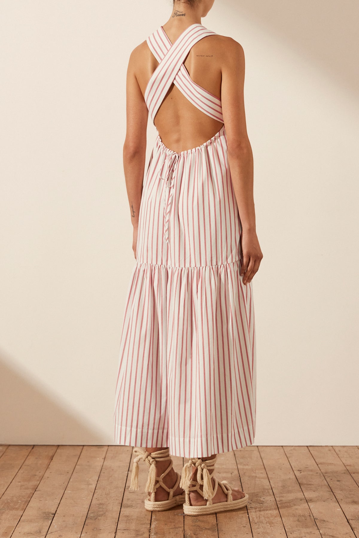 Style number: 232132 Exclusive Ribiero stripe Crisp cotton poplin Square neckline Open back with wide crossover straps Drawstring waist at lower back Side pockets Tiered midi length skirt Medium weight, non-stretchy woven 100% Cotton Lined Designed in Australia...Read more