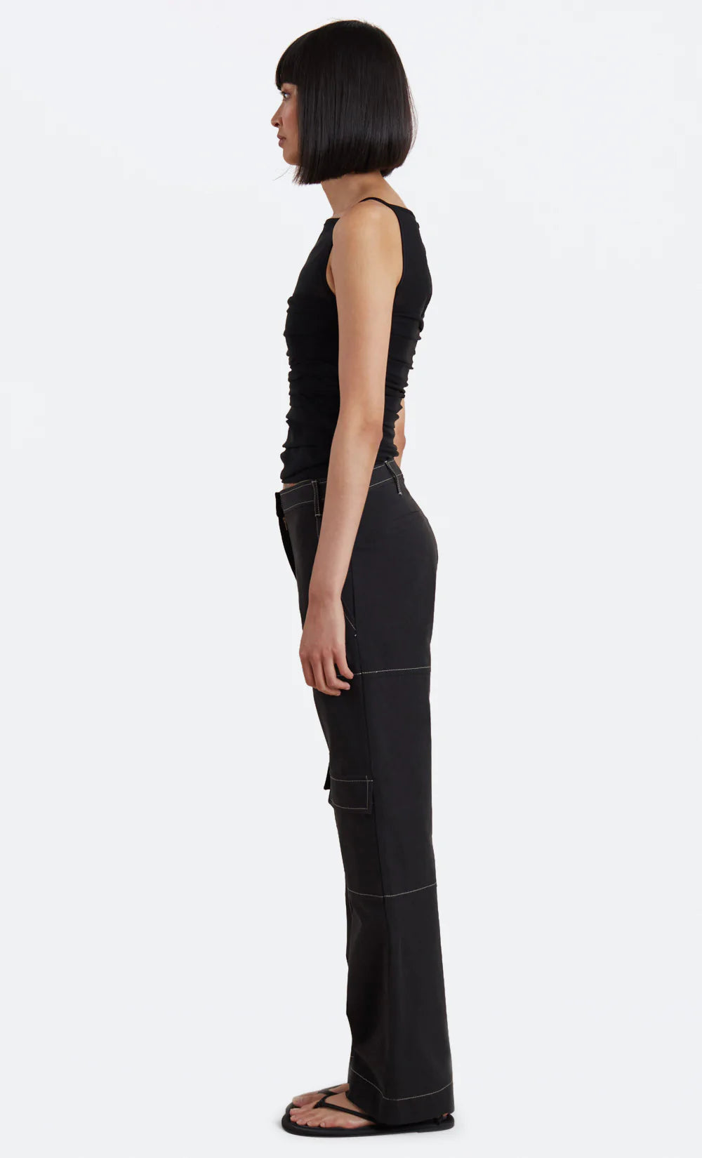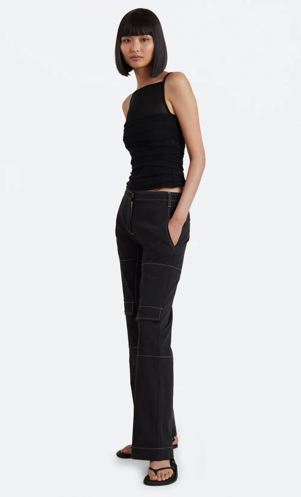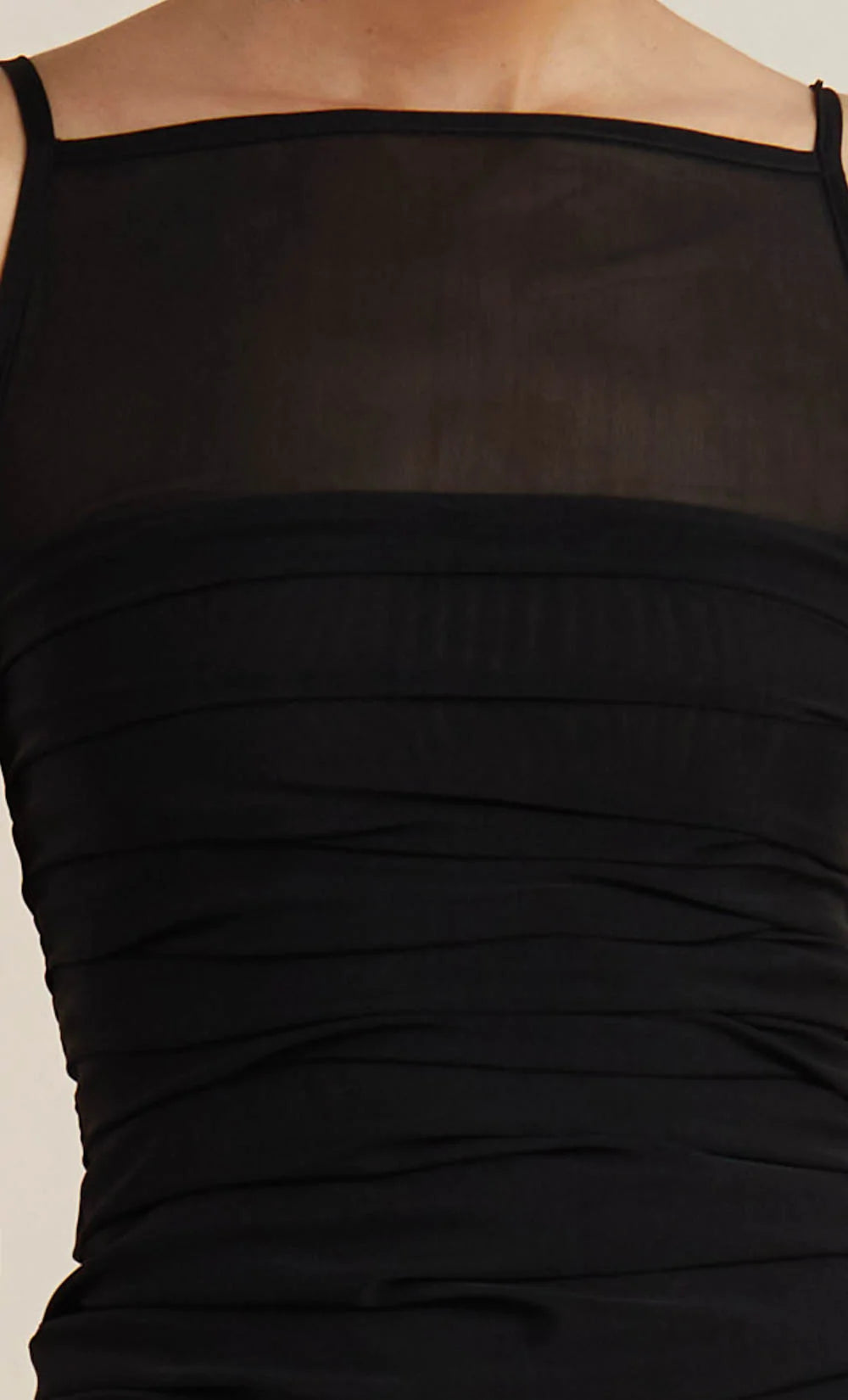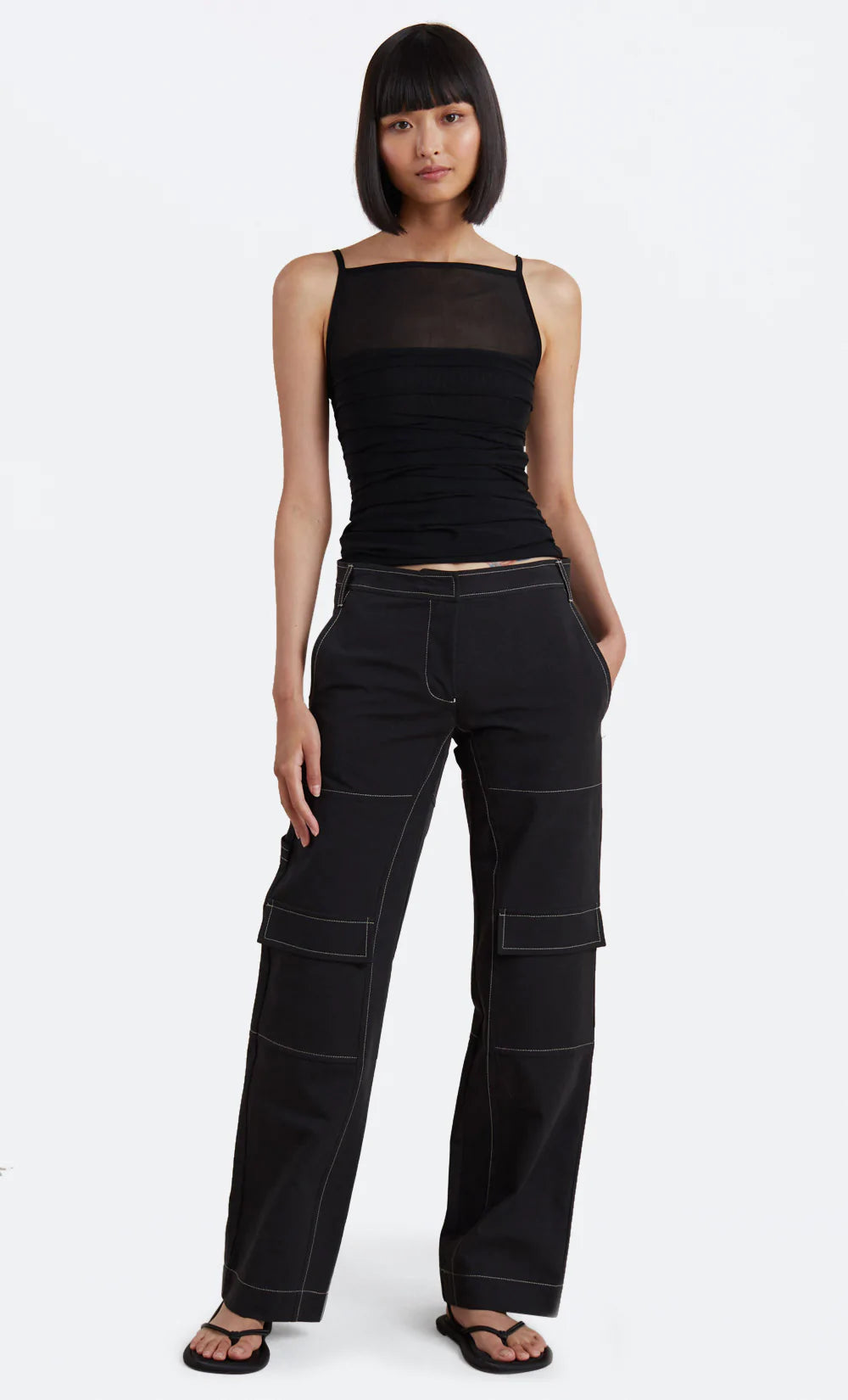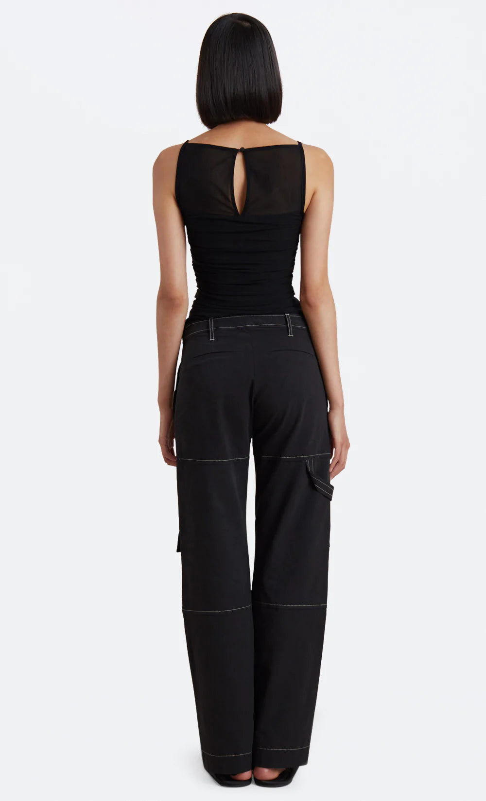 A feminine and versatile style, the Riri Top features beautiful sheer panelling above bust, a flattering square neckline and keyhole opening at back. The cami is ruched at side seams to cinch in the waist and finished with ribbed edges and straps. Styled with our Austin Pant.