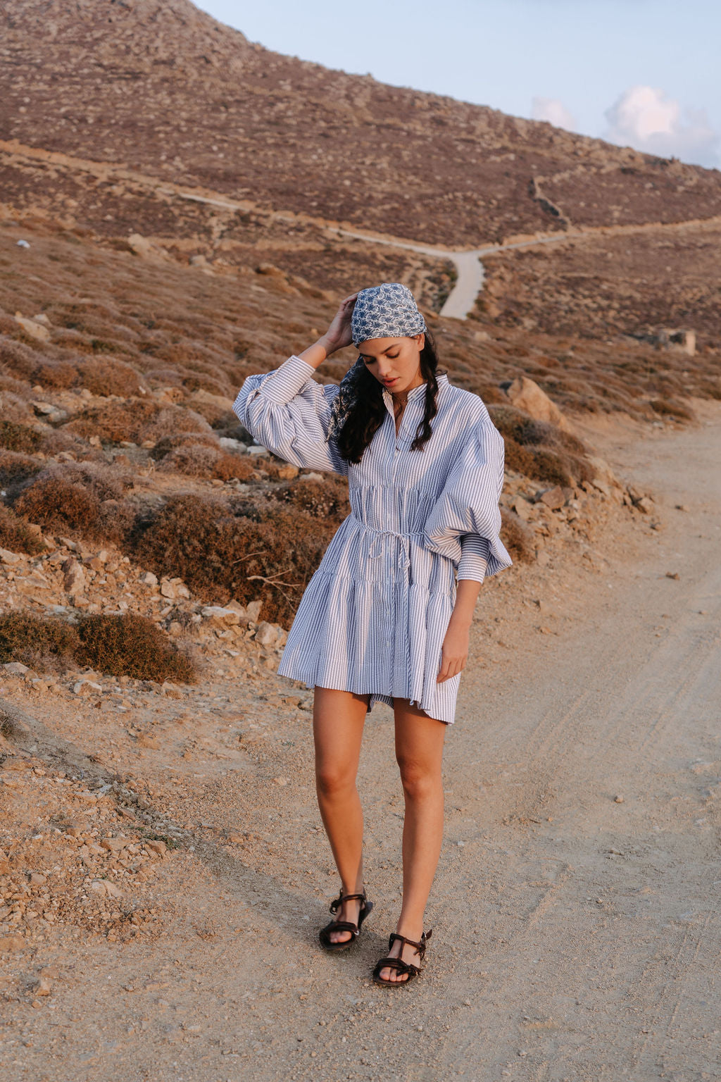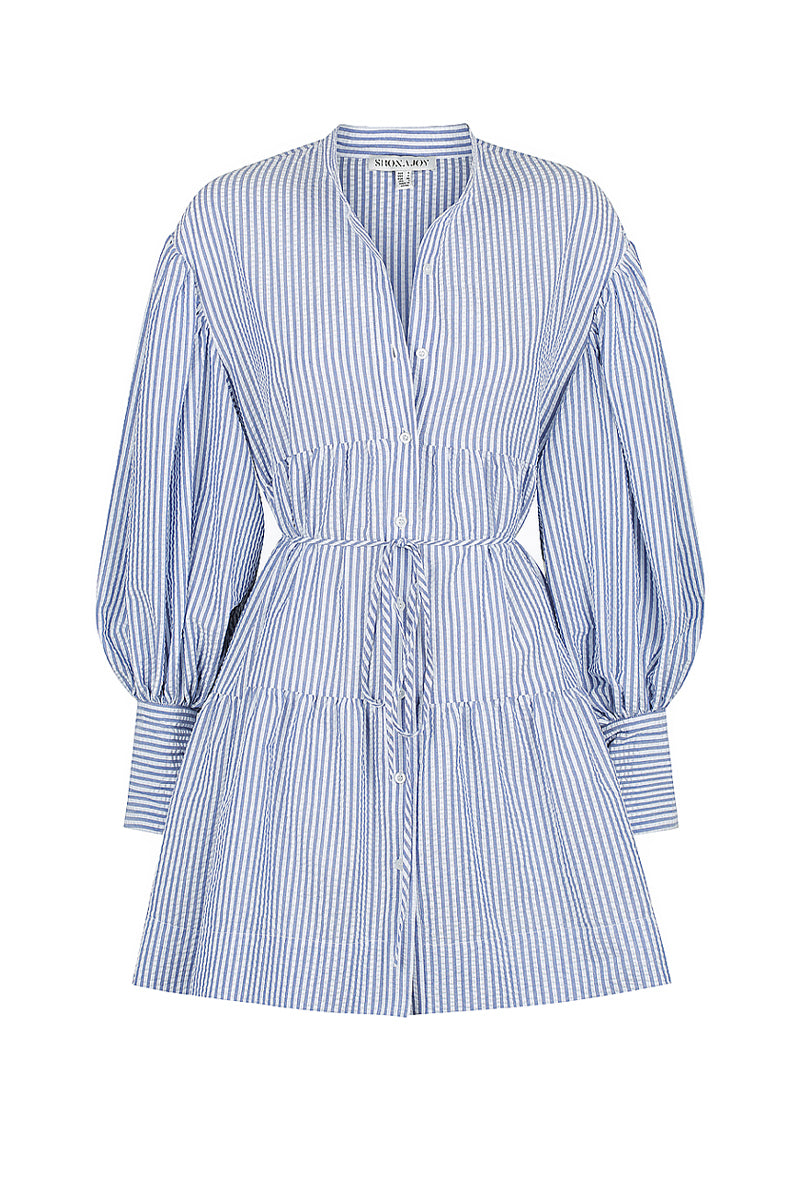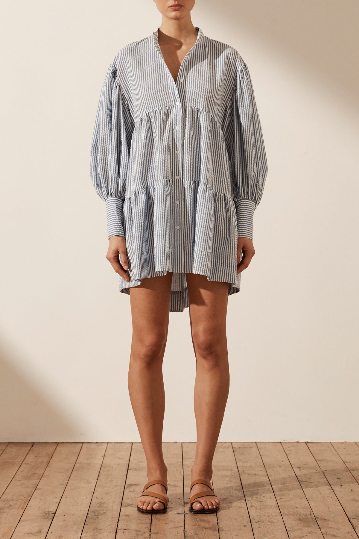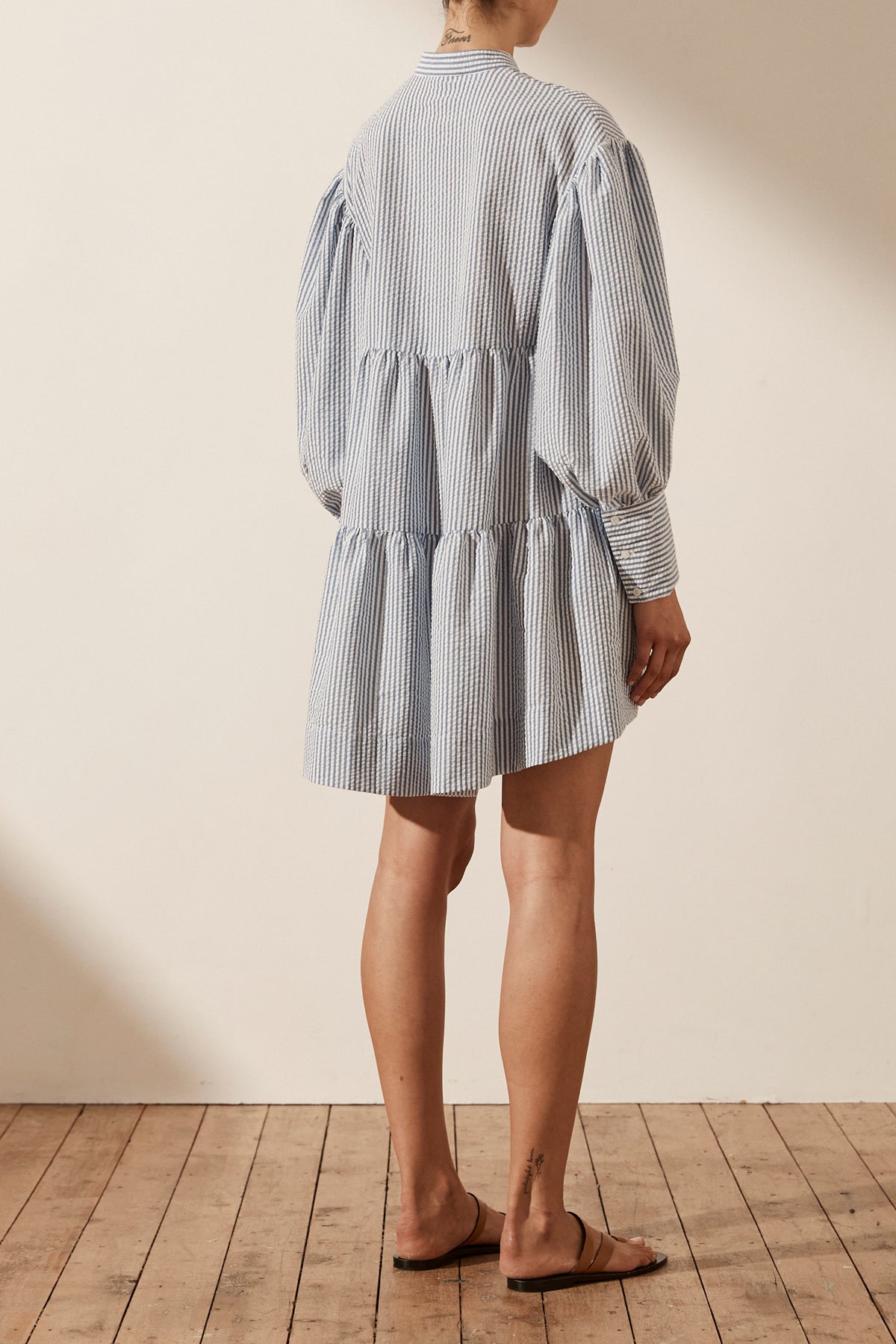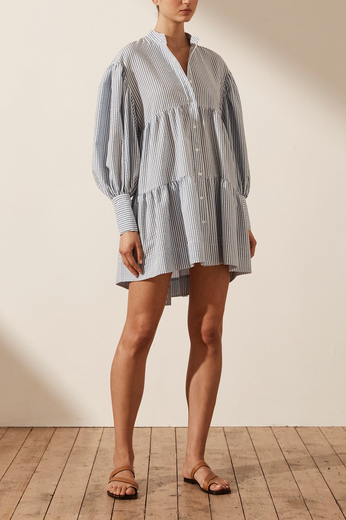 Roberta Balloon Sleeve Tiered Mini Dress In Sky & Ivory. Tiered balloon sleeve mini dress in a light weight crinkle cotton Style number: 221040 Self-stripe crinkle fabrication Stand collar Button front closure Balloon sleeve with button cuff Removable...Read more