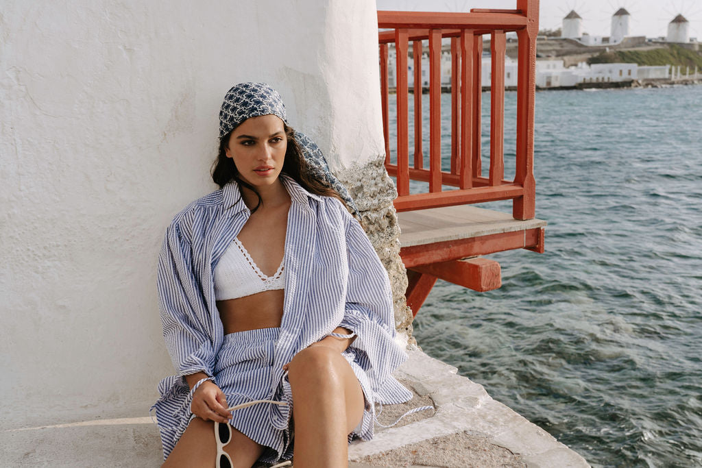 Roberta Short Sky & Ivory Self-stripe crinkle fabrication Elasticated waist Decorative front button tab Flared short legs Side pockets Medium weight, non-stretchy woven 100% Cotton Lined Designed in Australia Made in China Our studio model wears a AU6/US2...Read more