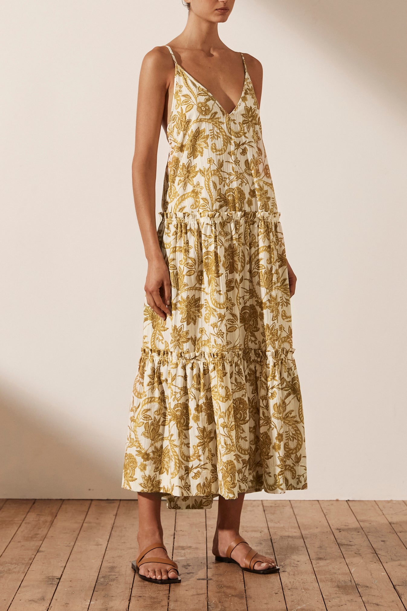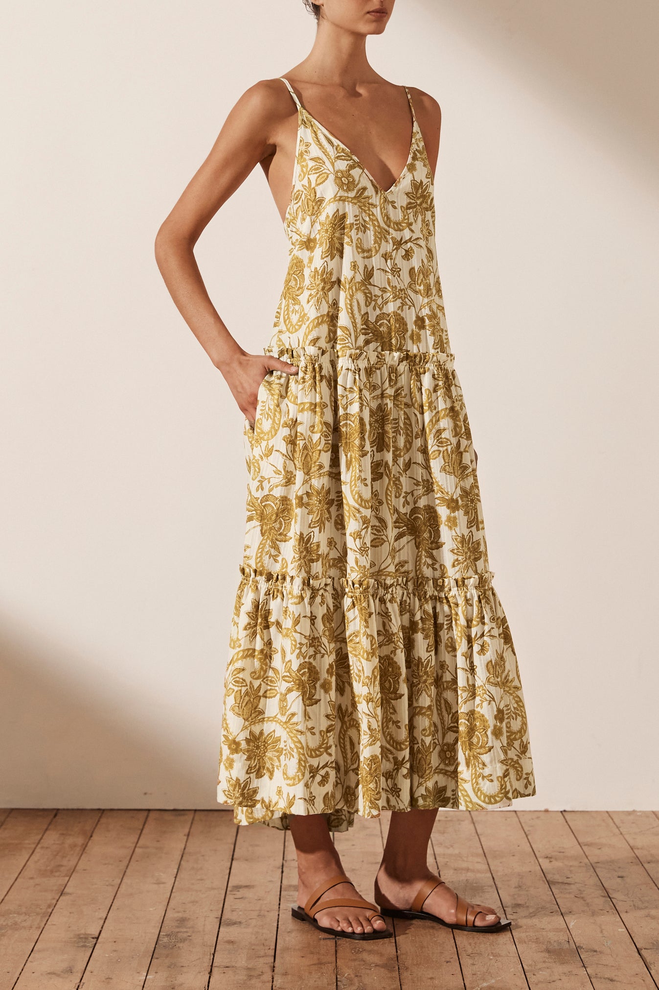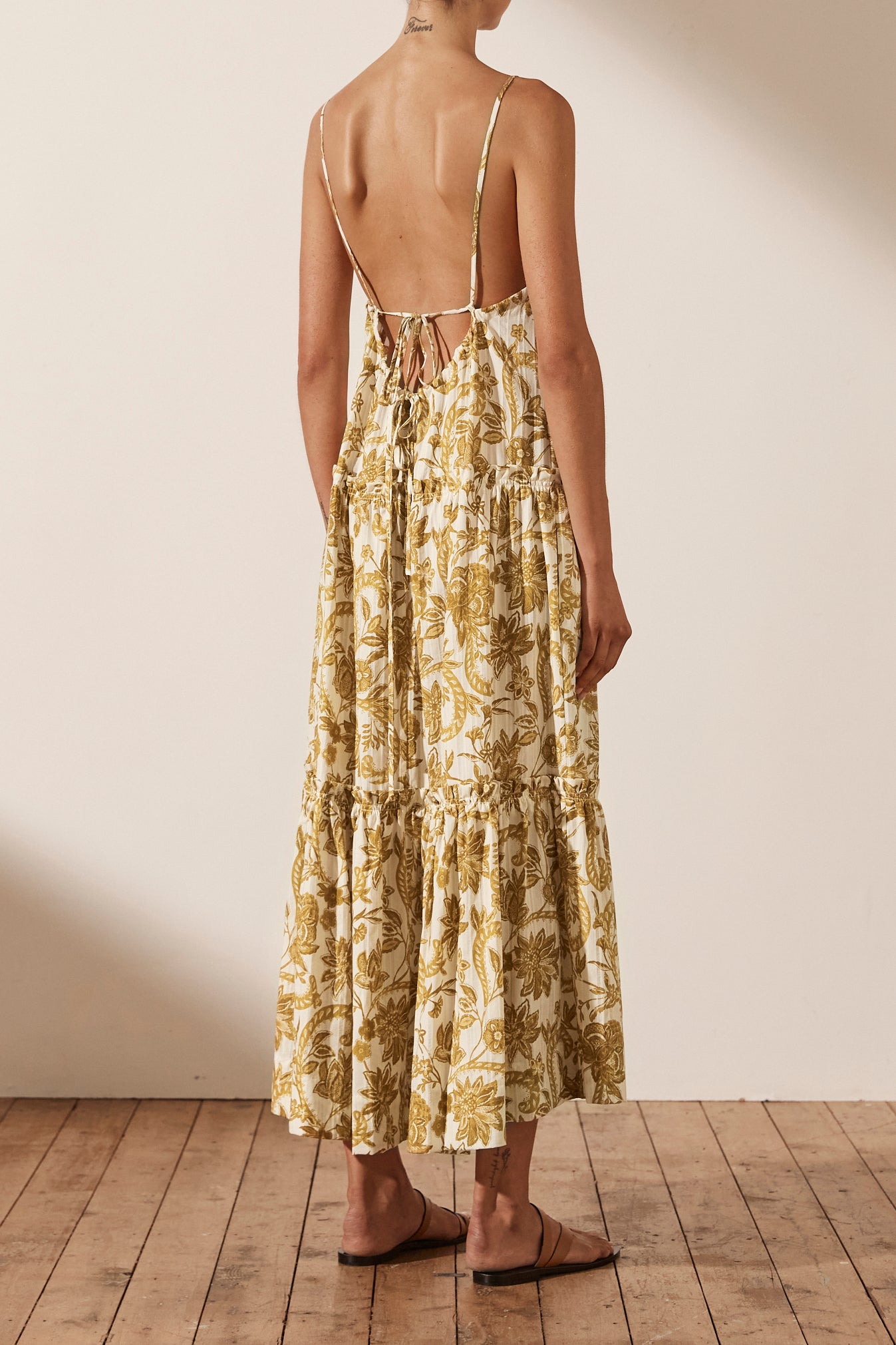 Plunged backless midi dress in the exclusive Saffron print in a self stripe cotton. Premium self-stripe cotton Exclusive Saffron print V neckline Low back with adjustable tie Side pockets Tiered midi skirt with frill detail Medium weight, non-stretchy...Read more