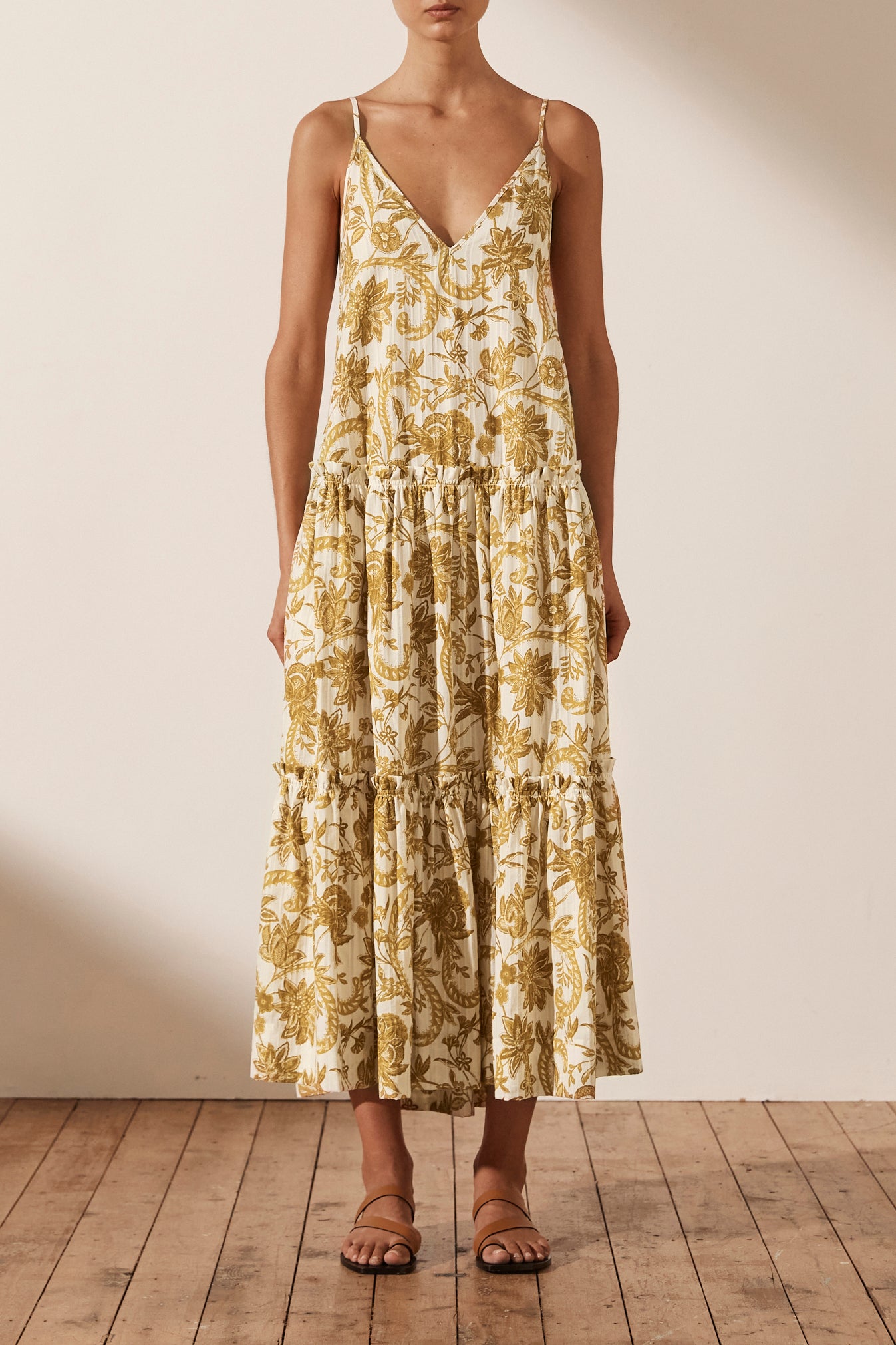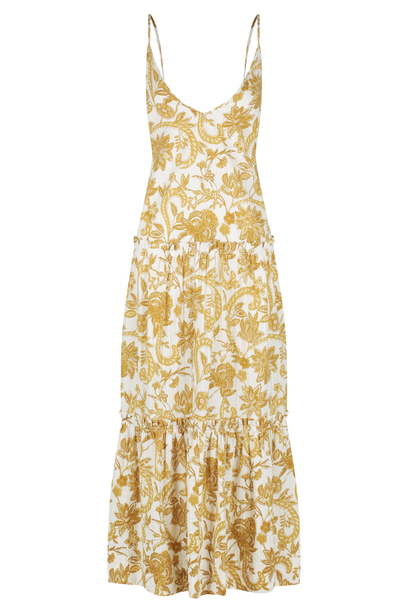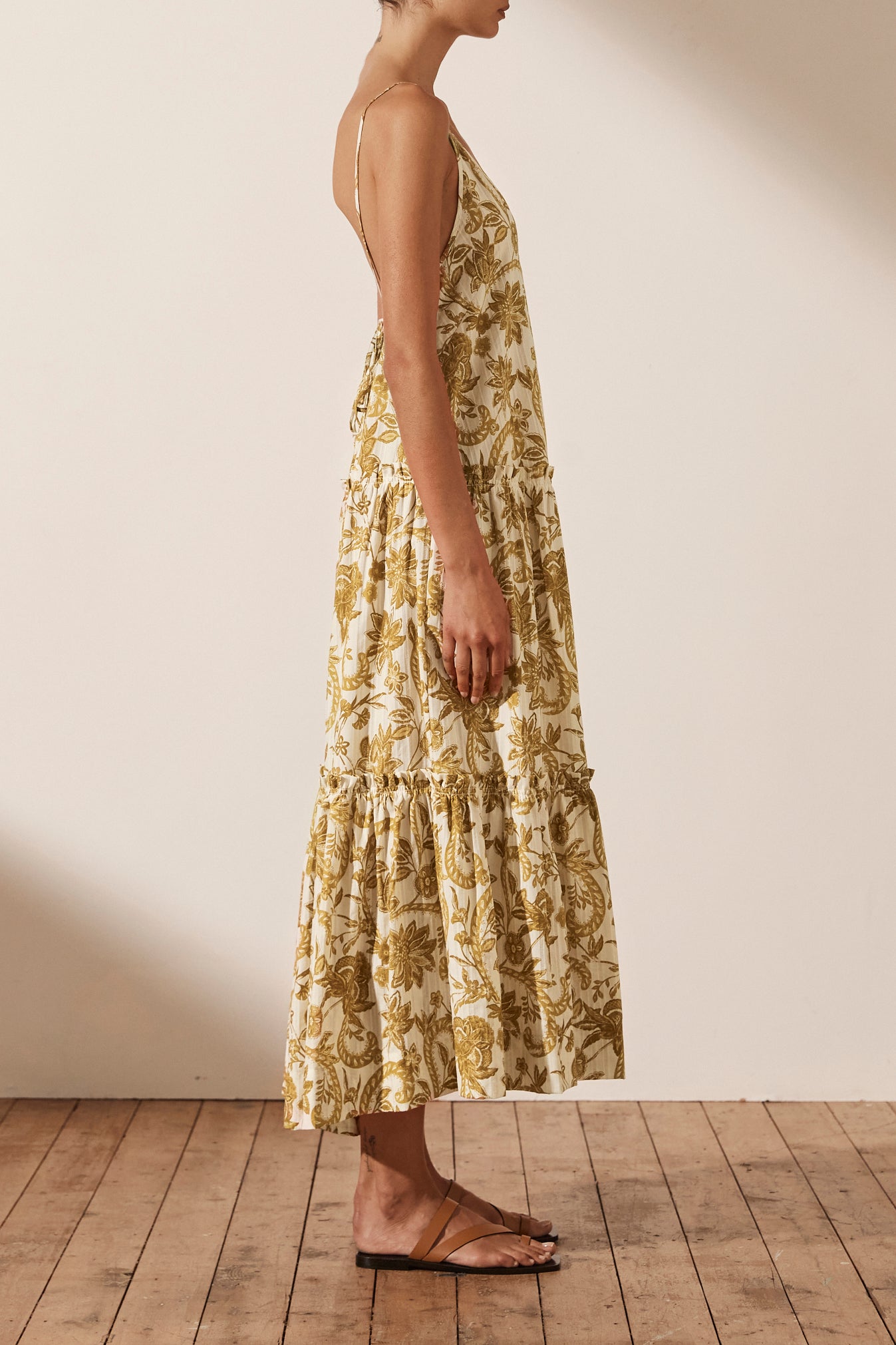 Plunged backless midi dress in the exclusive Saffron print in a self stripe cotton. Premium self-stripe cotton Exclusive Saffron print V neckline Low back with adjustable tie Side pockets Tiered midi skirt with frill detail Medium weight, non-stretchy...Read more