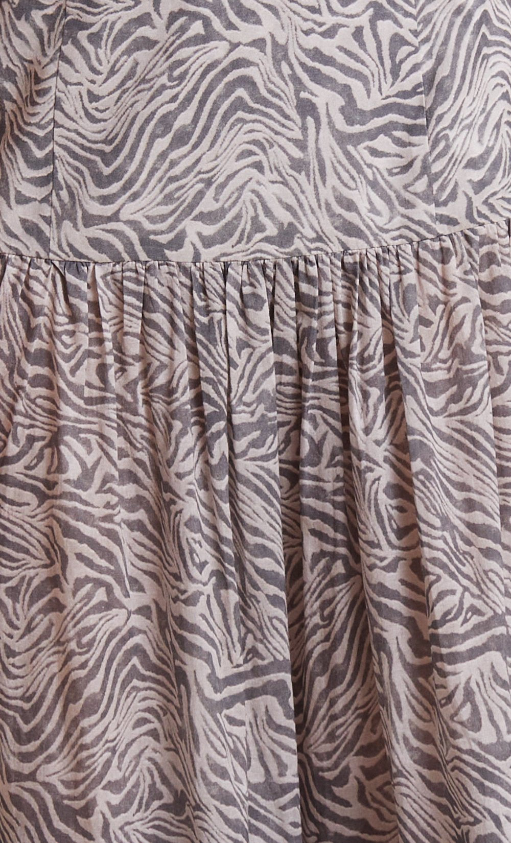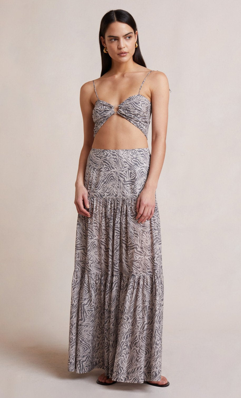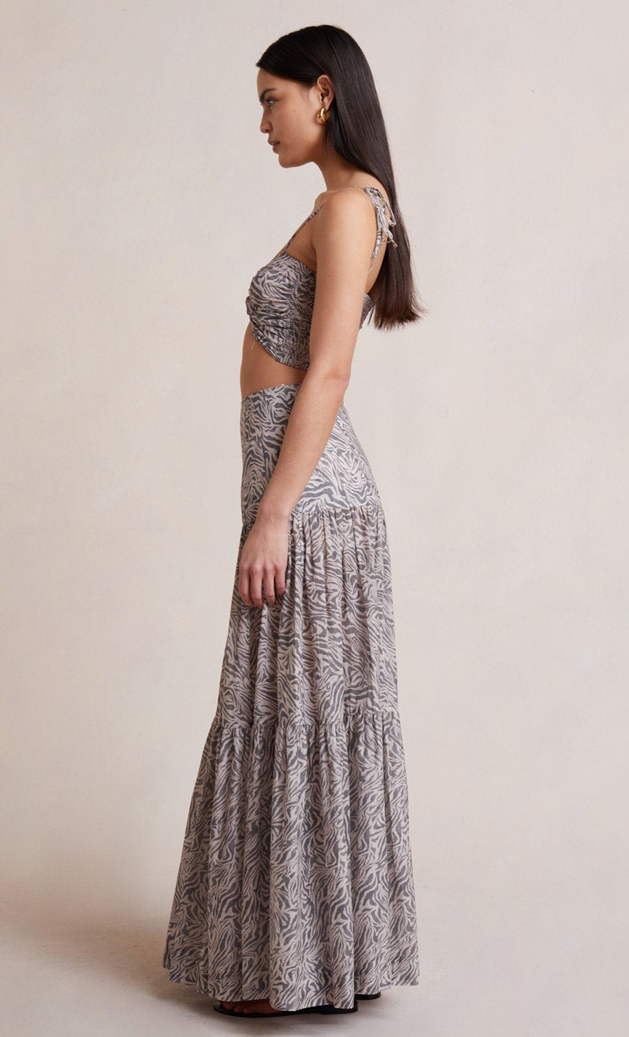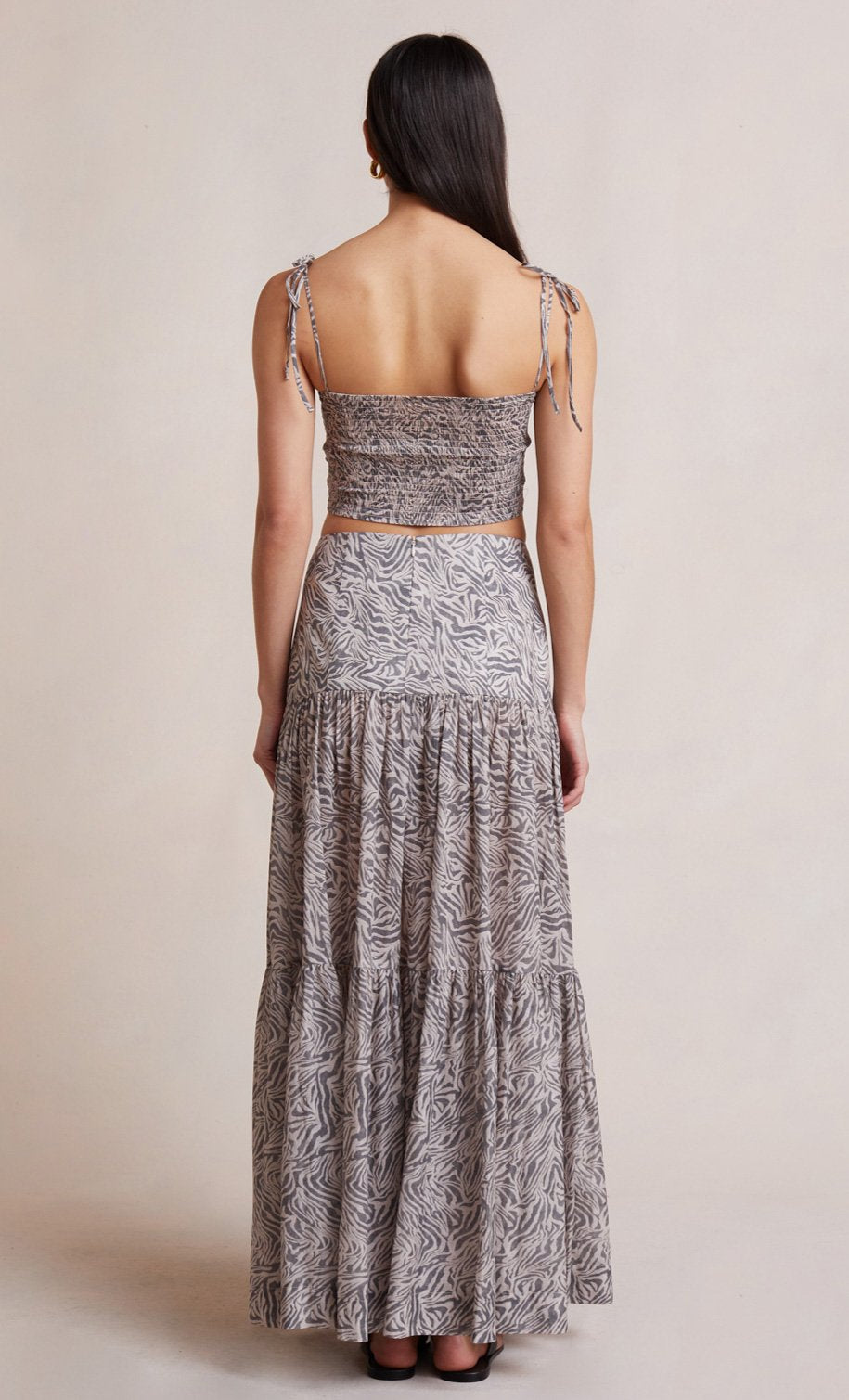The Sahara Maxi Skirt is a high waisted style cut from a signature zebra print cotton fabric. The maxi skirt has a A-line silhouette that is fitted at the high waist and then flows into a tiered gathered skirt. Styled with our Sahara Crop Top.