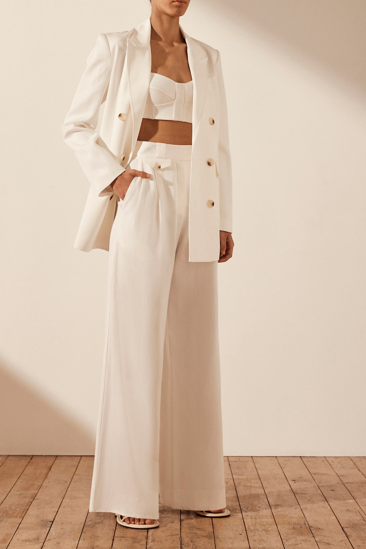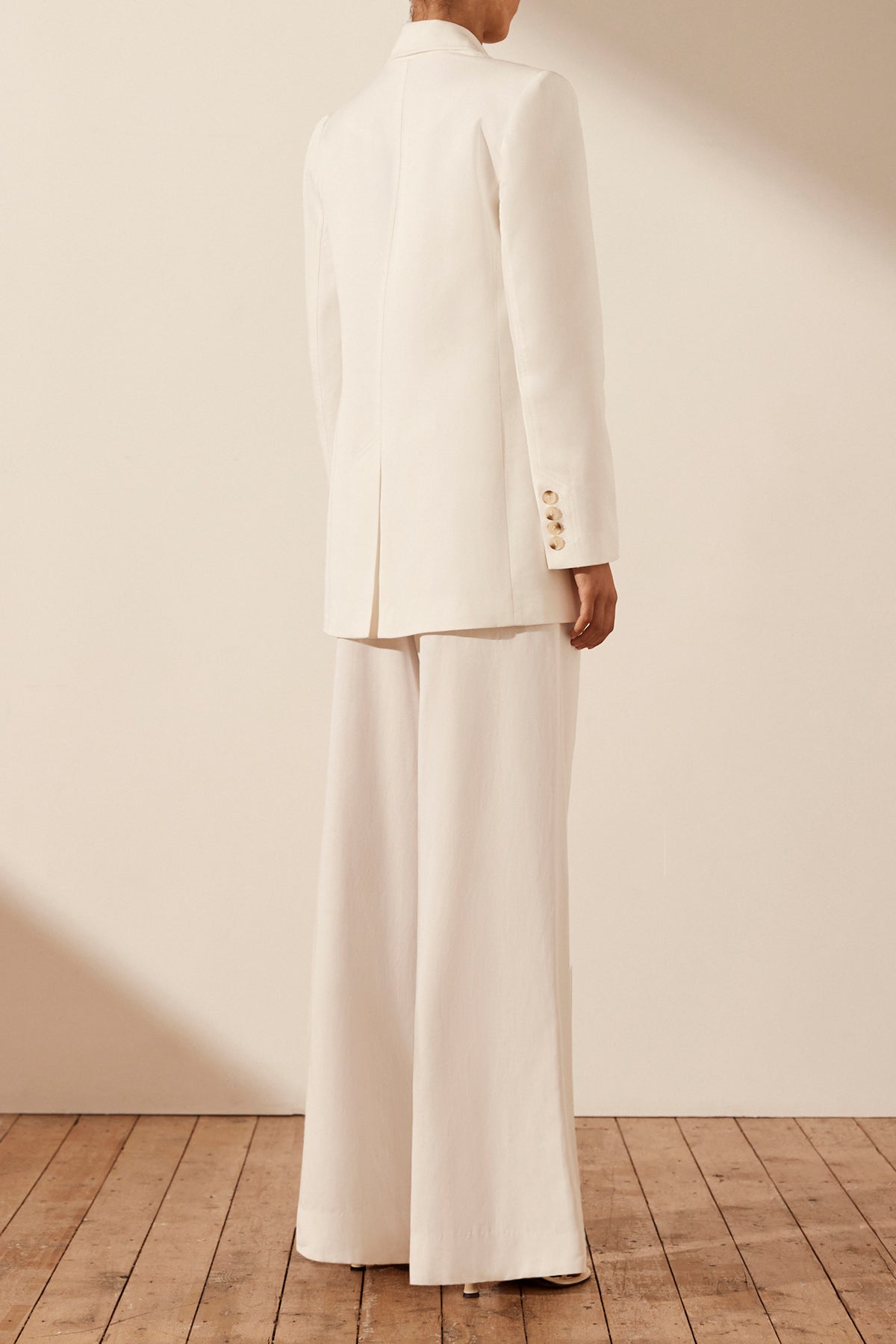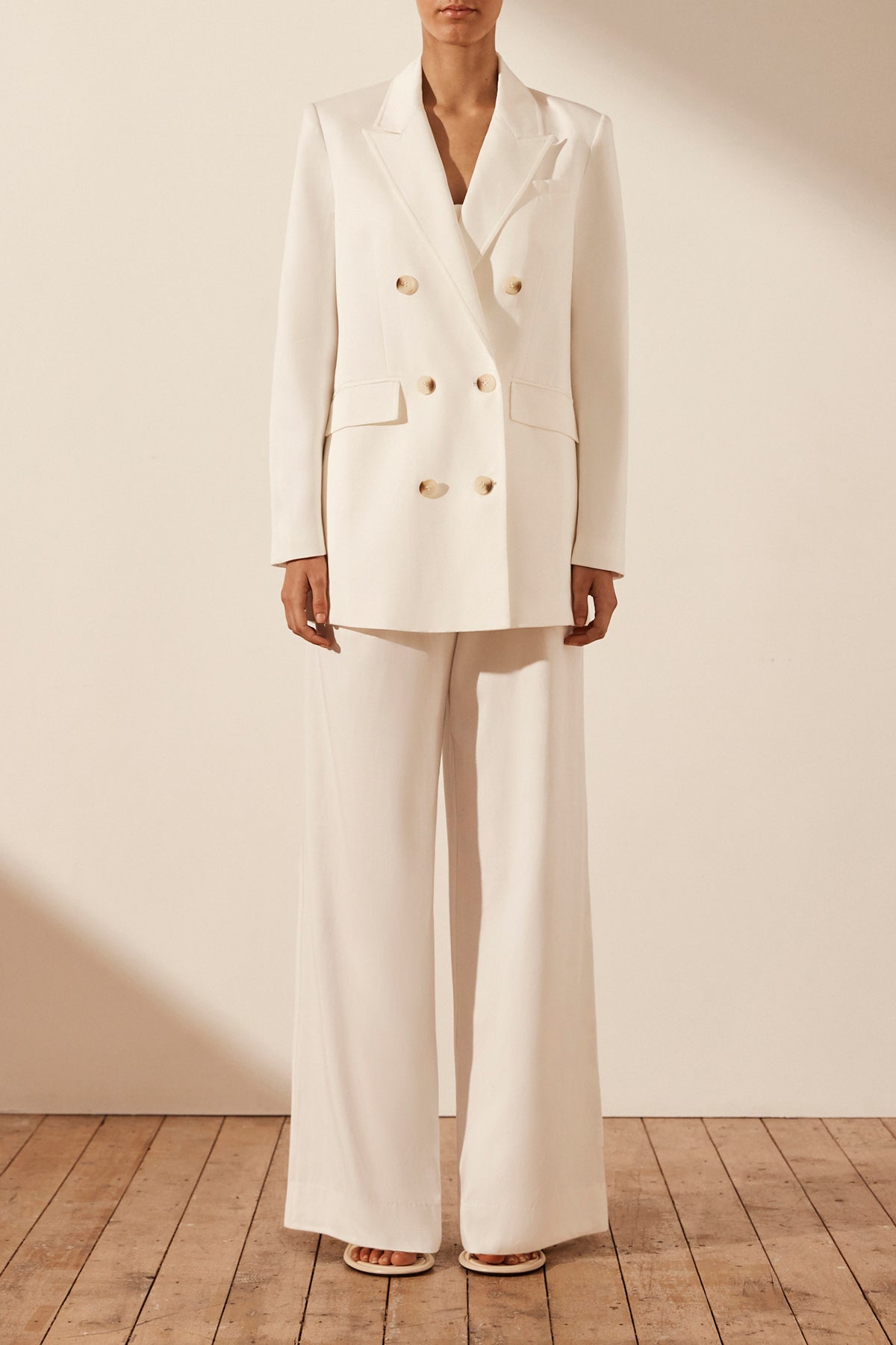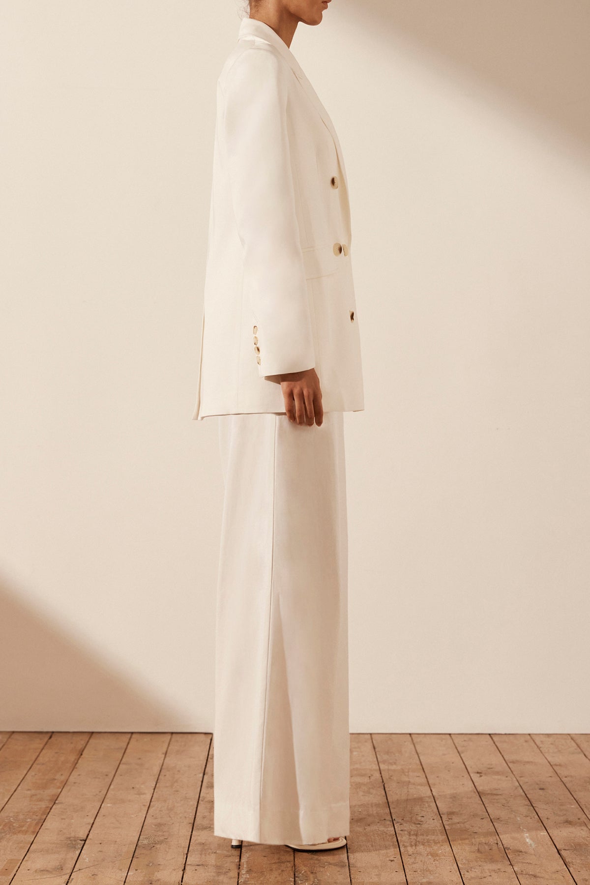 SARA PEAK LAPEL BLAZER - COCONUT Double breasted tailored blazer in a TENCEL™ blend. Style number: 231031 Peak lapel Padded shoulders Button detailing at sleeve cuff Double button closure Chest and front welt pockets with flaps Single...Read more