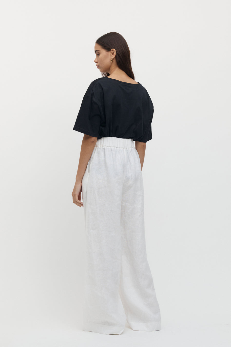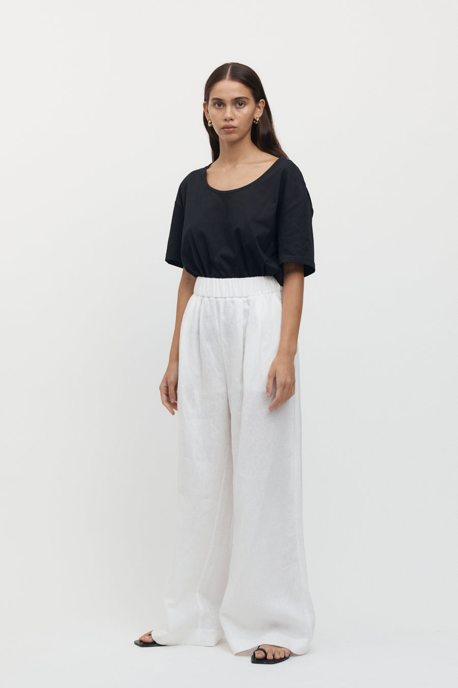 A 100% linen pant designed in a relaxed fit featuring a full wide leg and elastic waistband.
