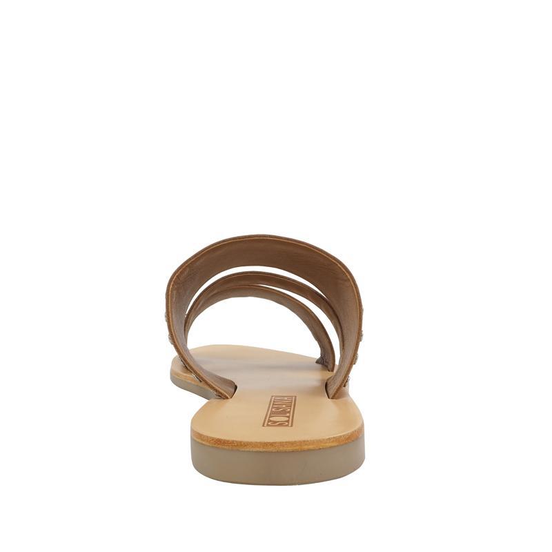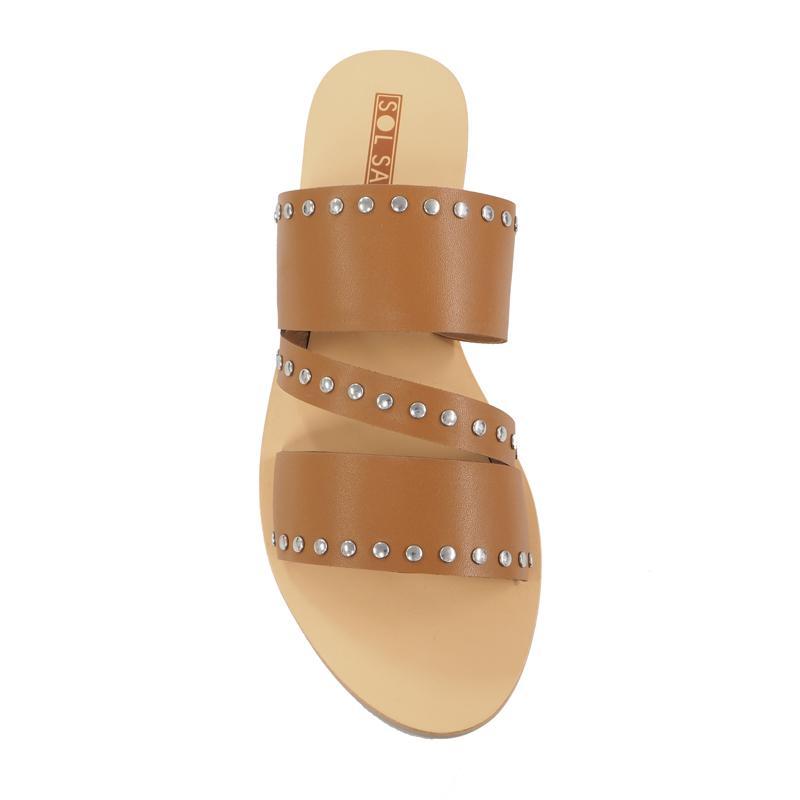 The tan Betty slide features two thick straps with a thin diagonal centre strip bordered with signature Sol Sana edgy silver studs. The classic rounded toe shape will make this your go-to slide when you need to elevate...Read more