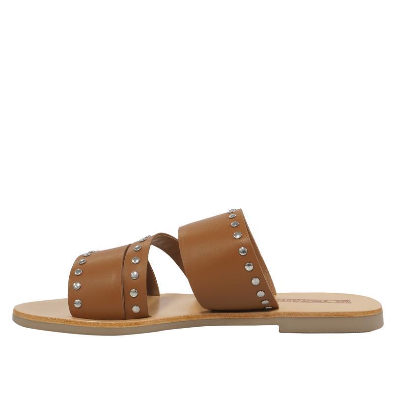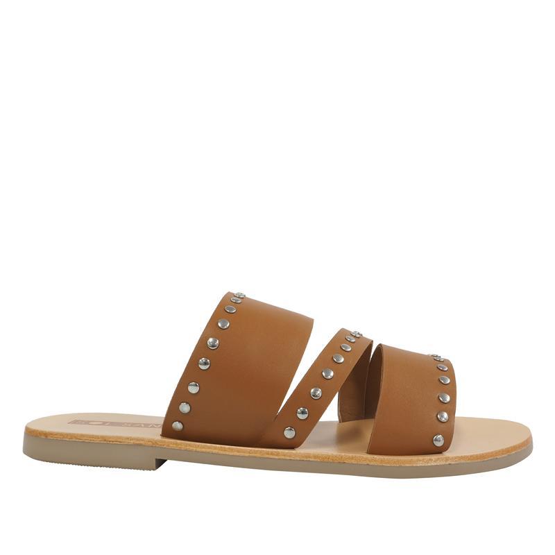 The tan Betty slide features two thick straps with a thin diagonal centre strip bordered with signature Sol Sana edgy silver studs. The classic rounded toe shape will make this your go-to slide when you need to elevate your everyday.