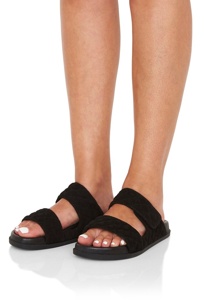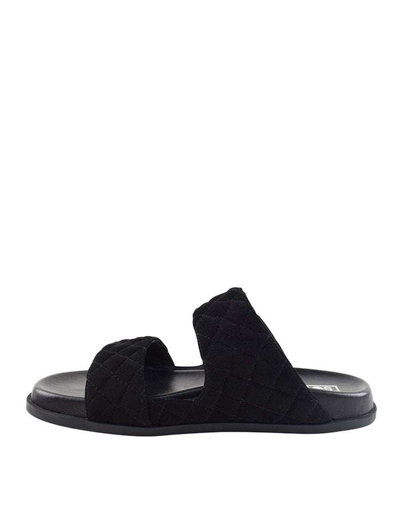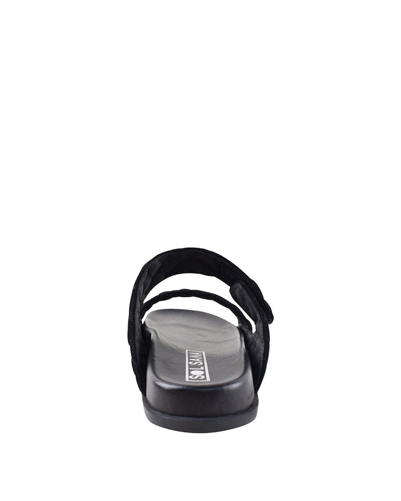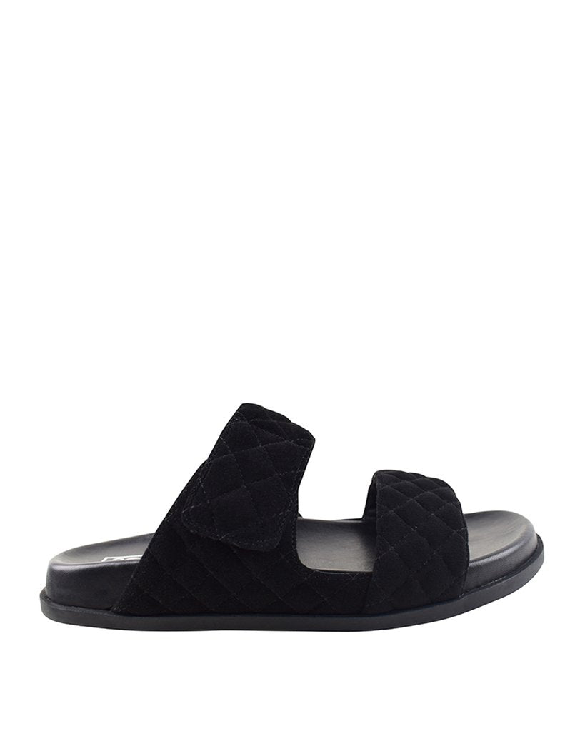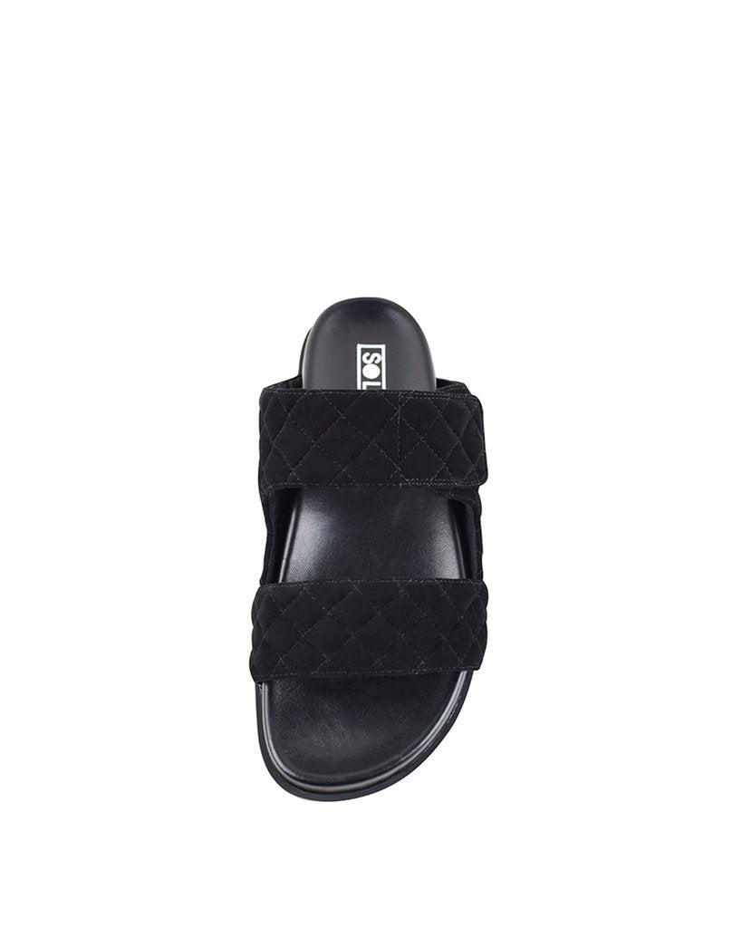 The Nate wedge by Sol Sana plays perfectly into the latest dad sandal trend with a deep foot bed and two thick straps that snugly wrap the top of the foot. Finished in a rich black suede wih prominent quilted top stitching and a rounded, slightly upturned toe. 100% Suede upper 100% leather lining Cushioned foot bed EVA/Rubber Sole