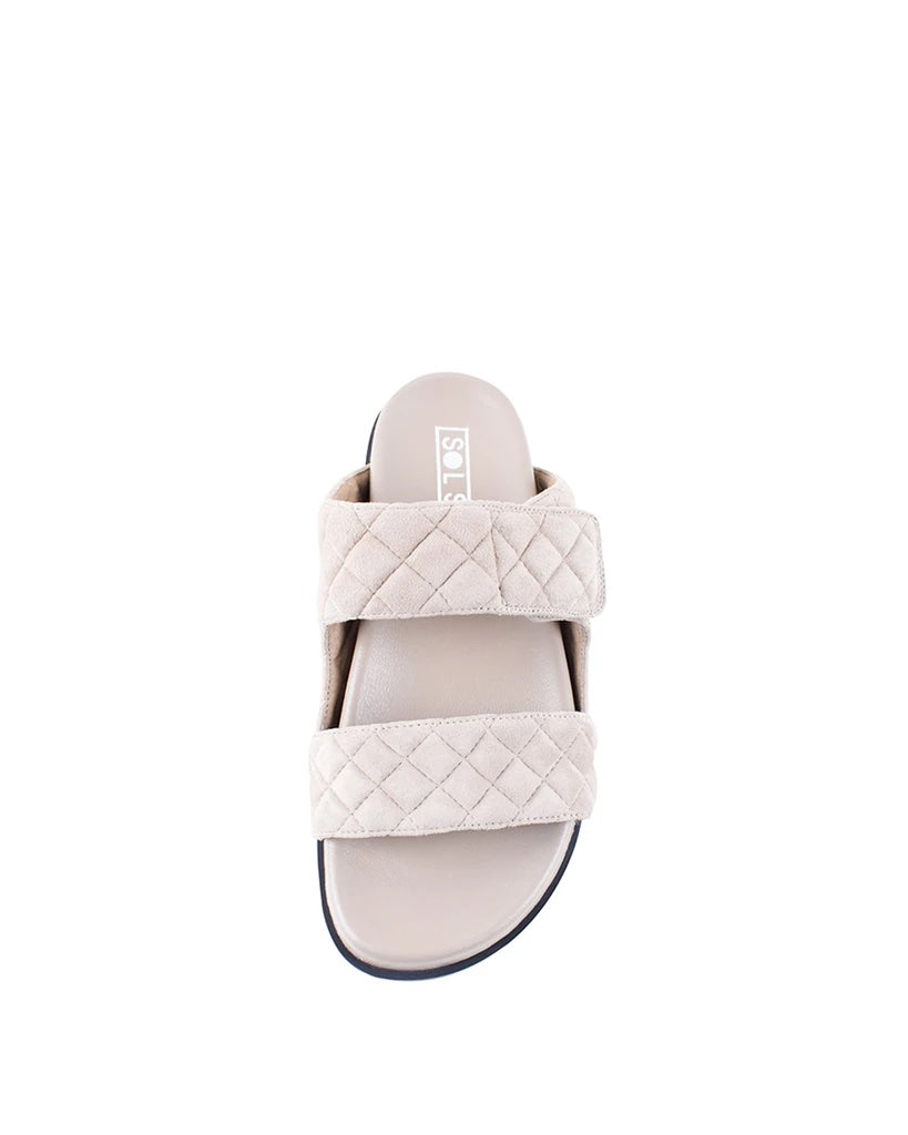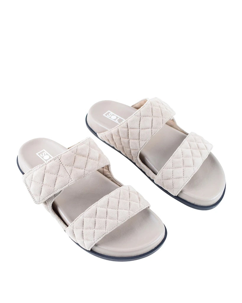 The Nate wedge by Sol Sana plays perfectly into the latest dad sandal trend with a deep foot bed and two thick straps that snugly wrap the top of the foot. Finished in a rich taupe suede with prominent quilted top stitching and a rounded, slightly upturned toe.