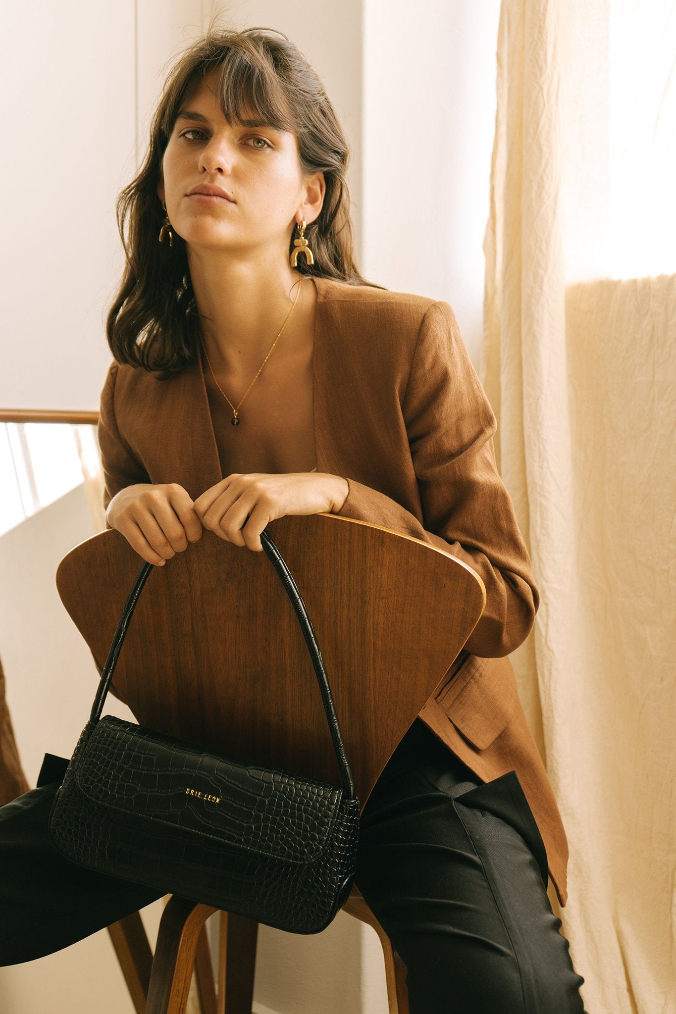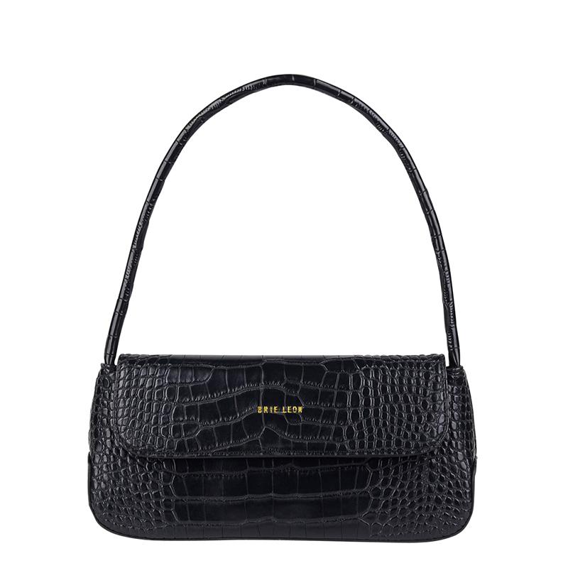 90's inspired, medium sized shoulder bag with structured handle | Matte Black Croc embossed PU | Flap with magnetic closure | Black fabric lining | Two internal pockets, one with a zip and Brie Leon branding PU tag | Bag measures 14 x 28.5 x 7.3 cm | Strap Measures 55 cm