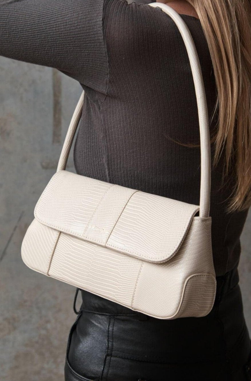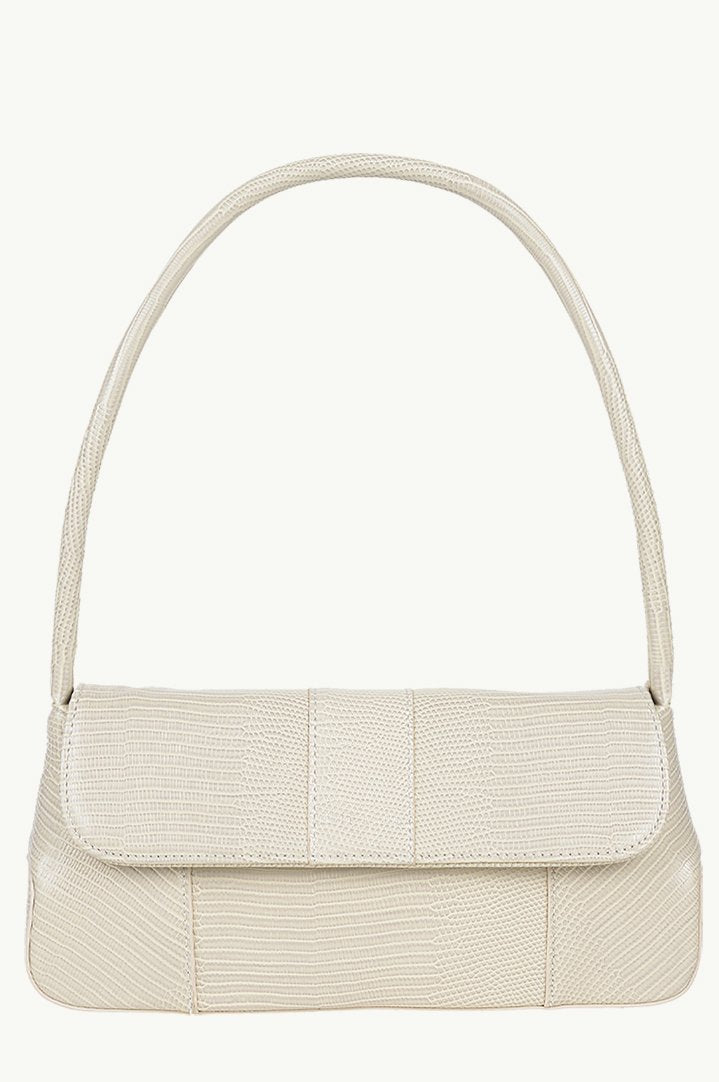 A 90's inspired, medium sized shoulder bag with a structured handle.