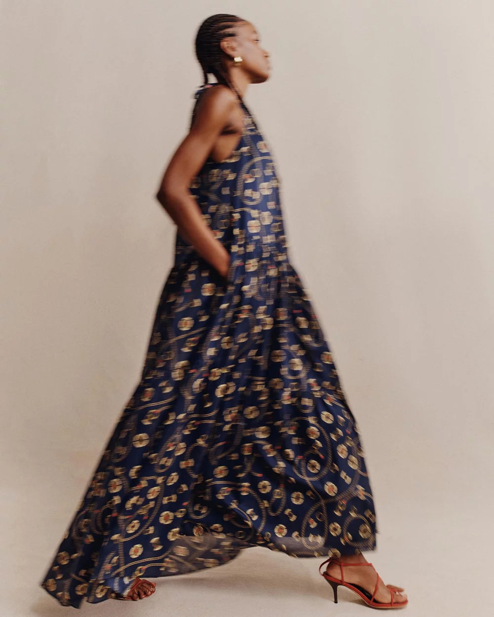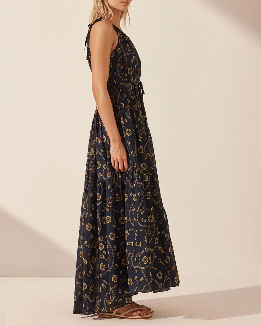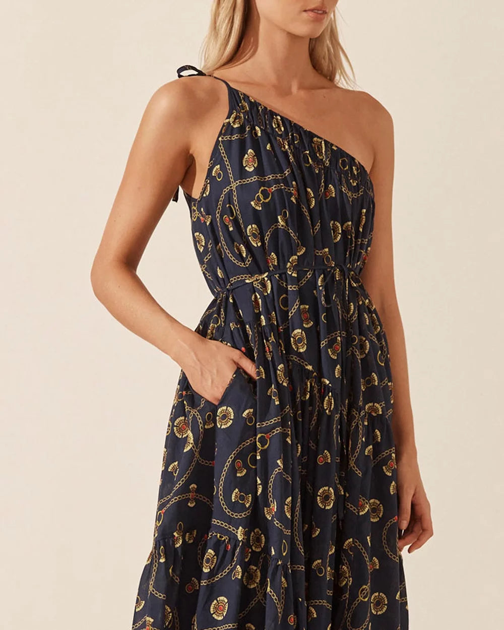 One shoulder tiered maxi dress in the exclusive Vacance print in a light weight GOTS certified organic cotton voile.
