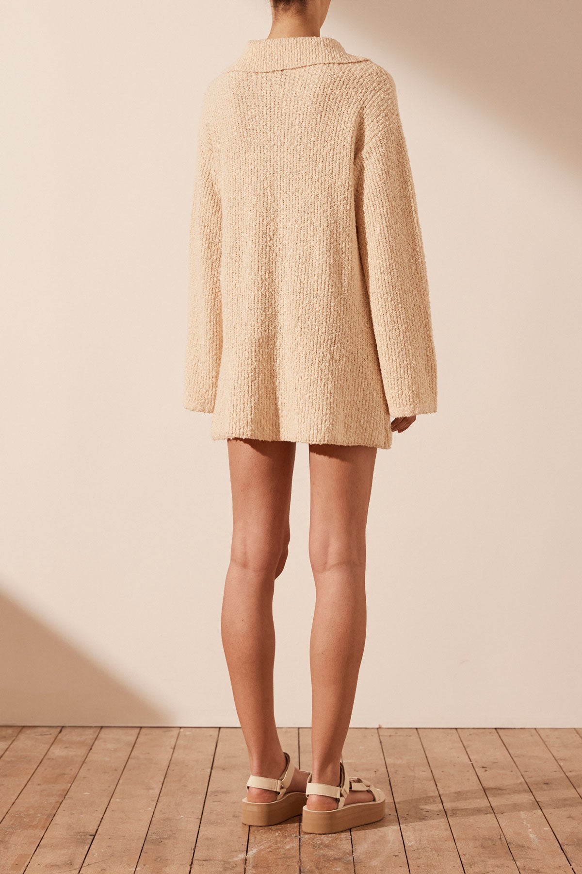 Style number: 01233184 Textured boucle knit V neckline Wide collar Flared sleeve Mini length skirt Medium weight, some stretch 75% Cotton 13% Polyester 12% Nylon Designed in Australia Made in China Our studio model wears a AU6/US2 Model’s...Read more