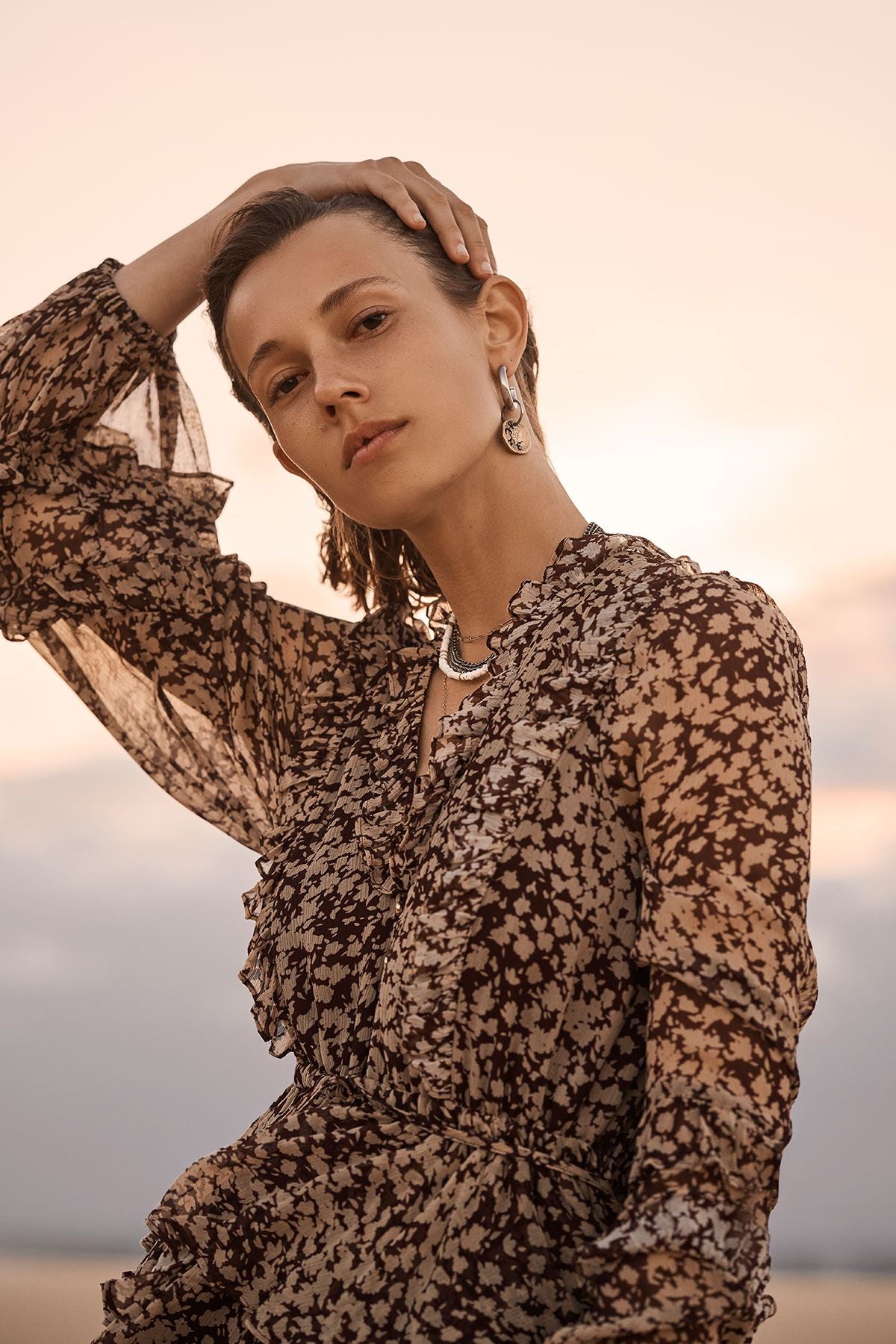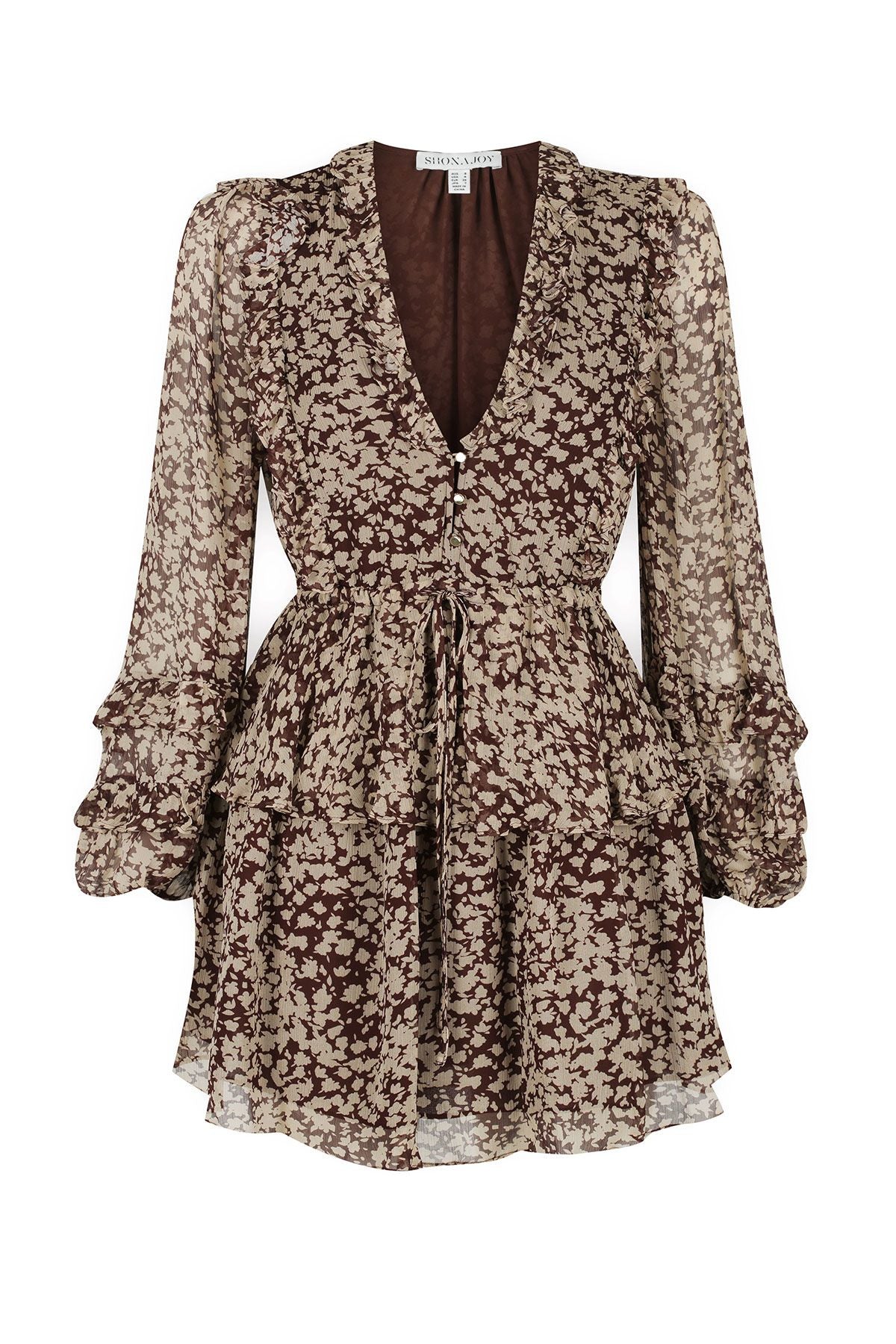 Drawstring mini dress in a light weight semi-sheer chiffon in the exclusive Valeria print.Semi-sheer chiffon Exclusive Valeria print Frill v-neckline Front button closure Balloon sleeves with elasticated cuffs Drawstring waist Layered ruffle mini length skirt Light weight, non...Read more