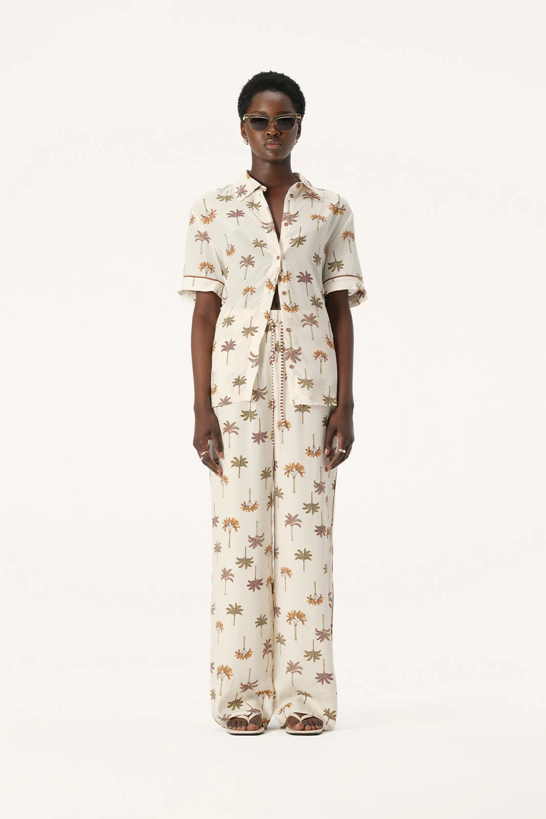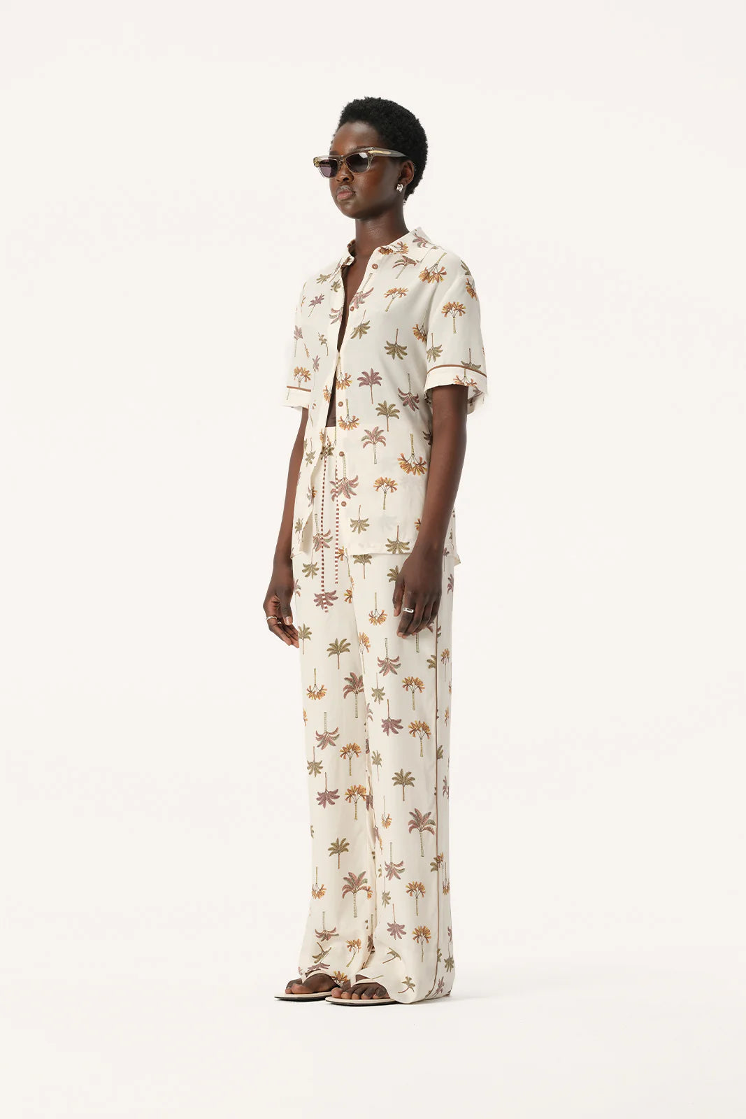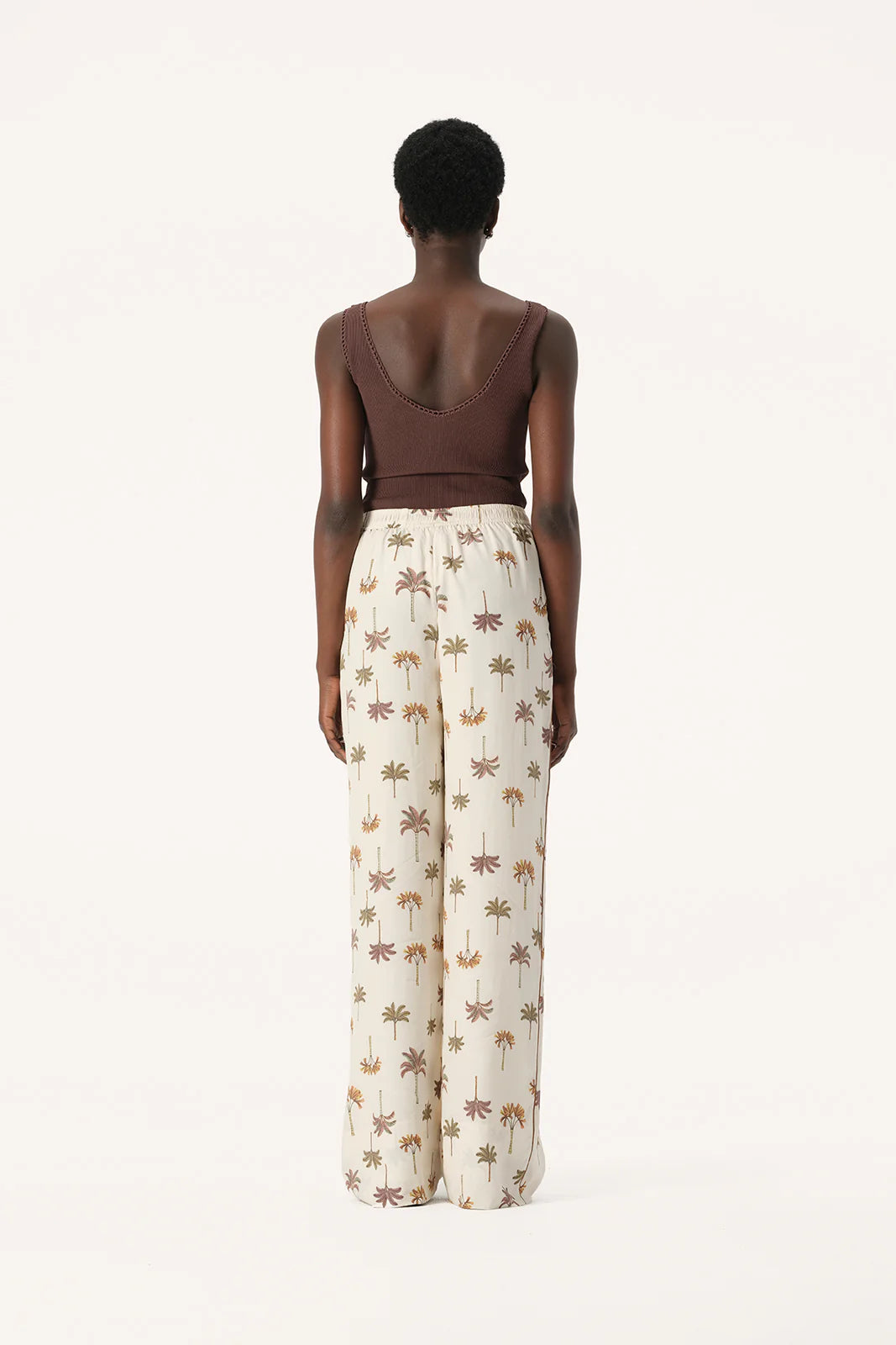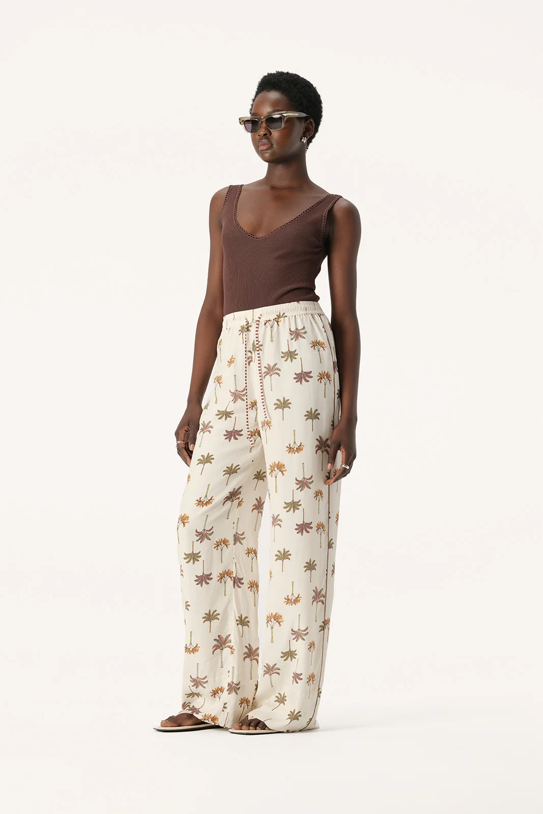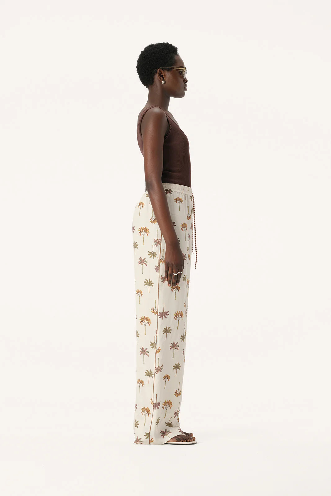 Effortless and comfortable styling for weekends at brunch or the beach, the Athena Pant will be a go-to piece for summer. Made from a soft viscose and silk blend fabric, the Athena Pant is ultra-lightweight and features our exclusive new palm tree print in a gorgeous neutral palette of ivory and tan brown, perfect for the season ahead. The Athena Pant has an elastic waistband with drawstring, side pockets, and a relaxed fit through the leg. Style with oversized tees and basics or match with our Athena Shirt.
