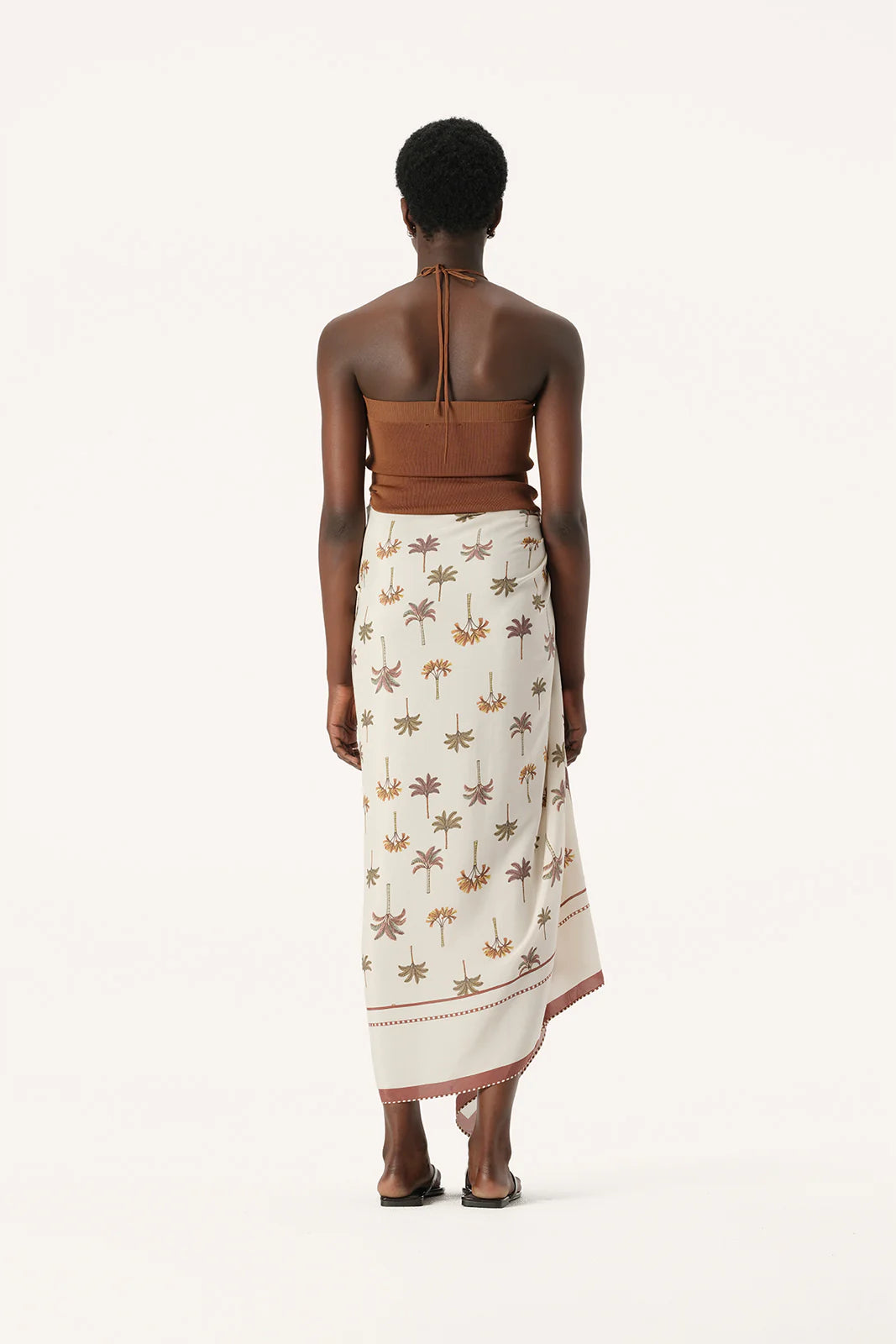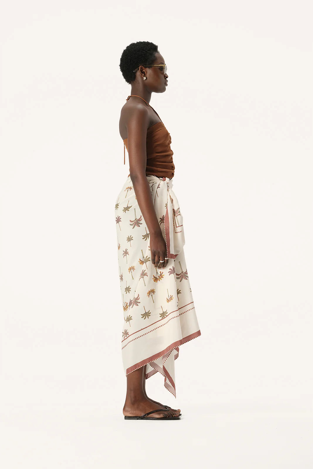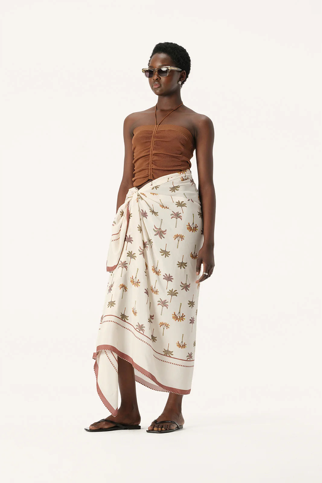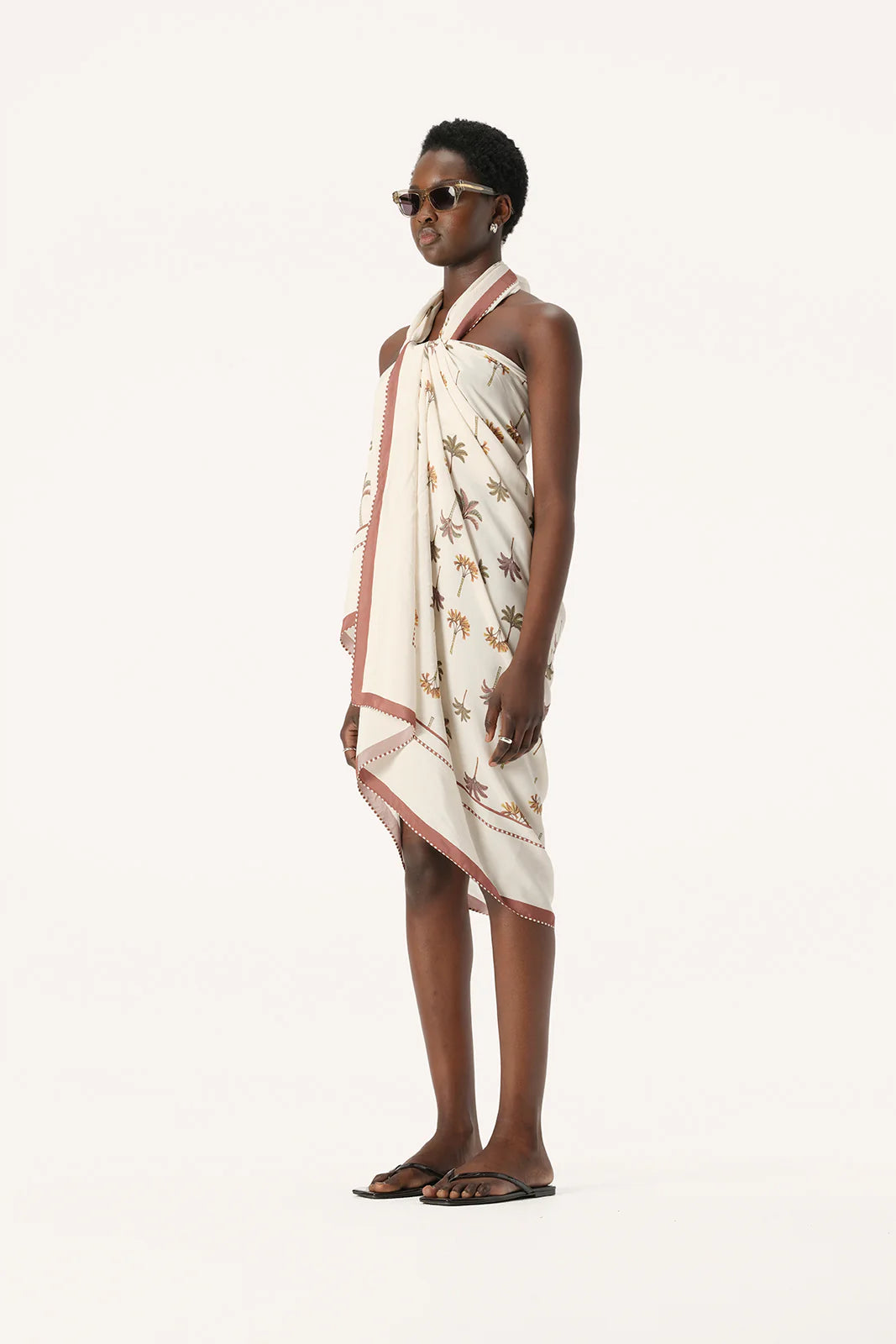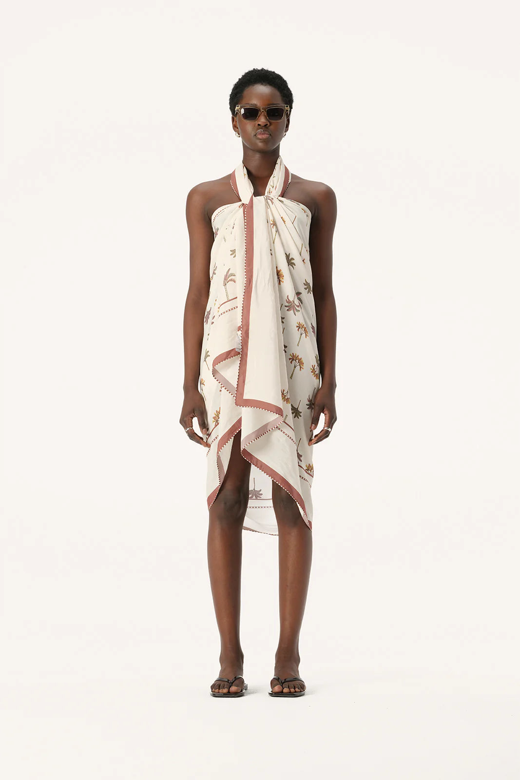 Effortless and comfortable styling for weekends at the beach, the Athena Sarong will be a go-to piece for wearing over your favourite swimwear. Made from a soft viscose and silk blend fabric, the Athena Sarong is ultra-lightweight and features our exclusive new palm tree print with a contrast border in a gorgeous neutral colour palette of ivory and tan brown, perfect for the season ahead. This piece is dry clean only.