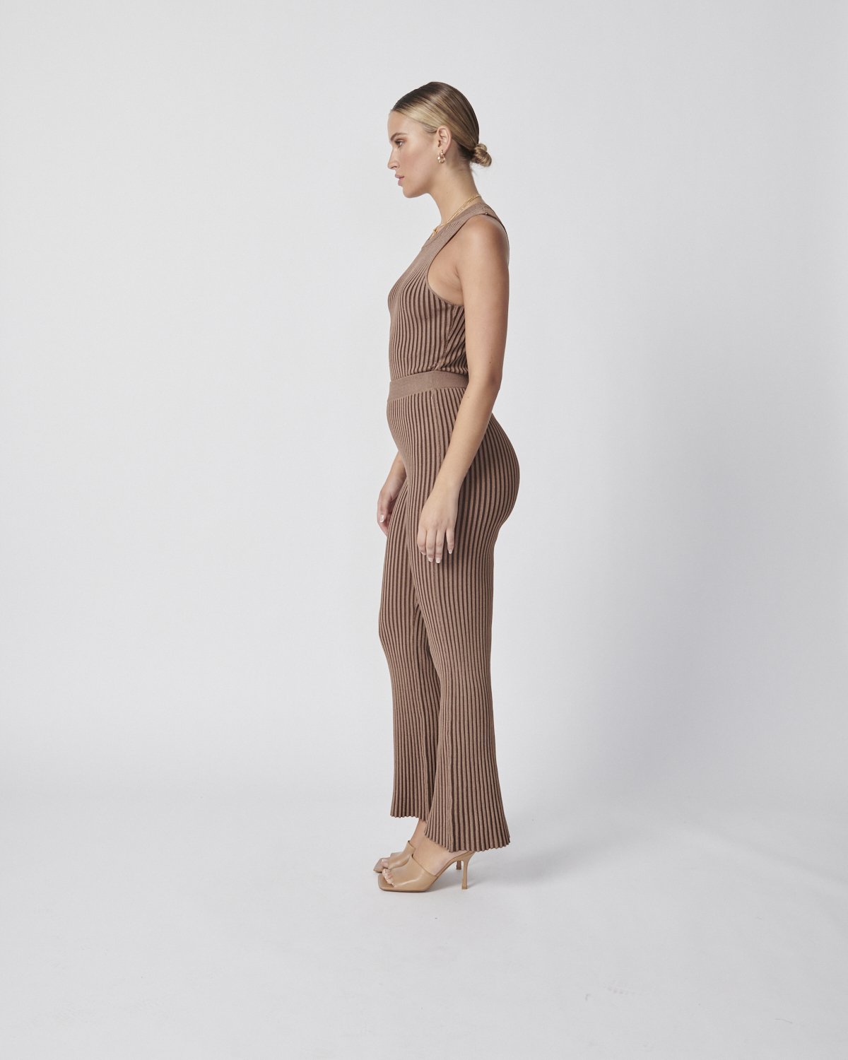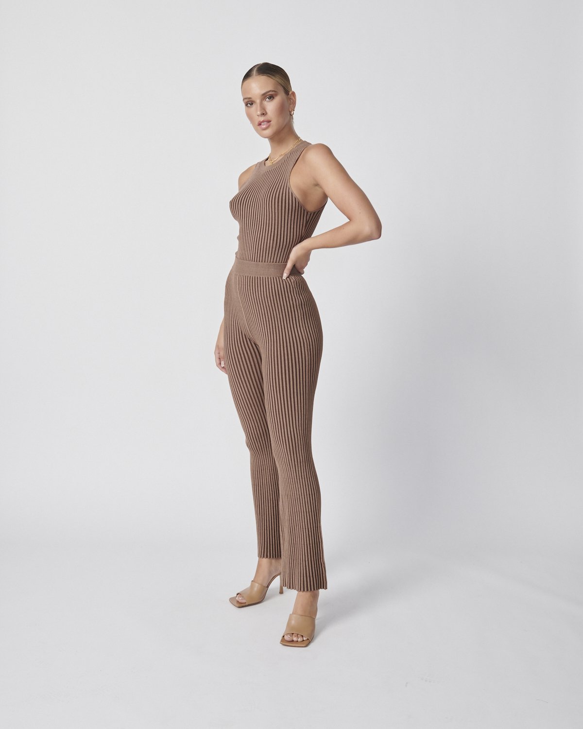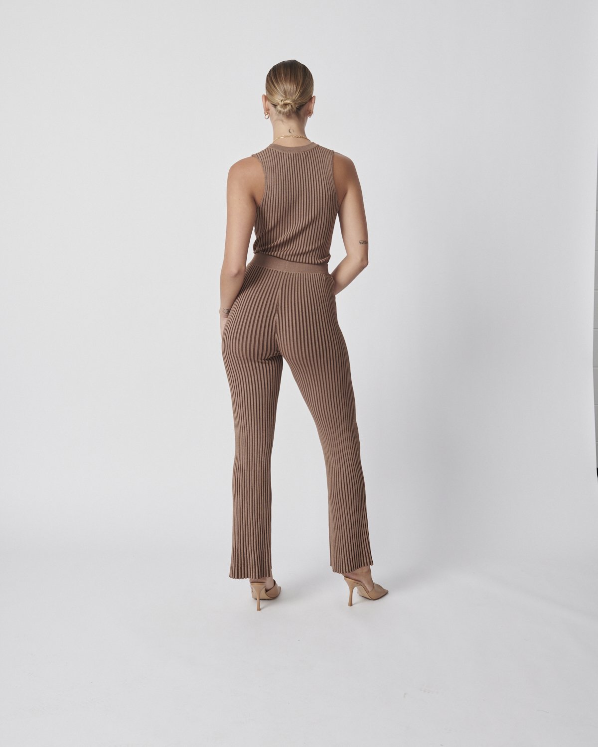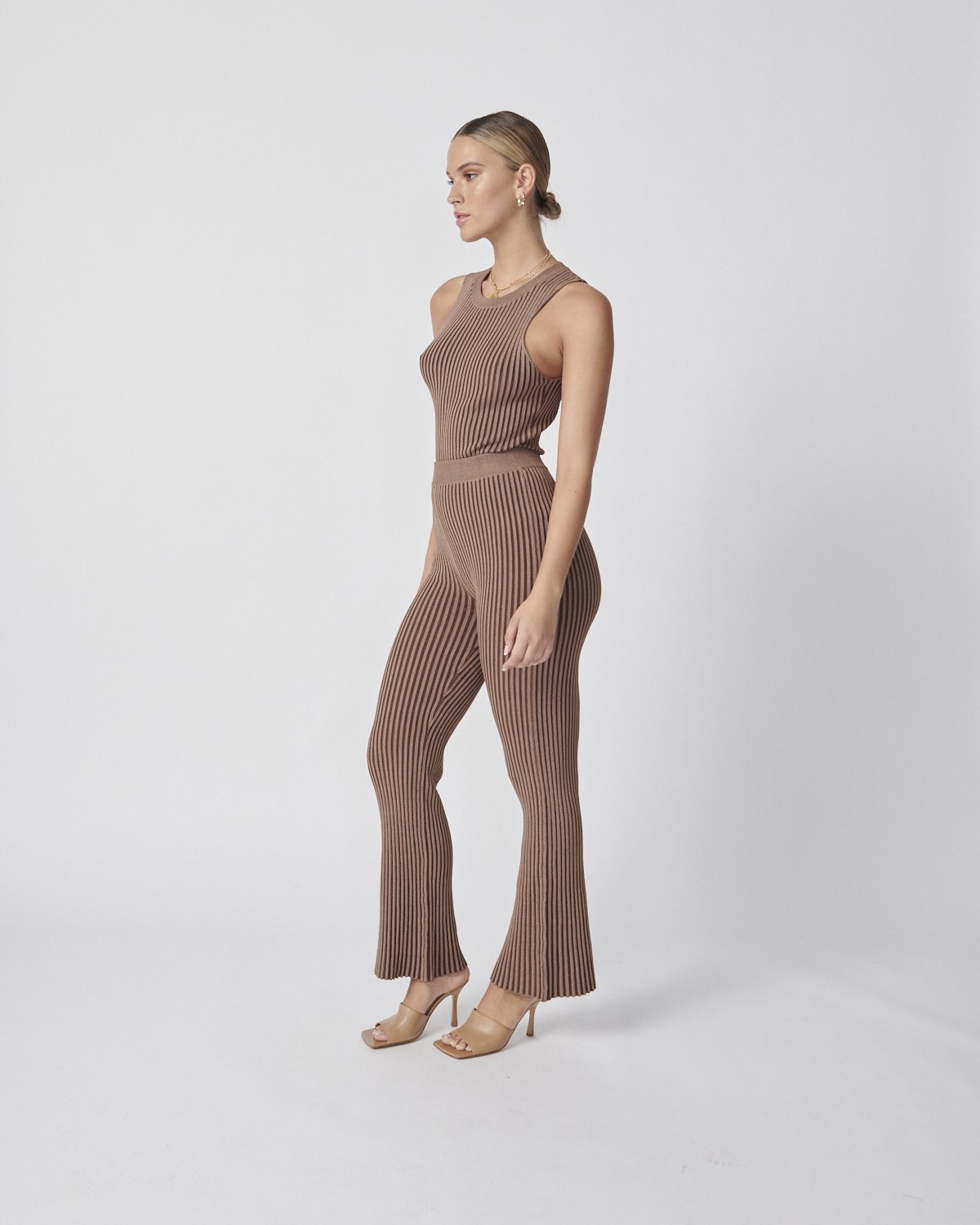 The Contrast Knit Pant features contrast knit thread detailing to create a tonal stripe, flare style leg and wear high waisted. Style this piece with the contrast knit tank or long sleeve top as a set with our matching knit top.
