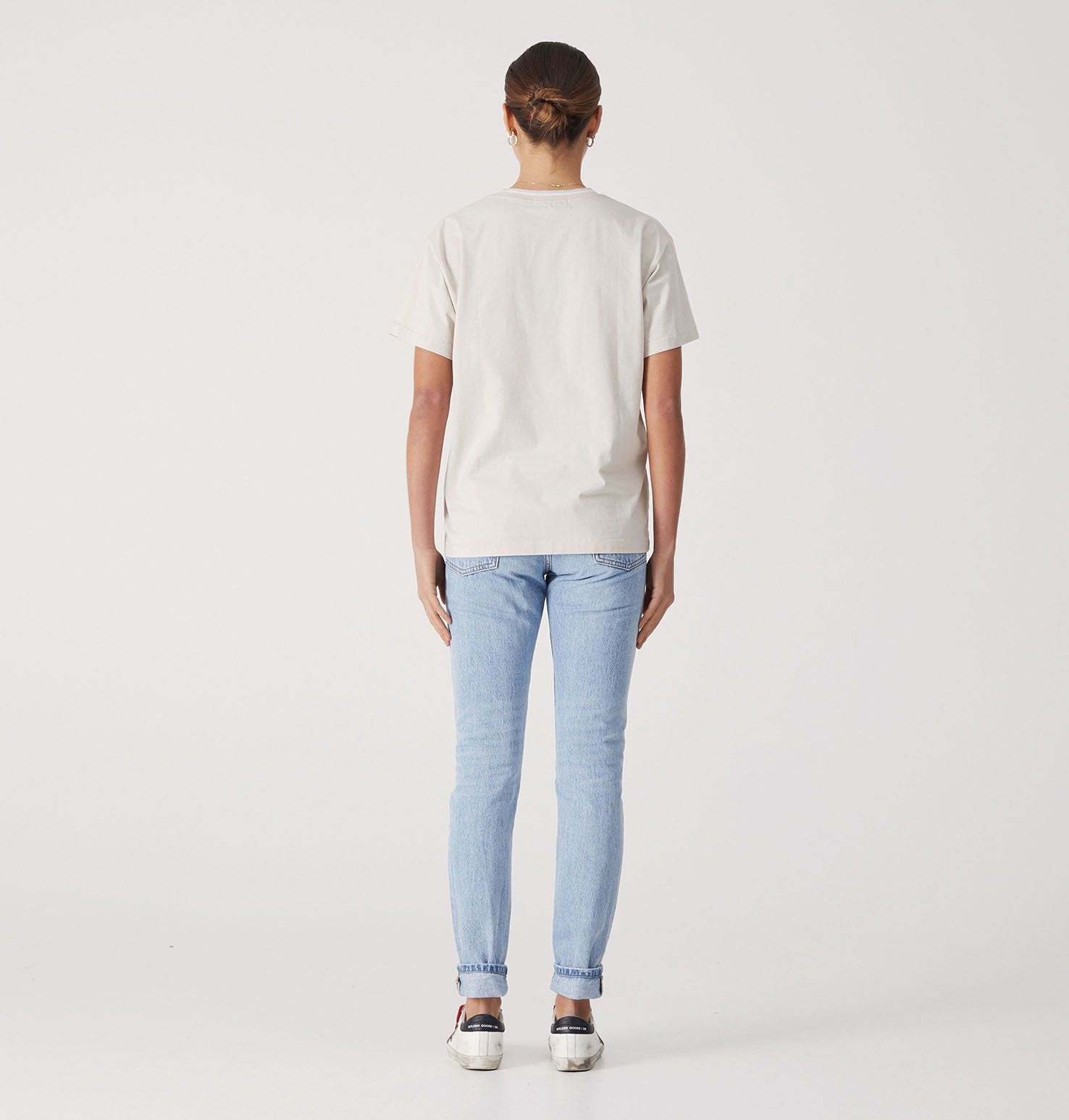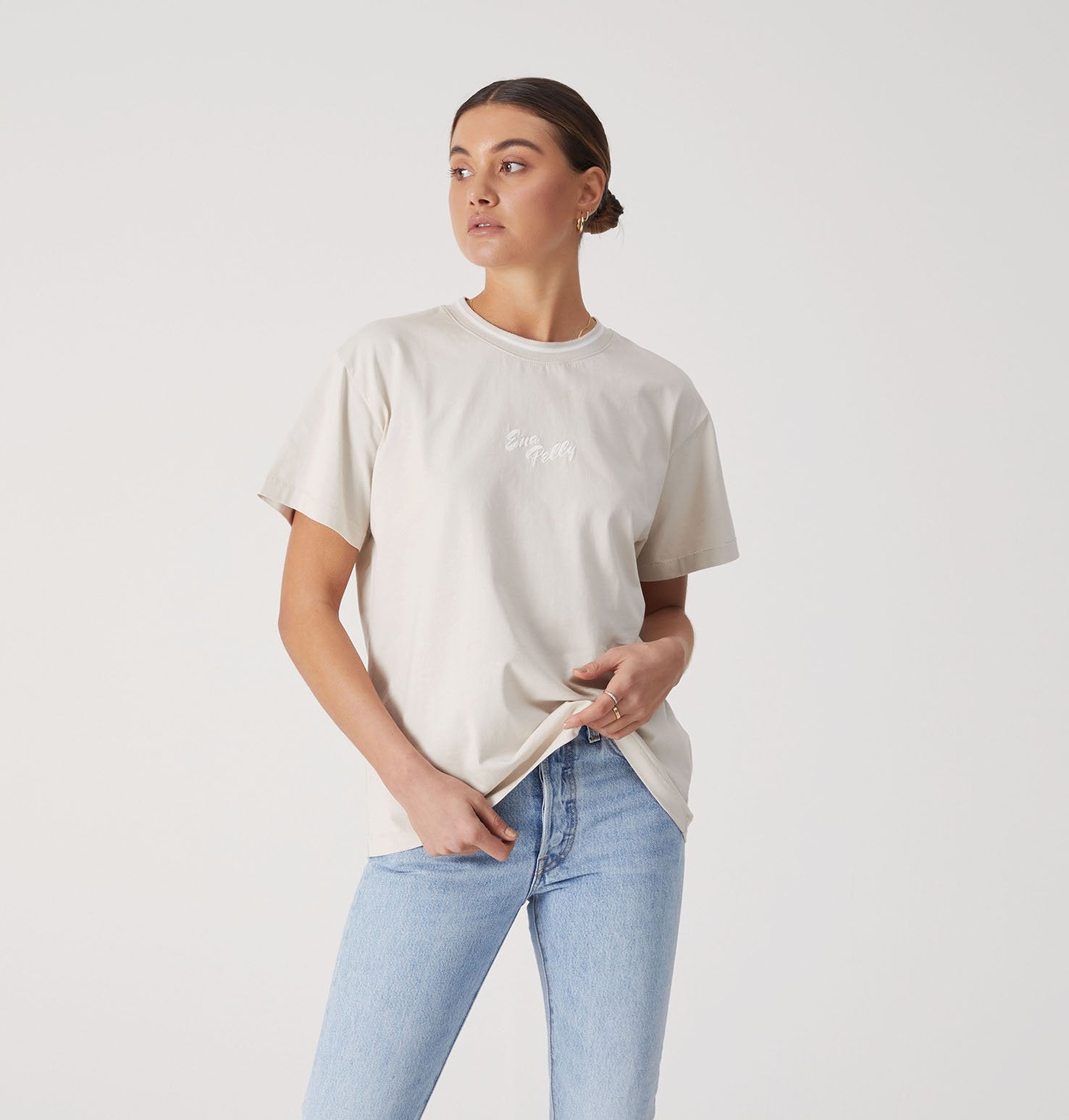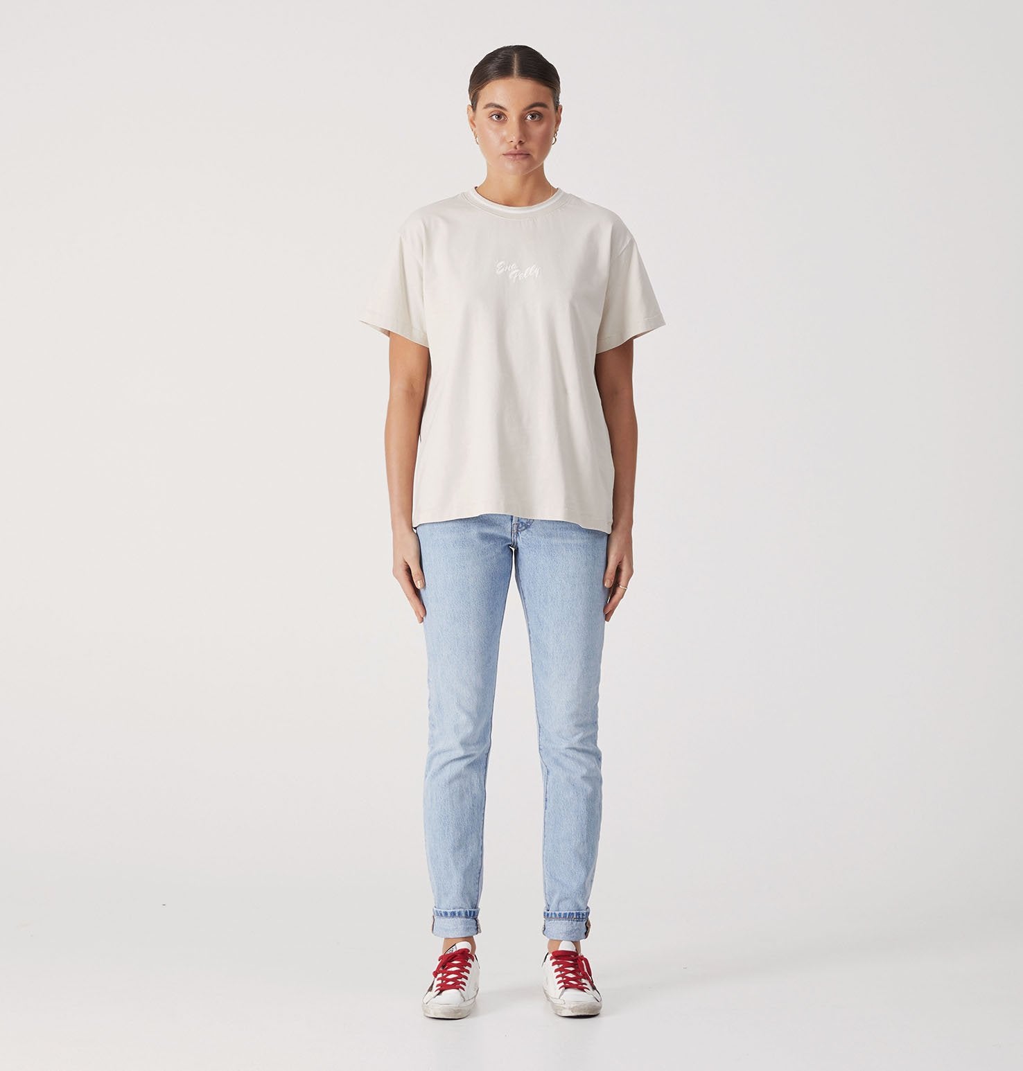 The oversized block tee silhouette is cut in a mid-weight cotton jersey with a ribbed sporty neckline and twin needle topstitched finishing. We recommend your true size as this is an oversized fit.