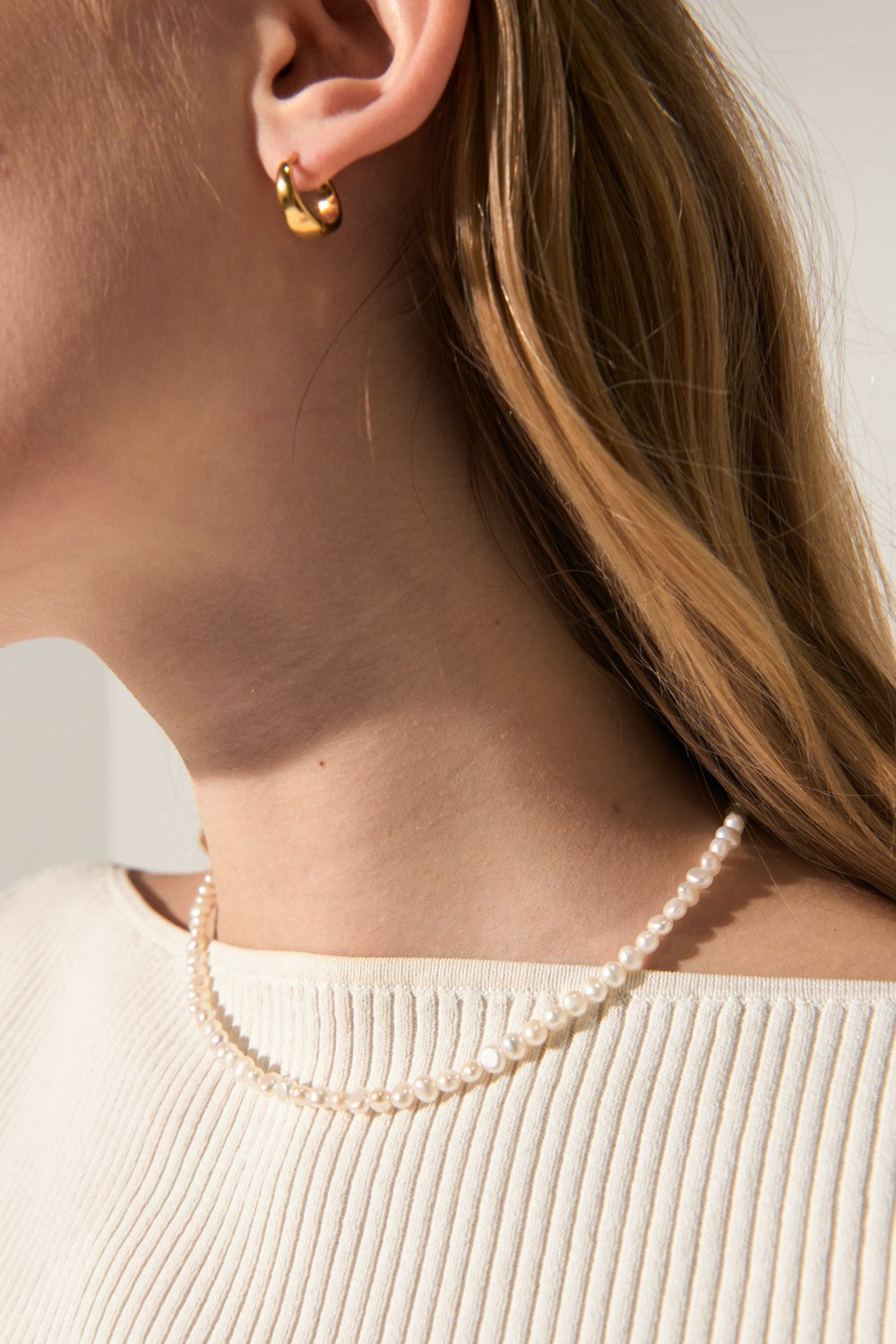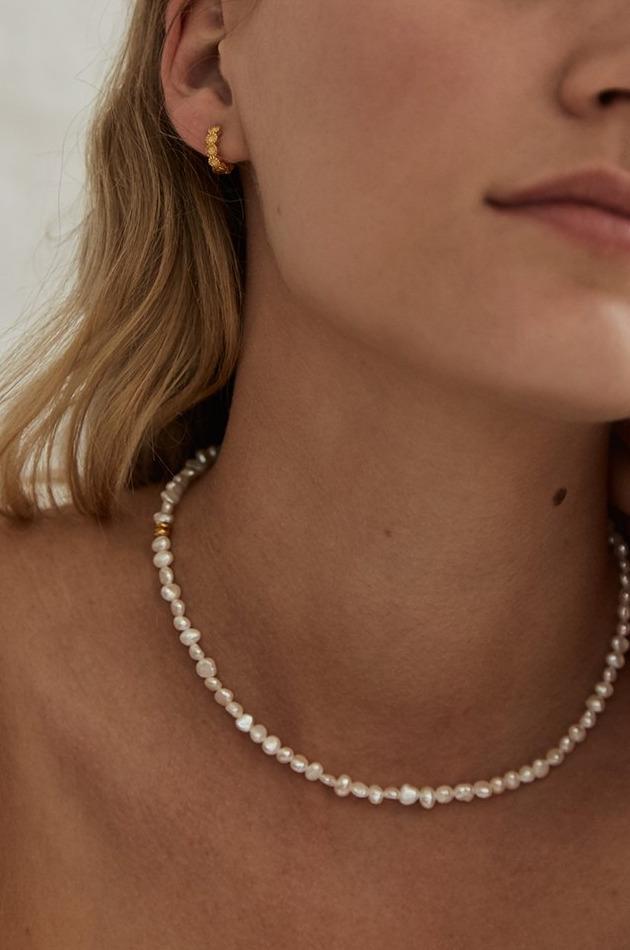Delicate, small pearls are intricately strung to together, by hand, to create this beautiful pearl choker. The organic gold beads add a unique touch to this timeless design. Featuring: Gold Plated, Brass Base, Pearl Fresh water pearls Brie...Read more