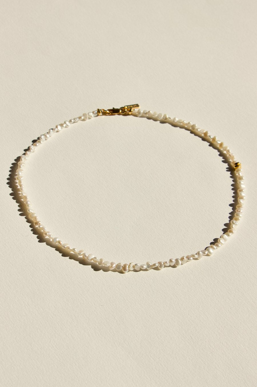 Delicate, small pearls are intricately strung to together, by hand, to create this beautiful pearl choker. The organic gold beads add a unique touch to this timeless design.