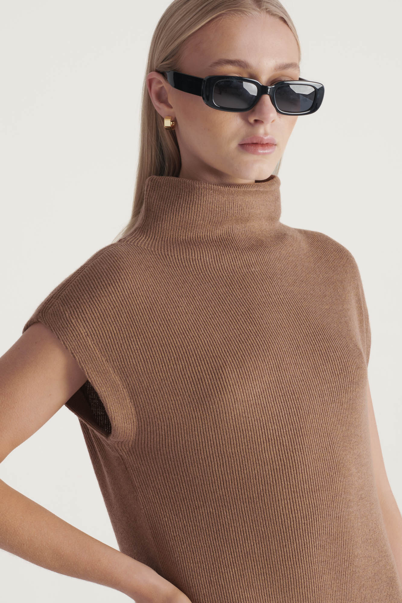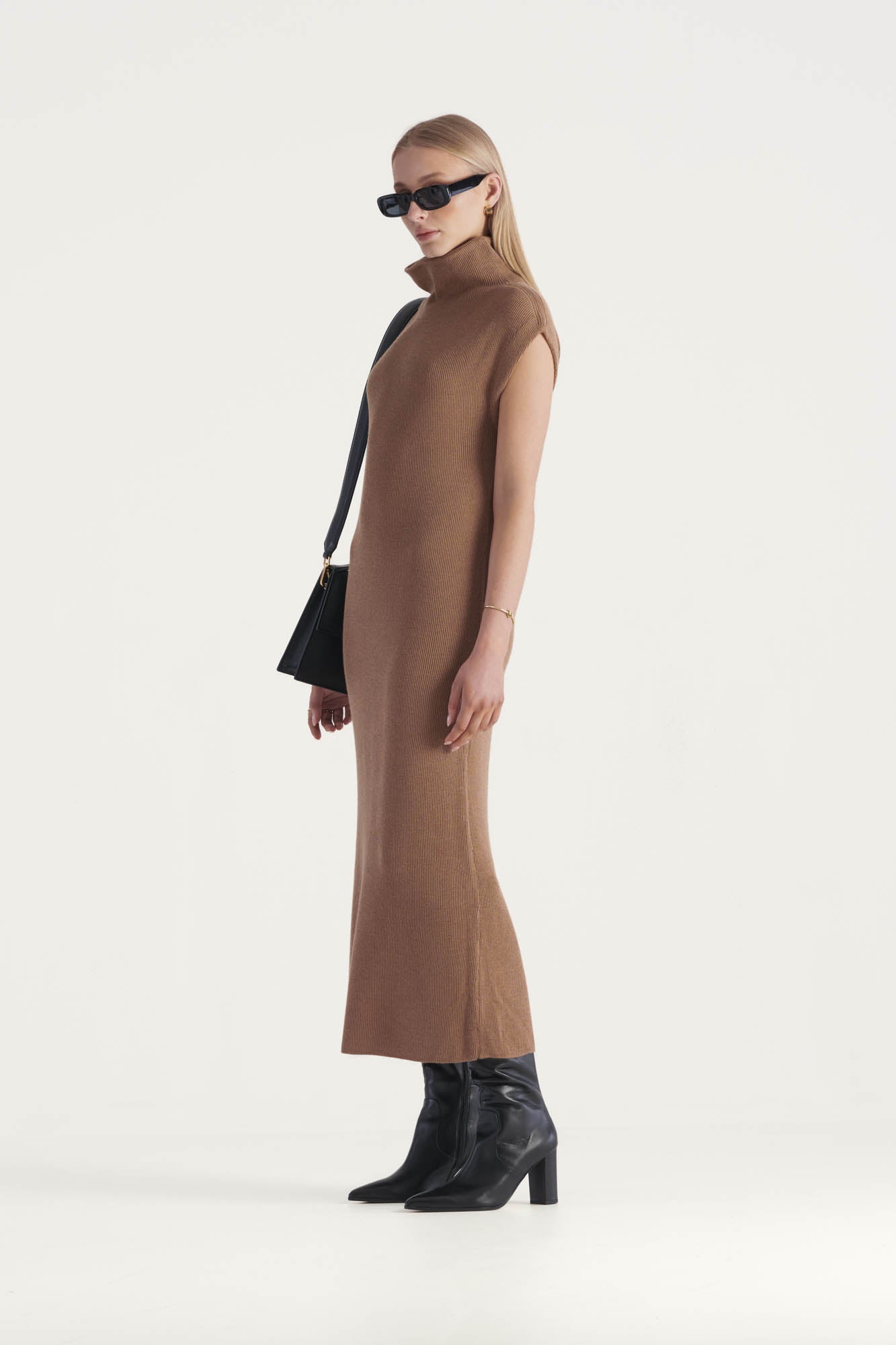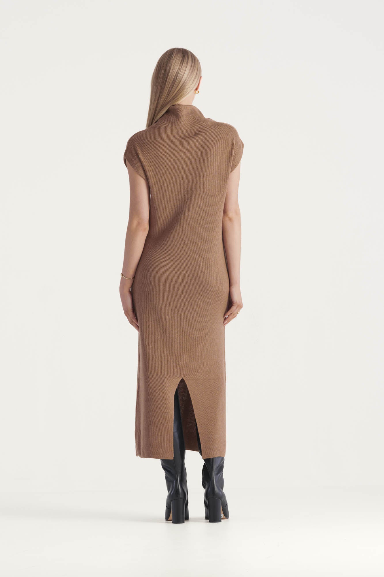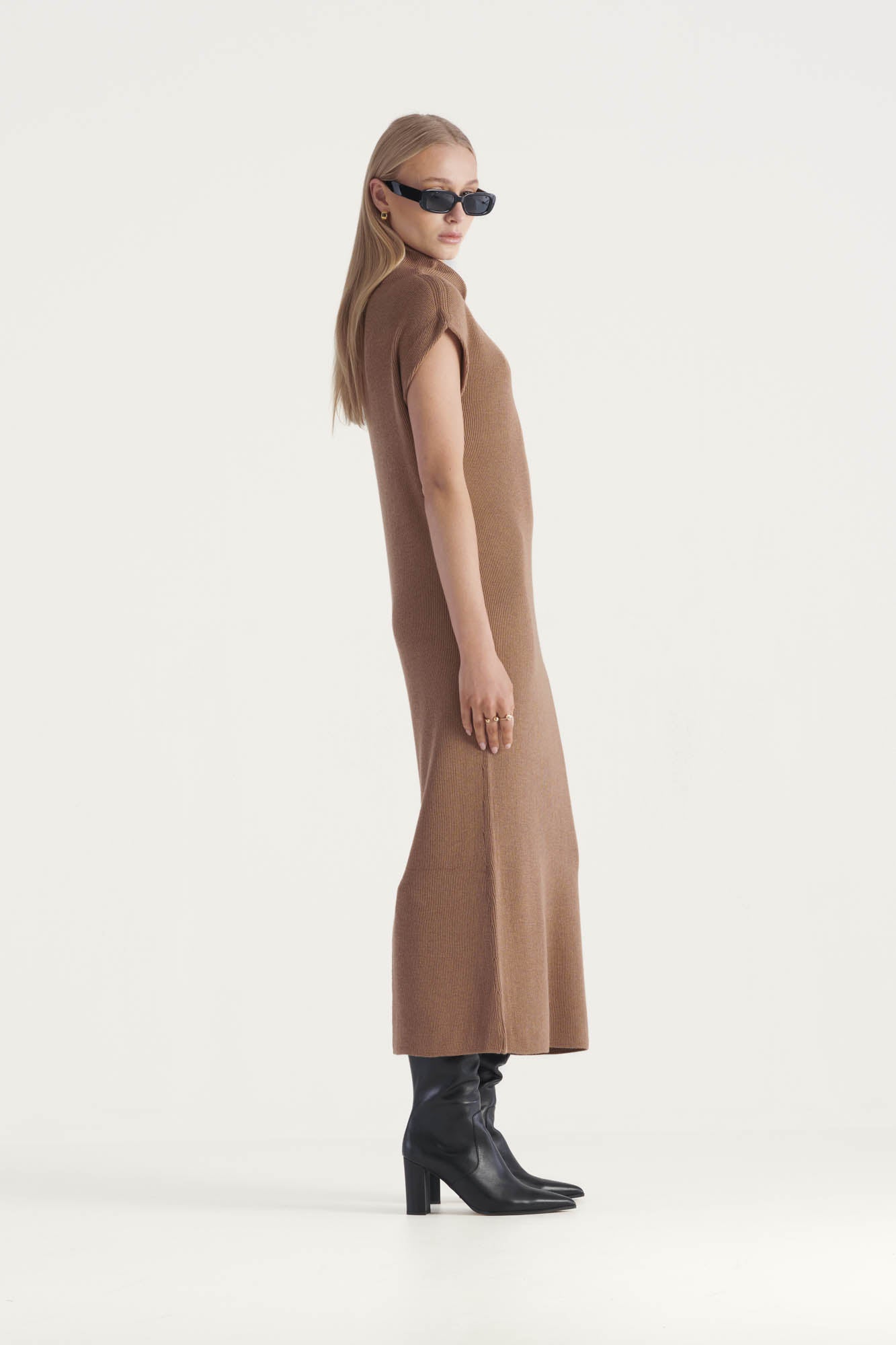 Key to the season, the Navarra Knit Dress in tan brown is timelessly elegant. A full length, short sleeved silhouette with shallow funnel neck, dropped shoulder, and centre back split, this dress is a transeasonal essential. Crafted from a soft and warm Merino wool blend, this piece will be a favourite for the cooler months. Style with a knee high boot, long overcoat and delicate accessories for a simple yet sophisticated outfit that can carry you from desk to dinner table.