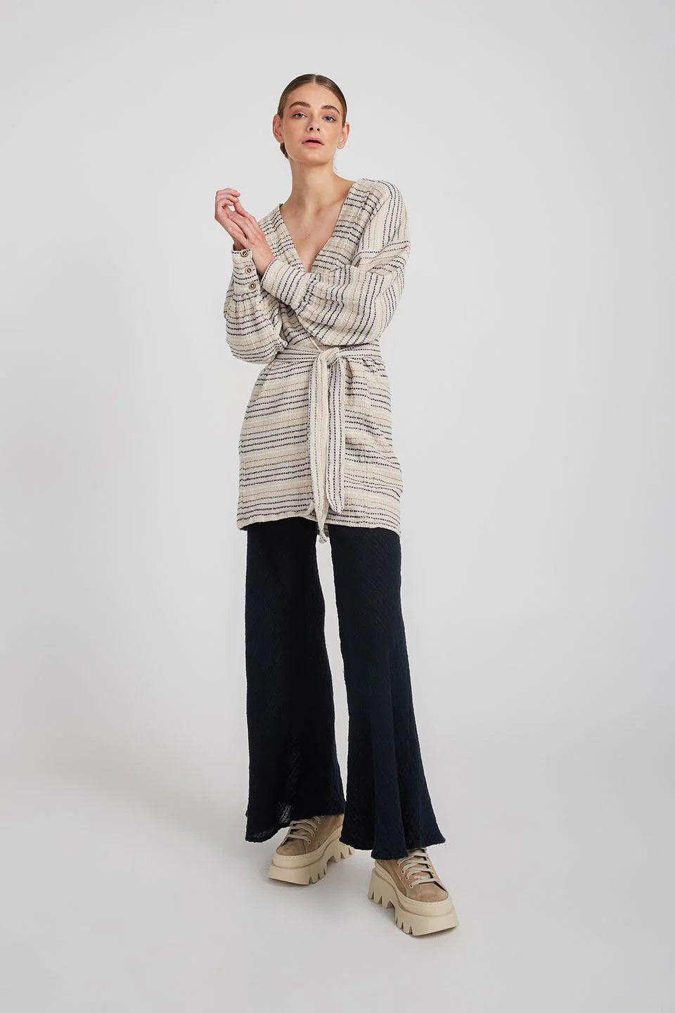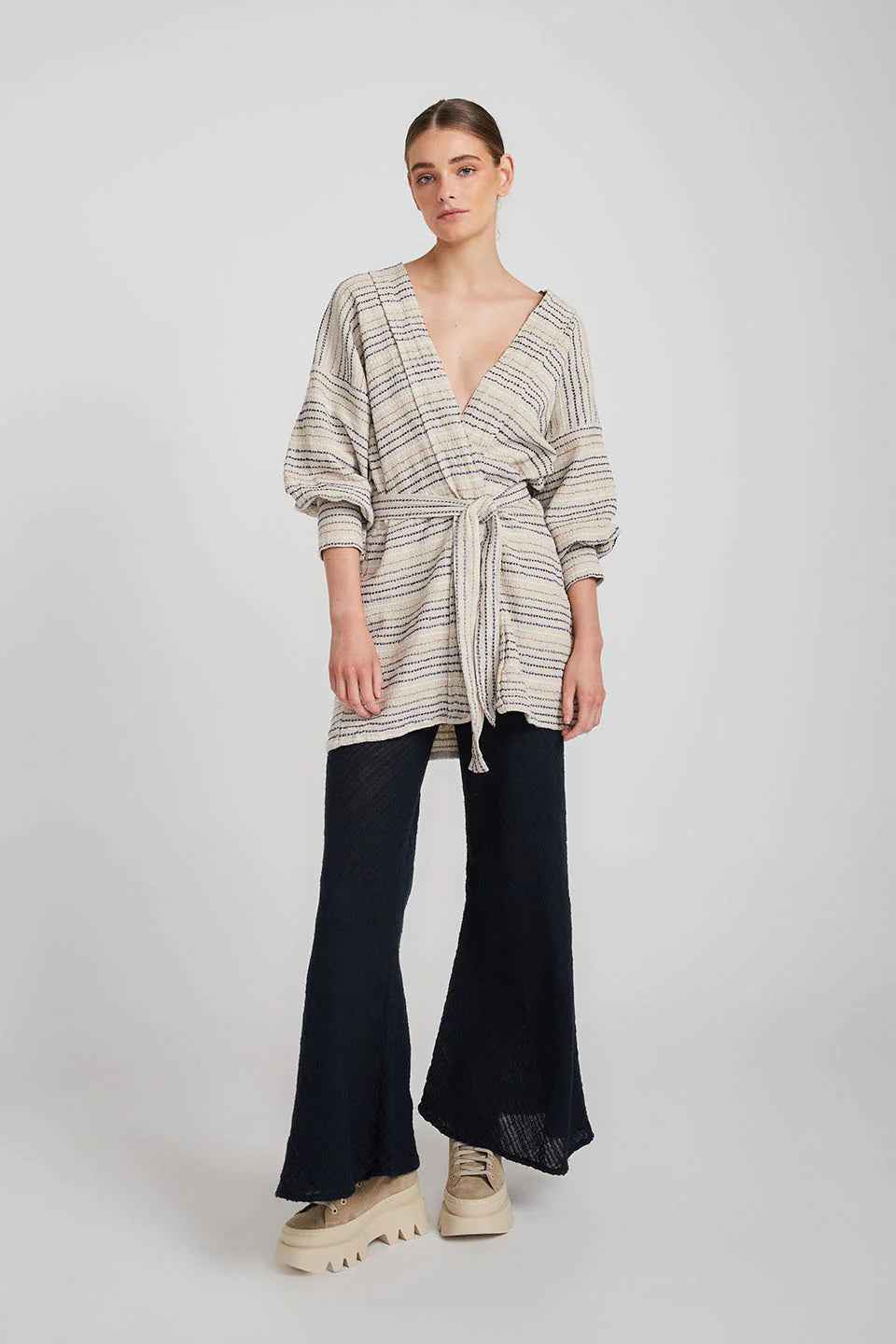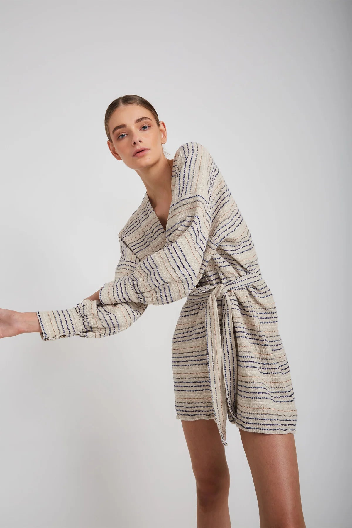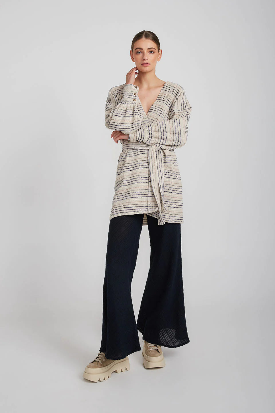 The belted Corfu Dress Coat is cut from linen in a longline silhouette with cuffs that add structure to the loose fit. Wear it as a dress and tie the waist belt to add a little definition and keep the front closed or leave it open and layer yours over everything as a jacket.