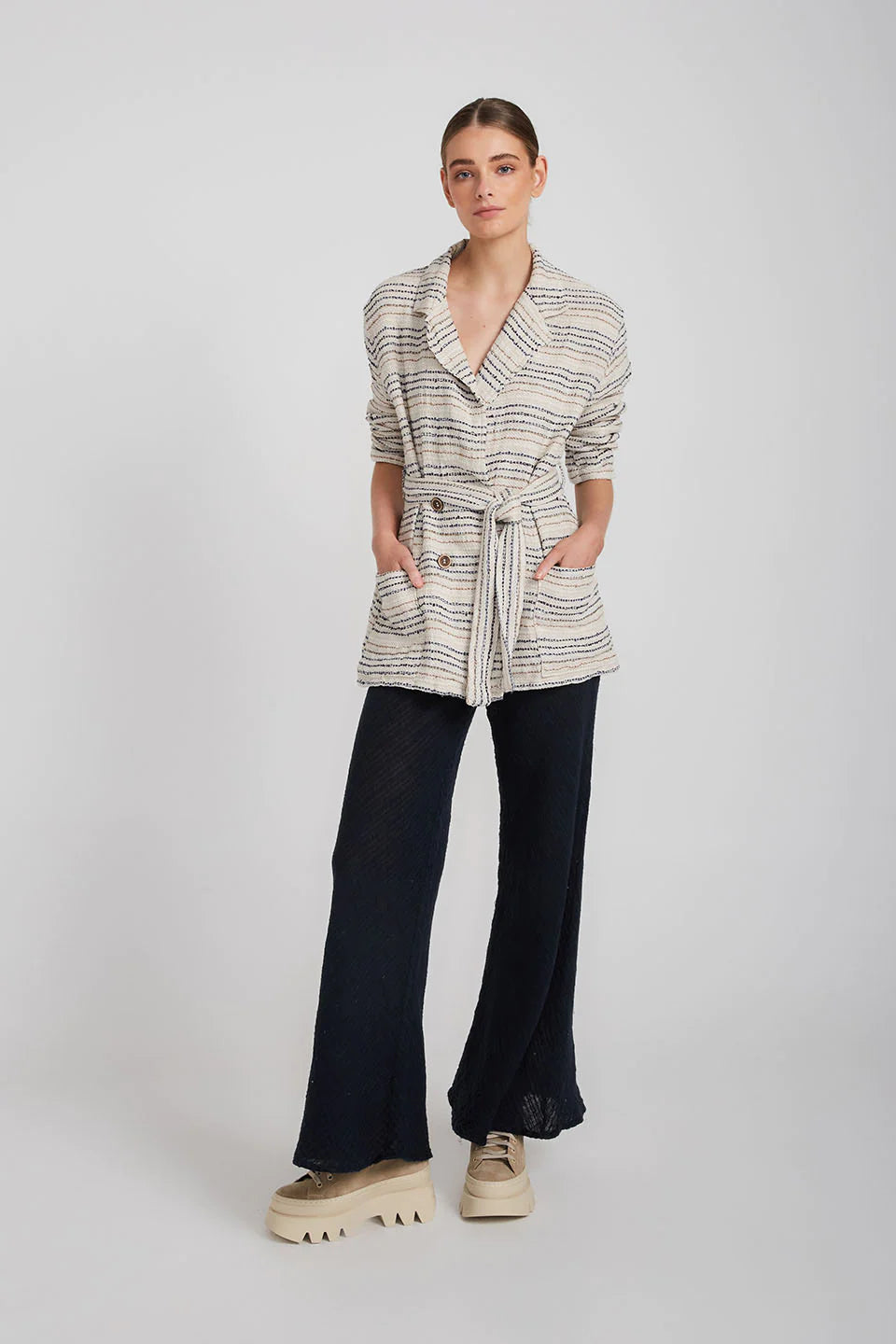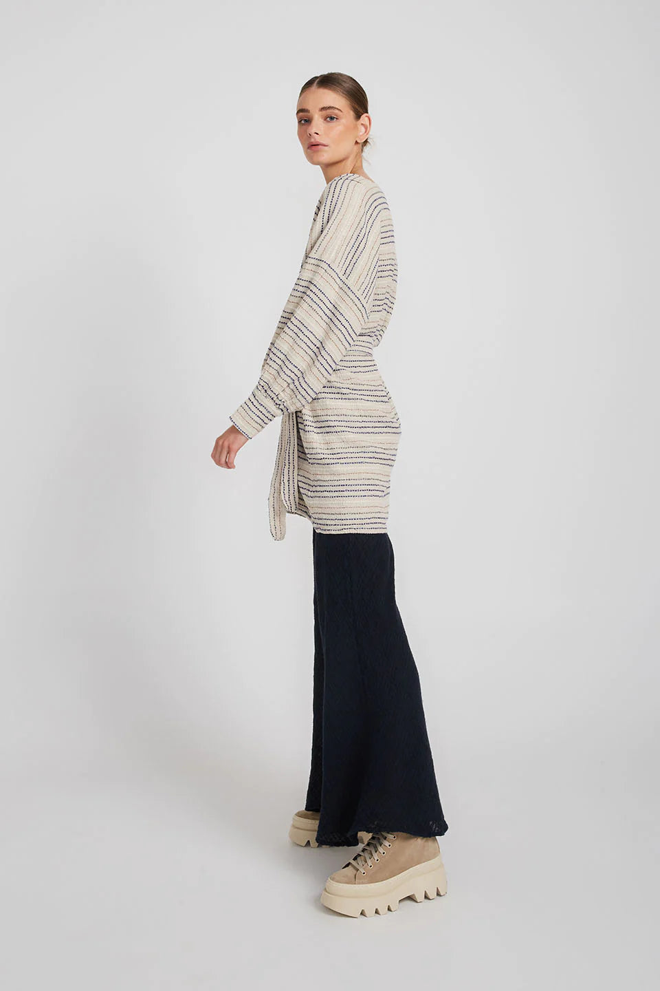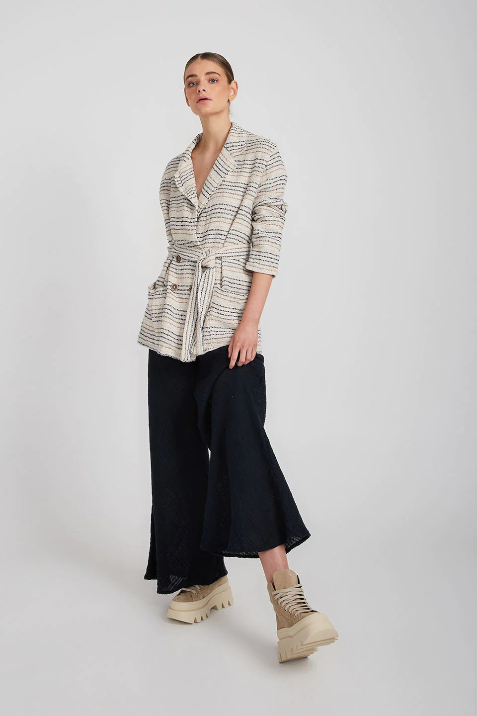 The belted Corfu Dress Coat is cut from linen in a longline silhouette with cuffs that add structure to the loose fit. Wear it as a dress and tie the waist belt to add a little definition and keep the front closed or leave it open and layer yours over everything as a jacket.