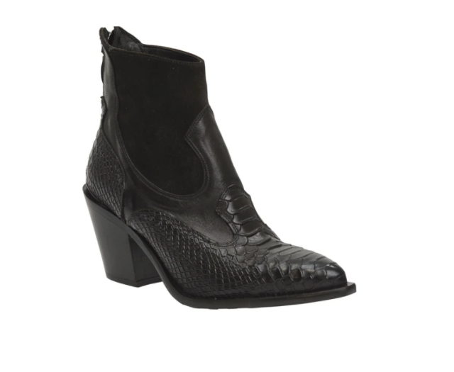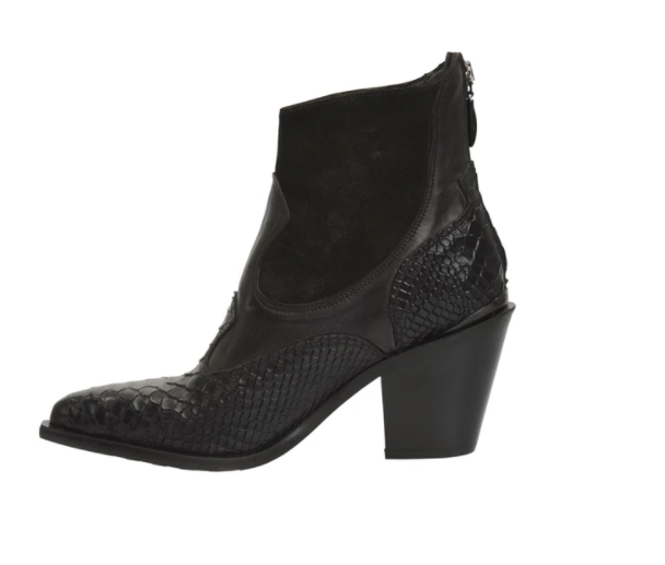 Featuring Snake patterned leather on front, sides and heel of boot, leather on mid part of boot and suede on front and sides of boot Centre rear zip opening and matching subtle heel plate 8 cm Stacked leather...Read more