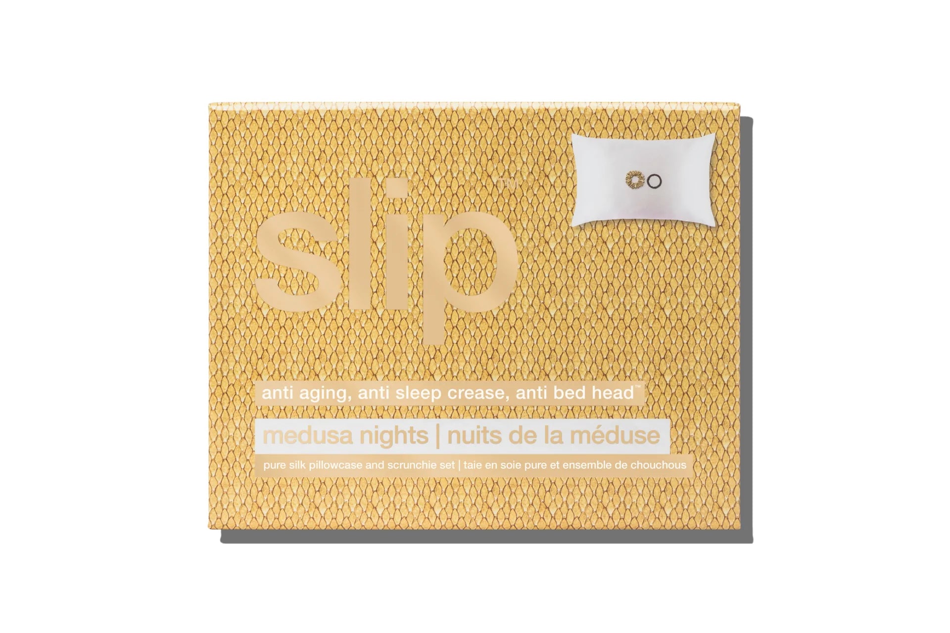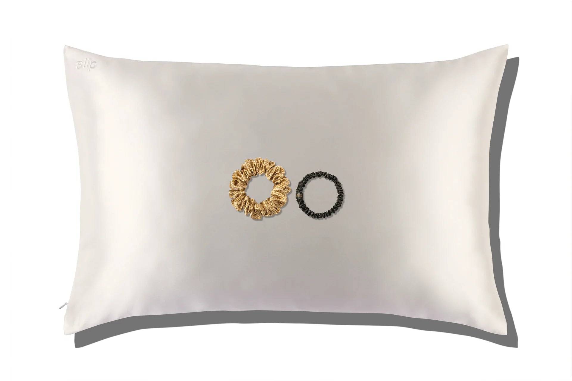 Includes: 1 x white pure silk queen/international standard (51 x 76cm/ 20" x 30") pillowcase with an invisible zipper closure | 1 x large medusa slipsilk™ scrunchie | 1 x black slipsilk™ skinny scrunchie. Please note this product is only available in queen size pillowcase with an invisible zipper closure.