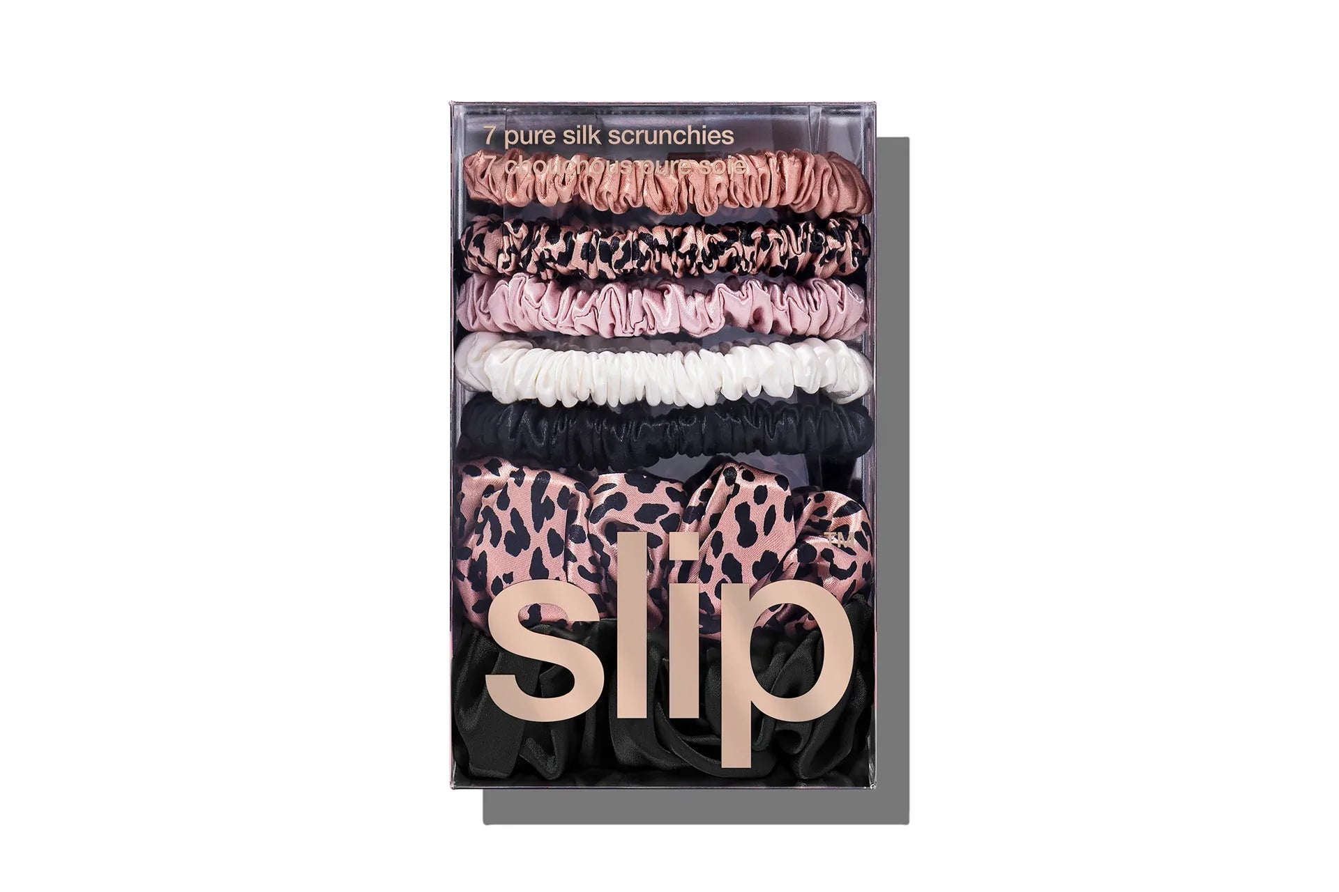 - This set includes: 1 x black, 1 x rose gold leopard pure silk large scrunchies. 1 x rose gold, 1 x black, 1 x rose gold leopard, 1 x pink, 1 x white slipsilk™ skinny scrunchies.