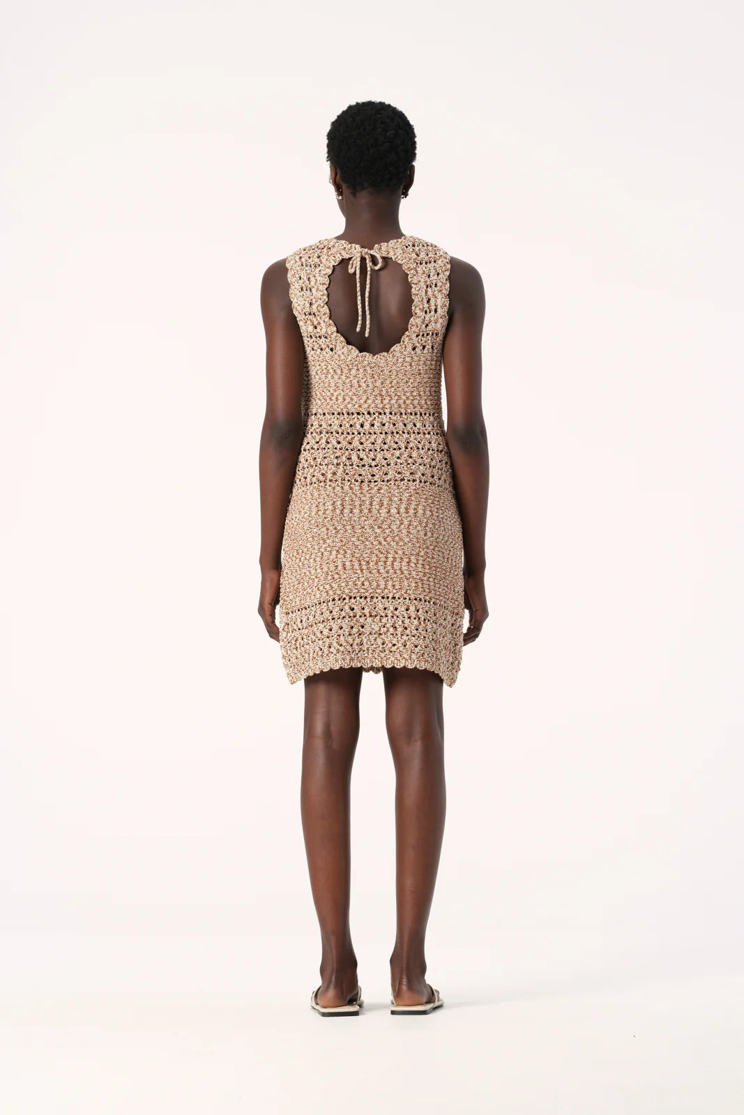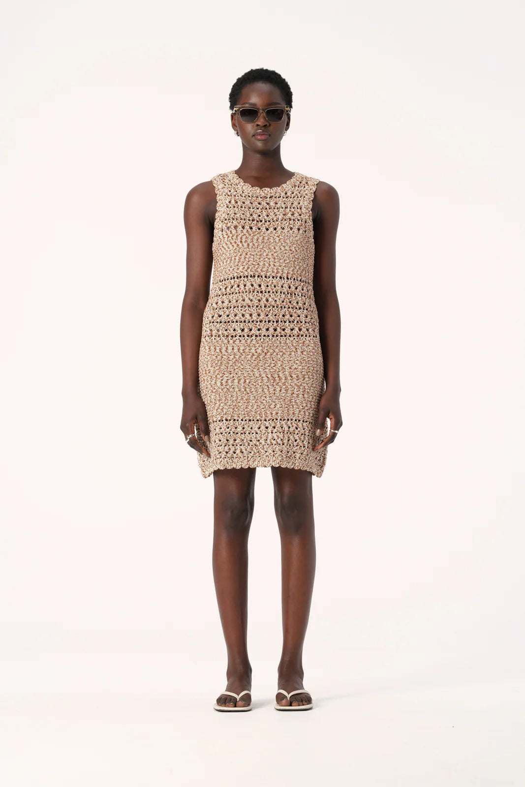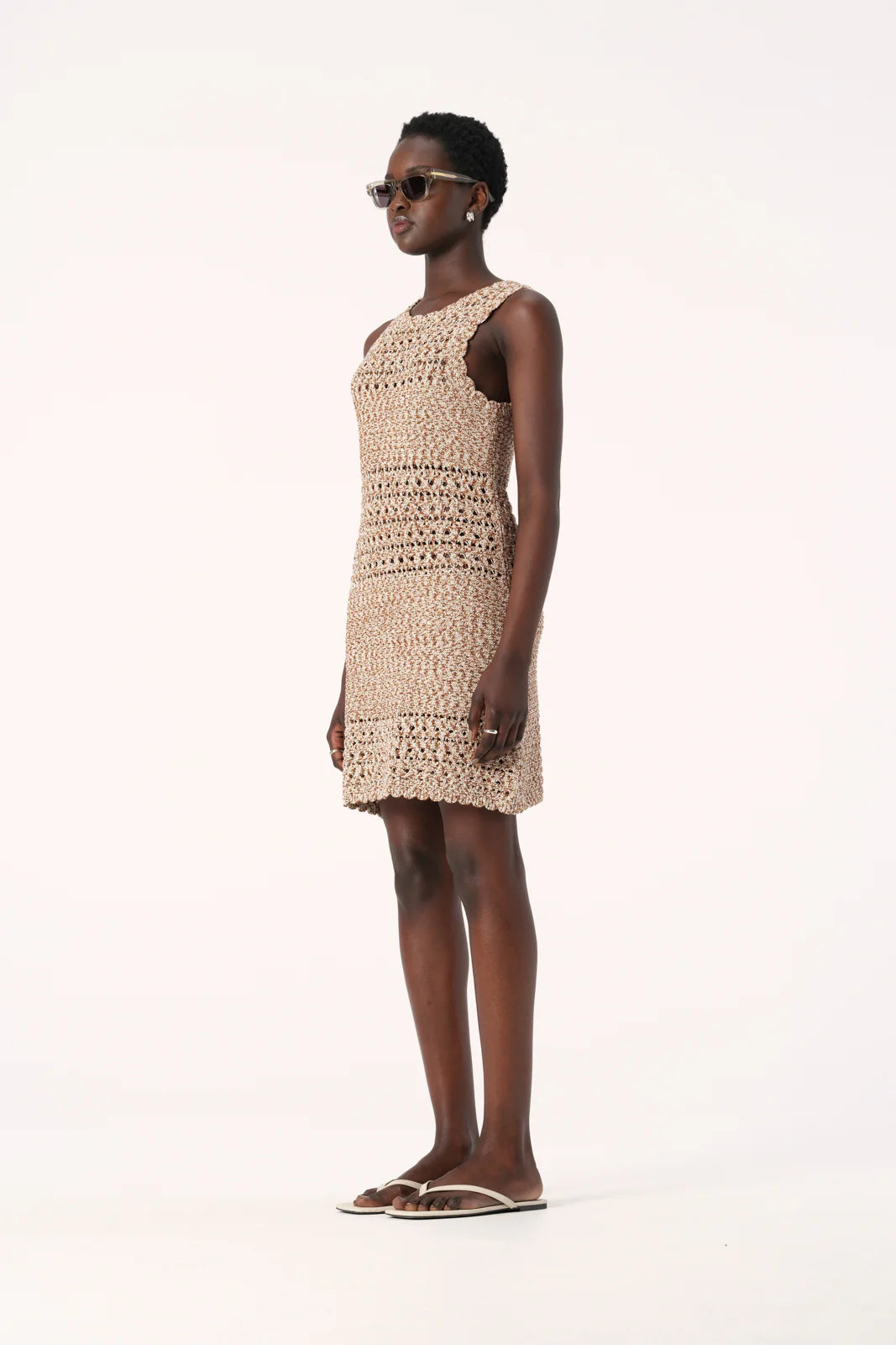 A piece destined for weekends at the beach and weeks away at tropical locations, the Altea Knit Dress is a must-have addition to your resort wear collection. Made from a cotton blended fabric, the Altea Dress is a mini length sleeveless tank dress with a round neckline and scallop edge detailing in a light tan colour that will always be on trend. The weighty crochet fabric gives the Altea Dress a unique texture that remains breathable for comfortable wear. Style with sandals and gold accessories for an elevated day to night look.