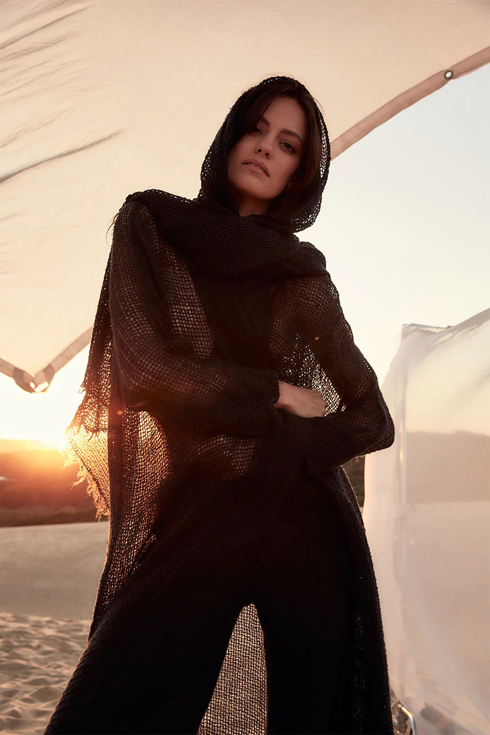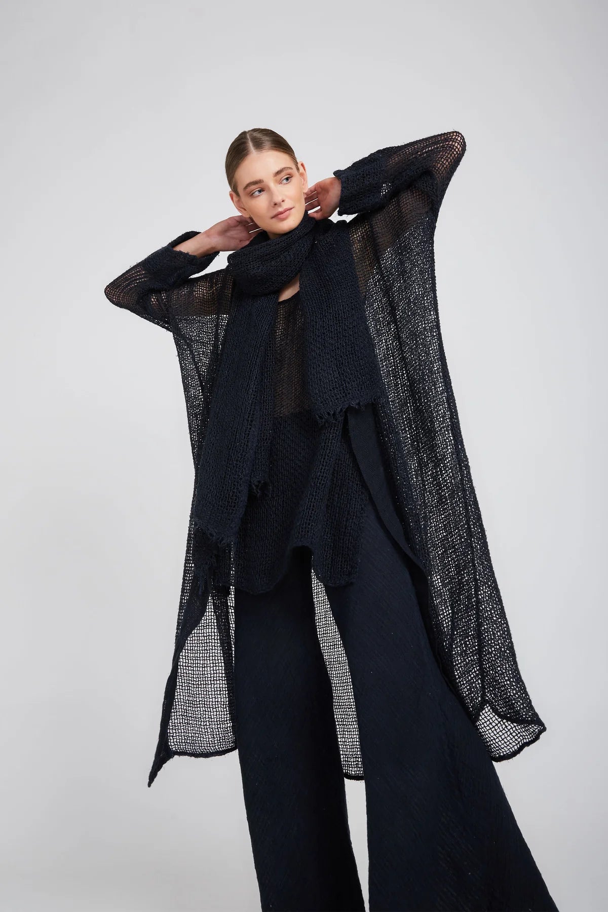 This duster features a distinct fabric combination of our Pescatore open netted weave and subtle contrast trim on the lapel that is both tonal and highlights the clean lines and relaxed silhouette of the coat. It drapes softly down your figure for the perfect layering piece.