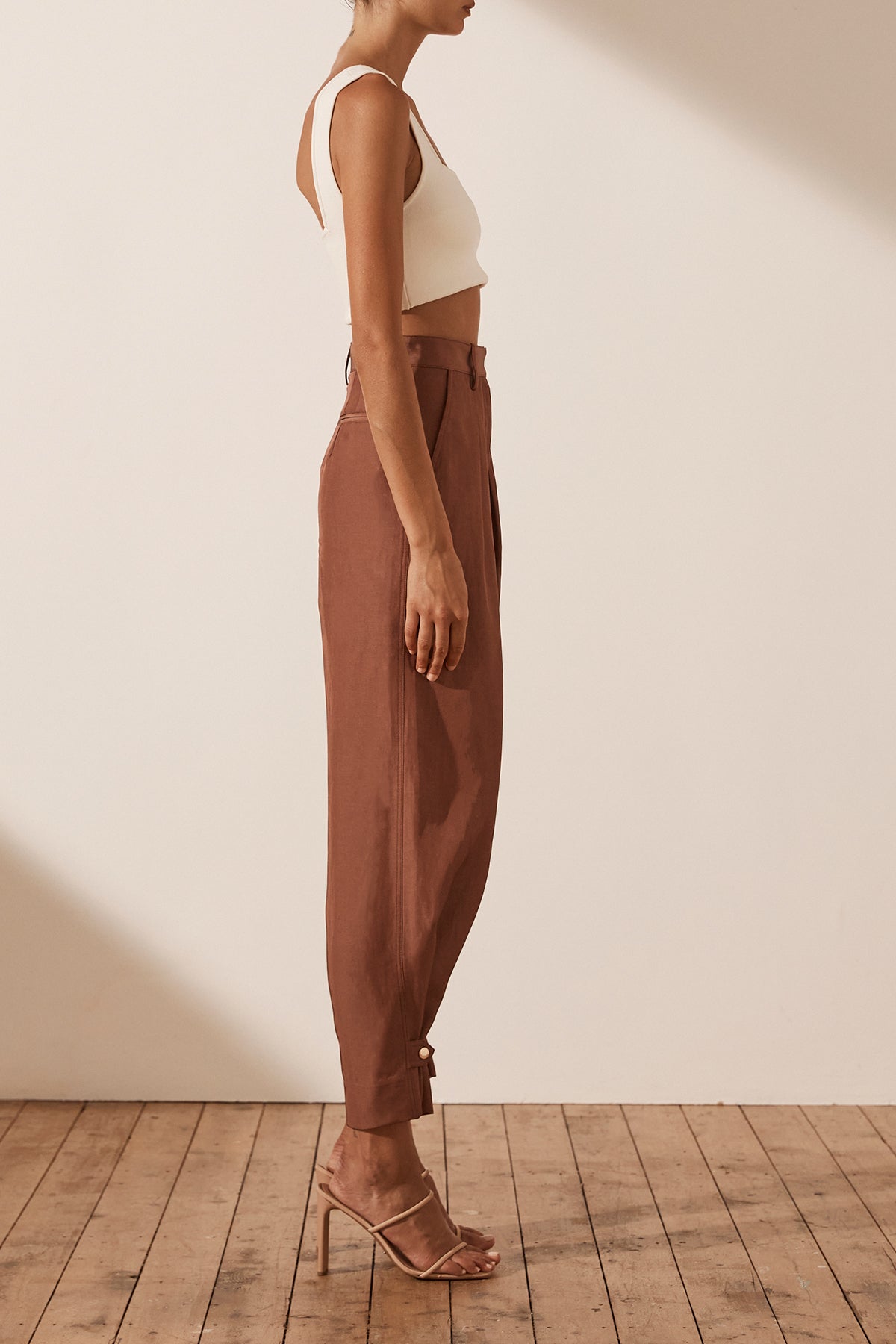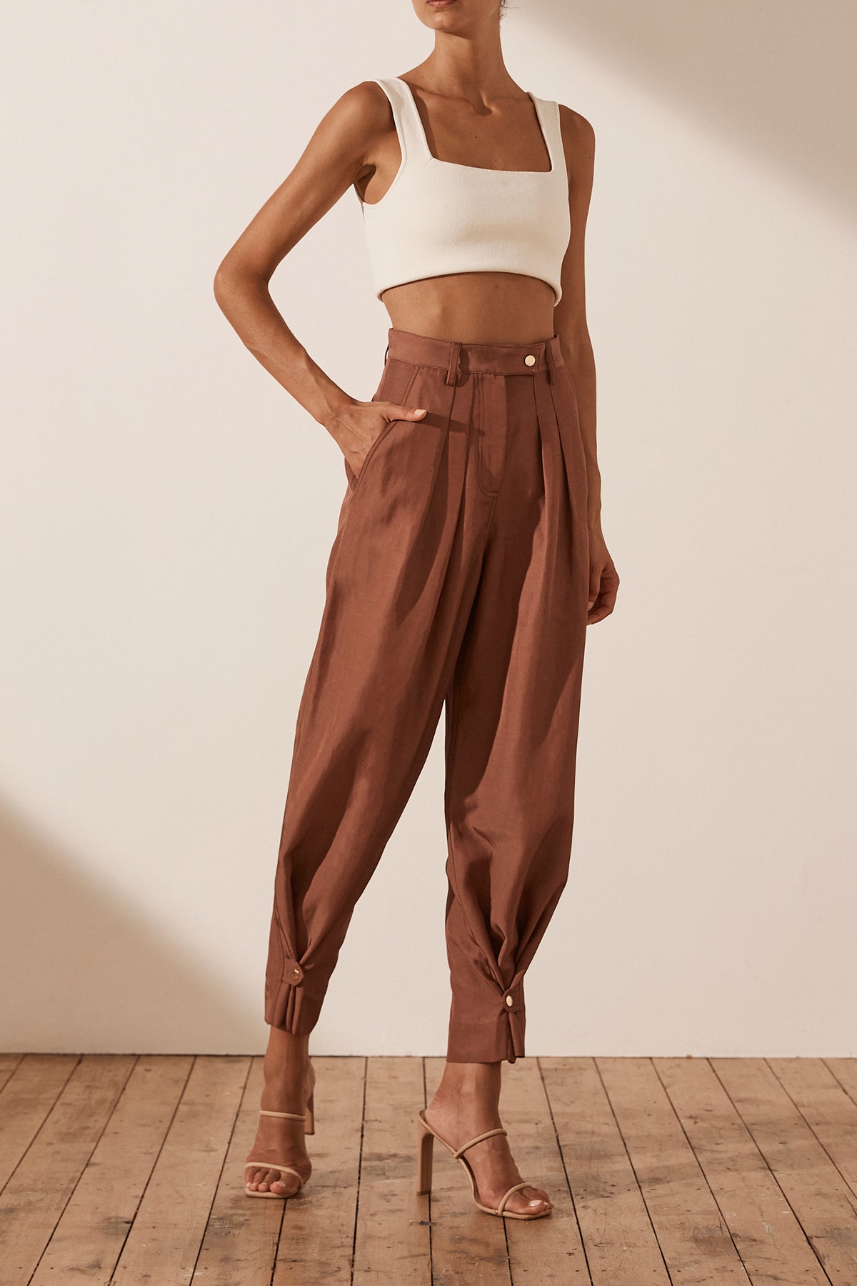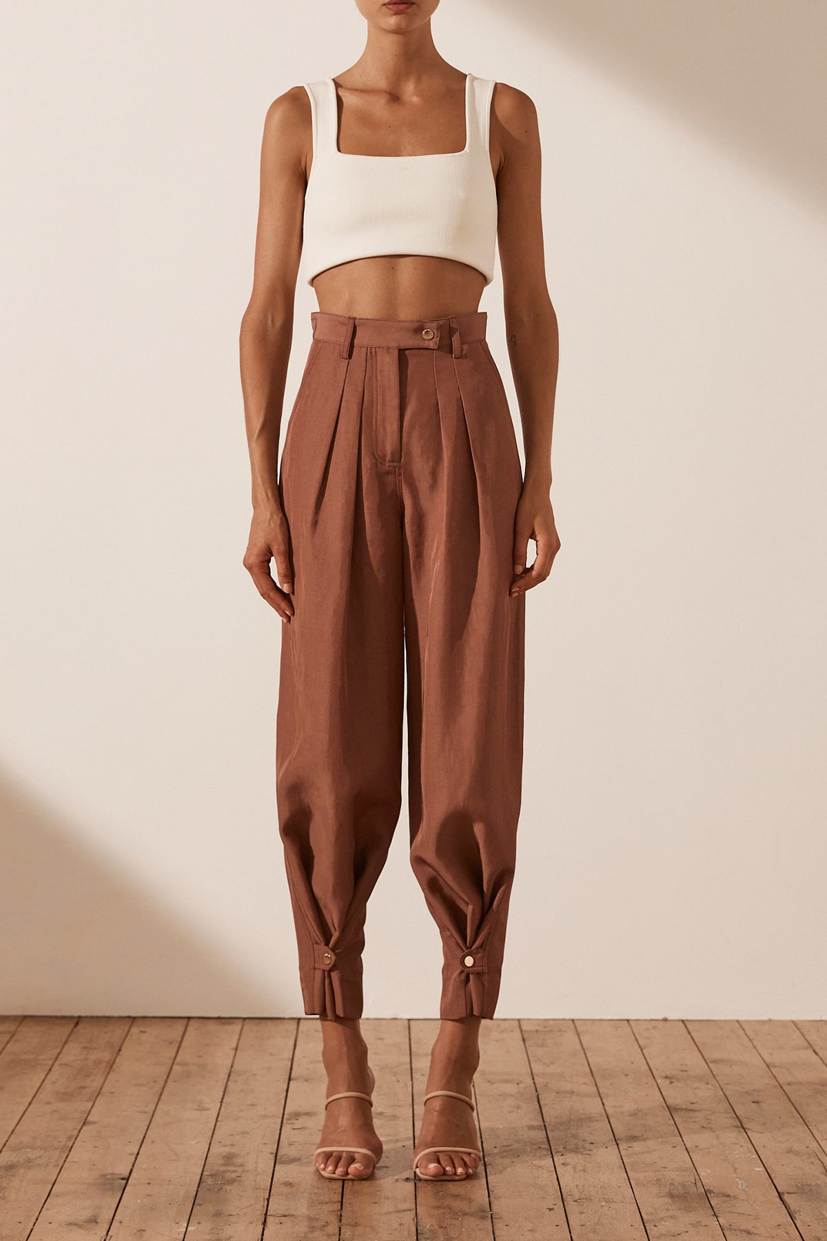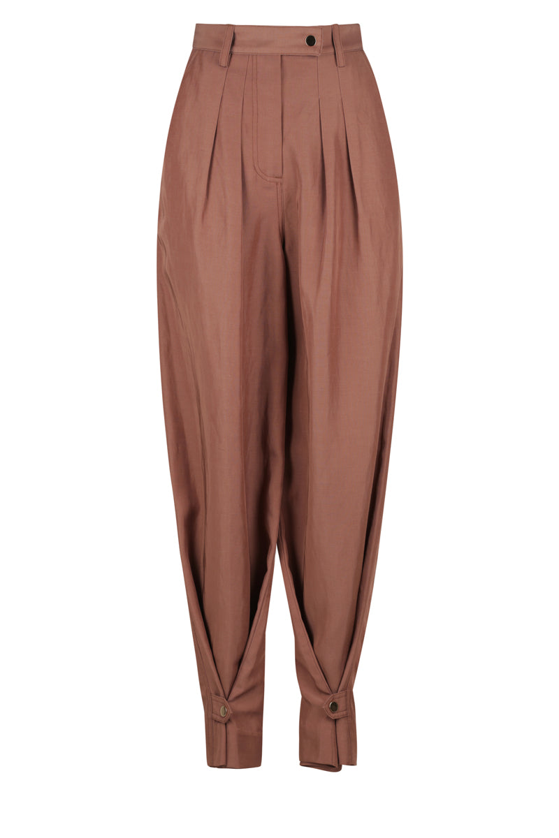 Luxurious linen blend with sheen High waisted with belt loops Fly front closure with button tab Double front pleat Side and back pockets Can be worn as a tapered or straight leg pant Snap button closure at hem...Read more