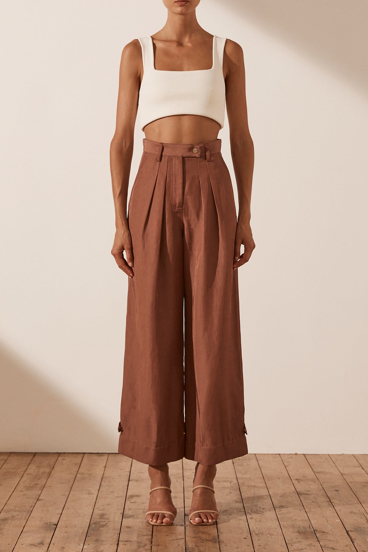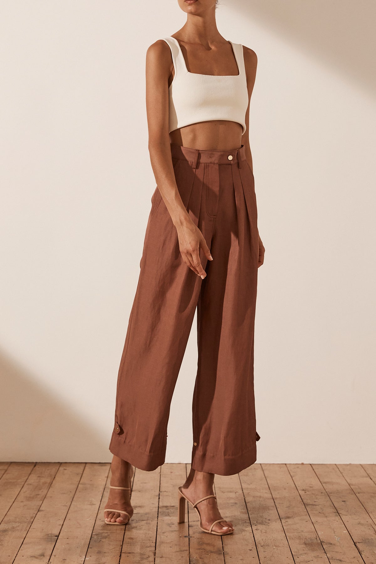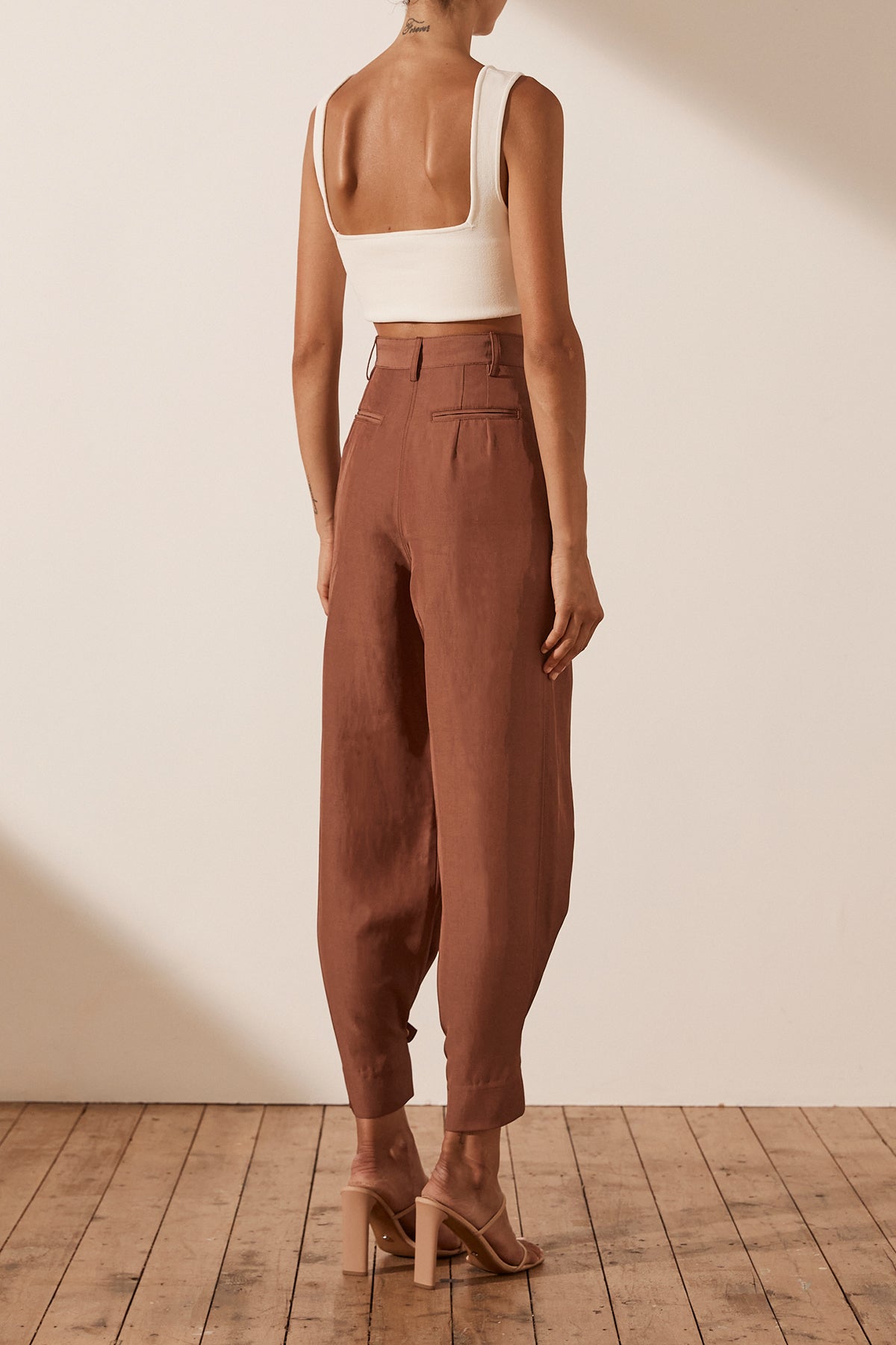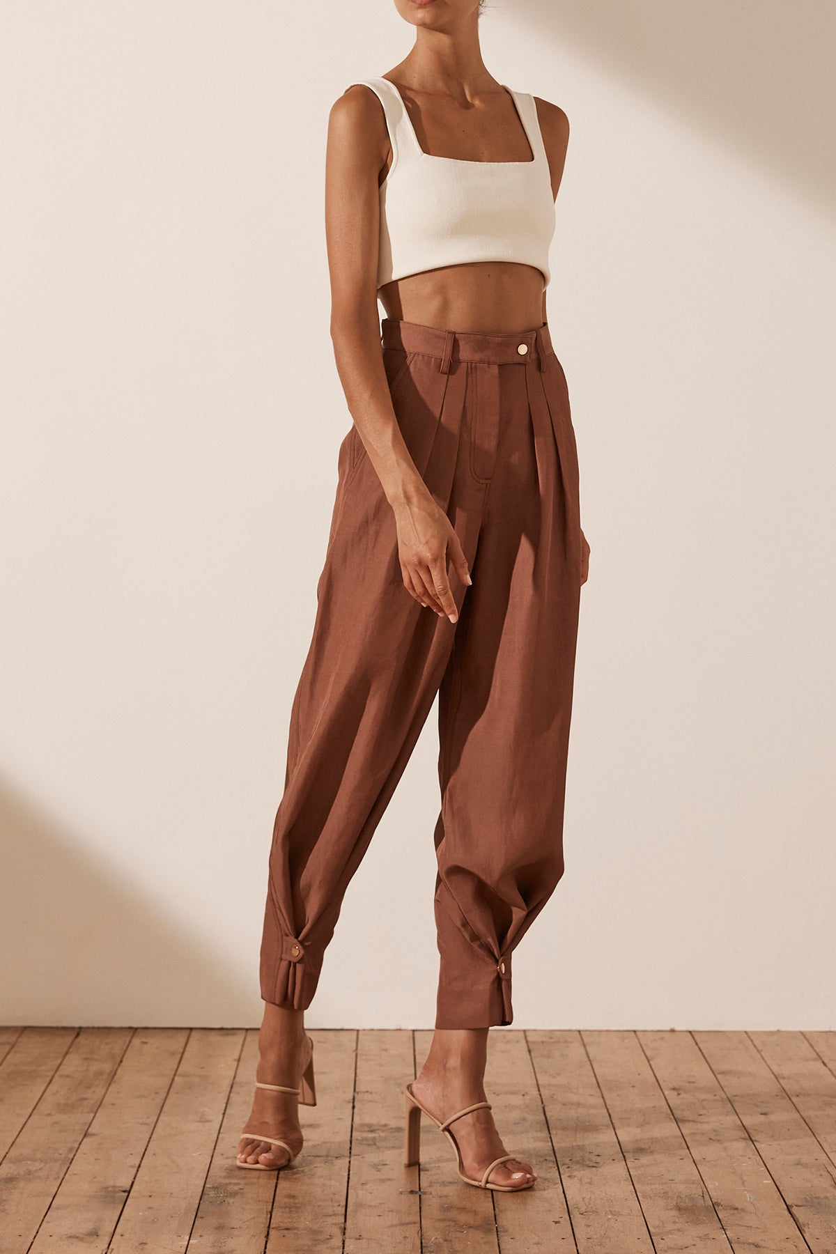 Luxurious linen blend with sheen High waisted with belt loops Fly front closure with button tab Double front pleat Side and back pockets Can be worn as a tapered or straight leg pant Snap button closure at hem...Read more