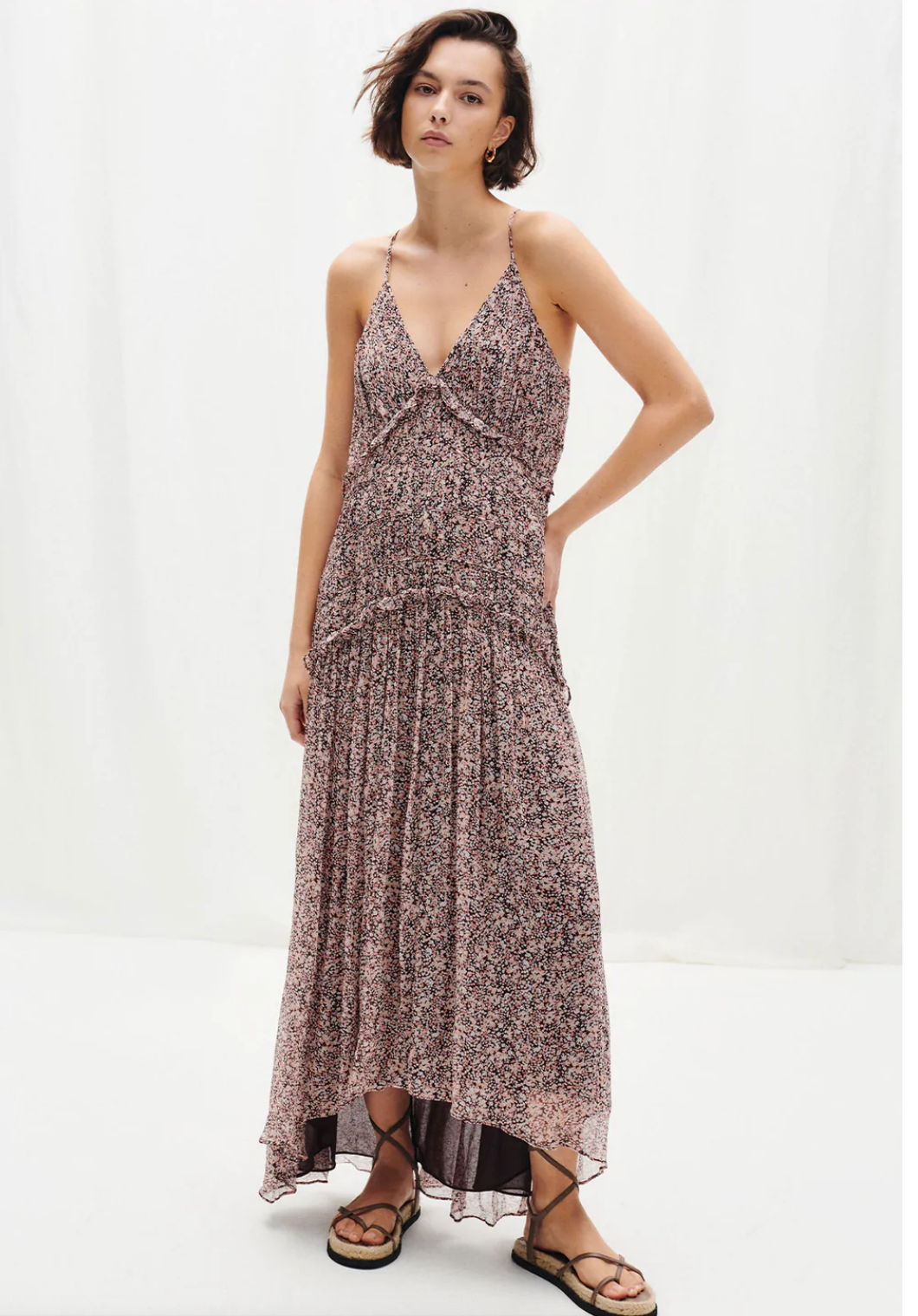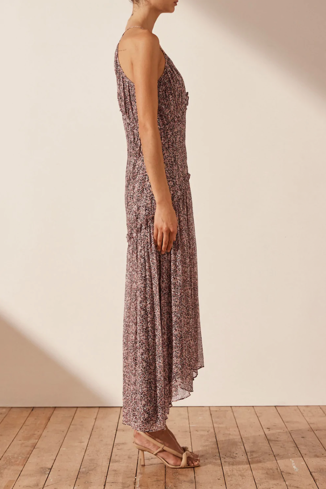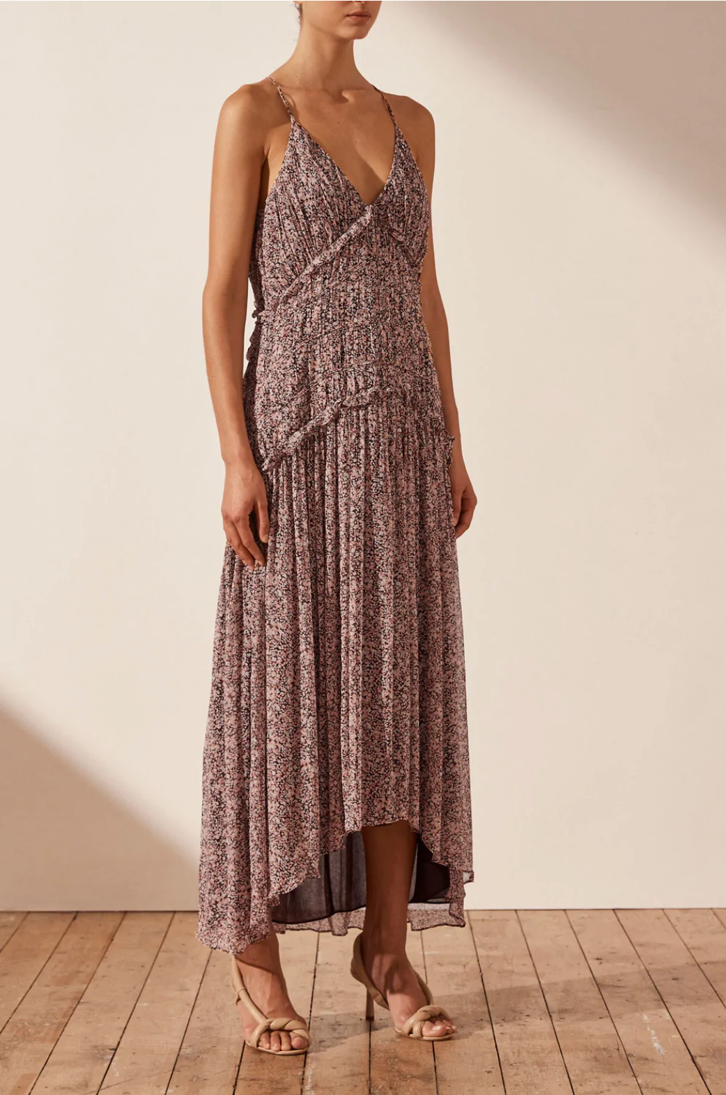 Plunged maxi dress in a light weight semi-sheer chiffon in the exclusive Cynthia print.