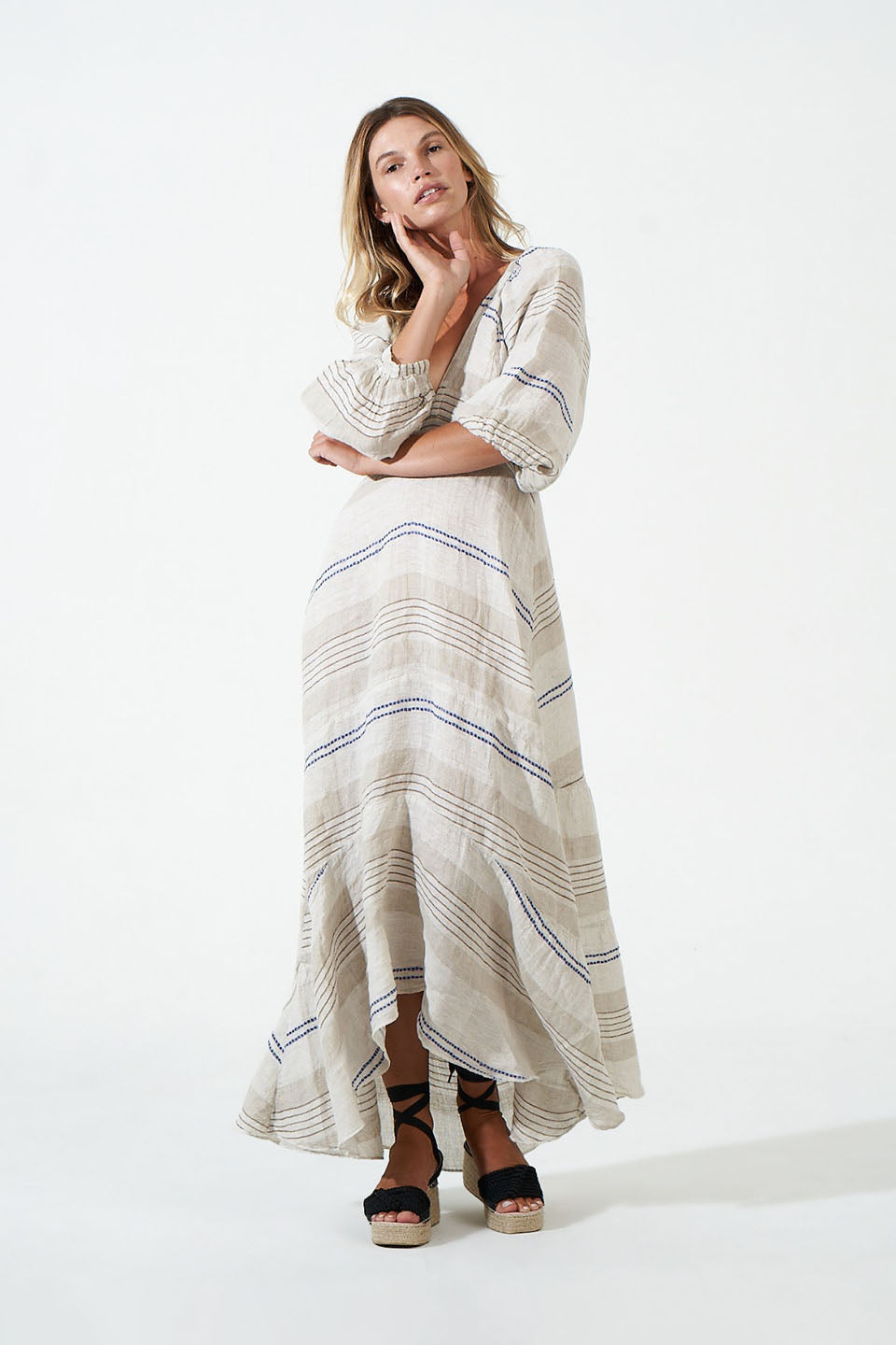 Cut from lightweight linen, the Toco Dress has a v-neckline, voluminous balloon sleeves and falls to a pretty ruffled hem. Shorter at the front, and slightly longer at the back, the empire waist accentuates the floaty feel of the dress.