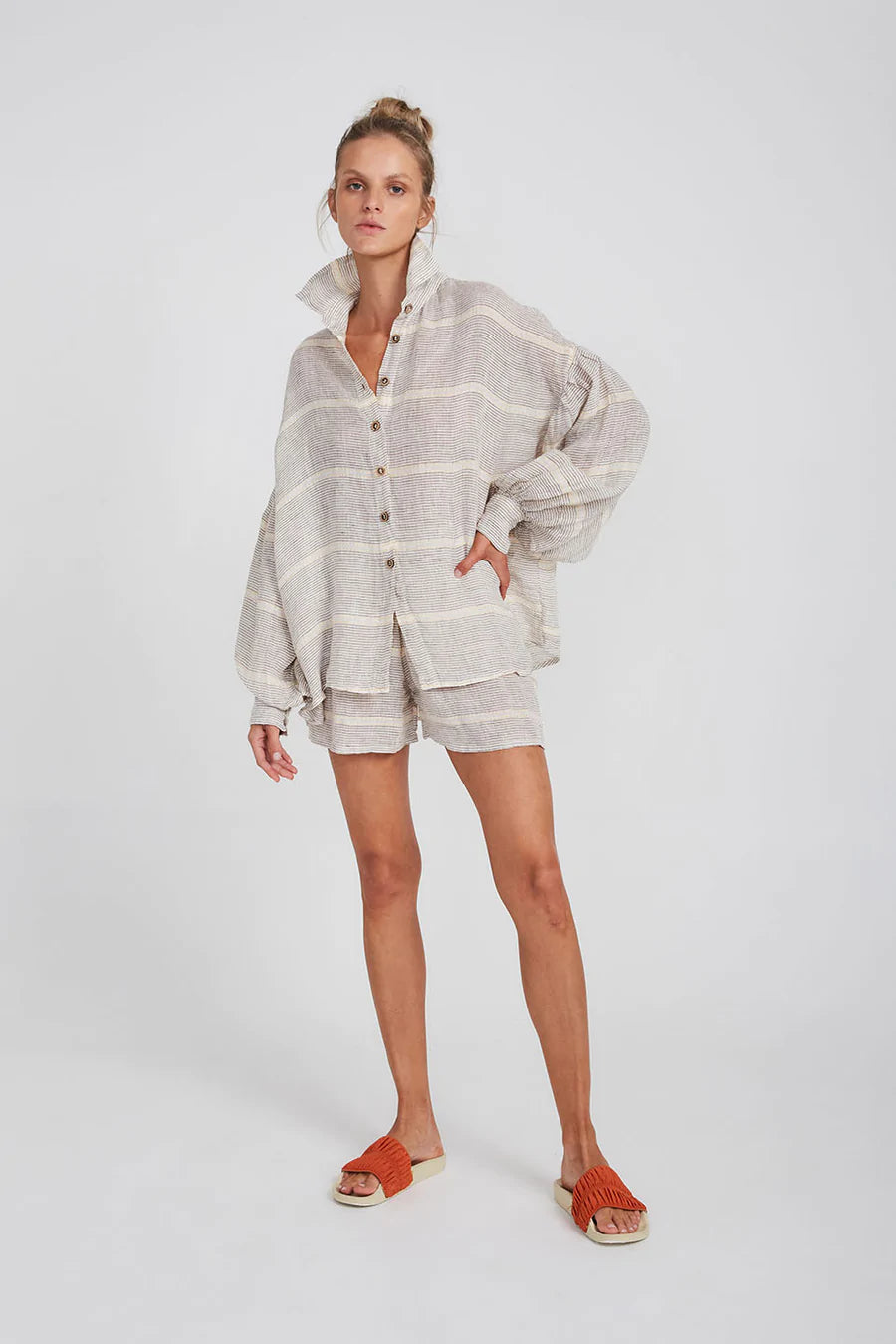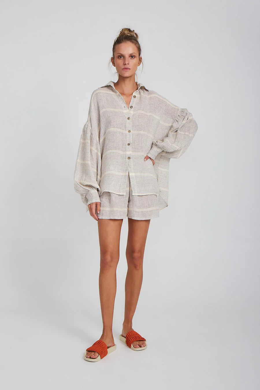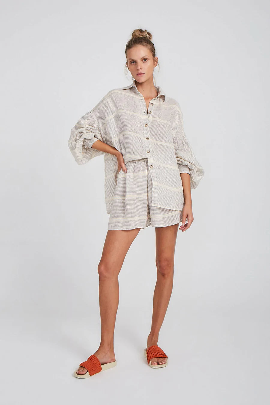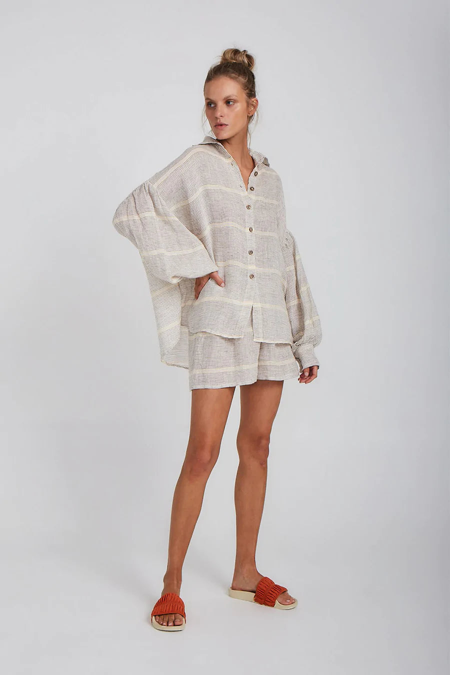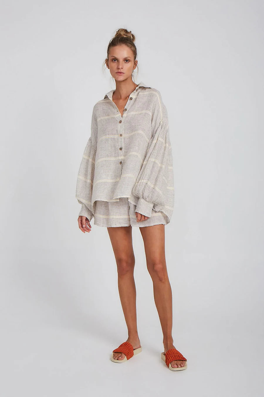 This billowing blouse is a wardrobe staple with a loose fit silhouette and balloon sleeves and buttoned cuffs. It has a subtle collar and buttons down so it can be worn closed or open. Style back with our Samba Shorts in Hermosa for an elevated lounge look.