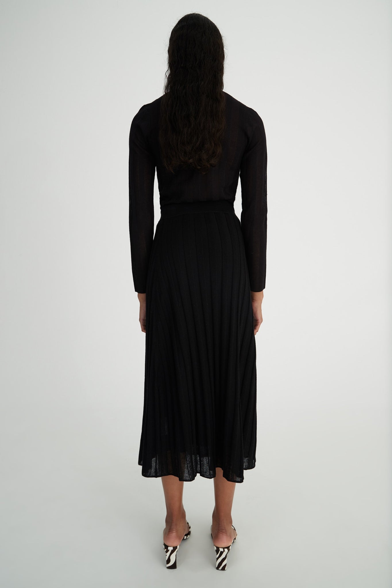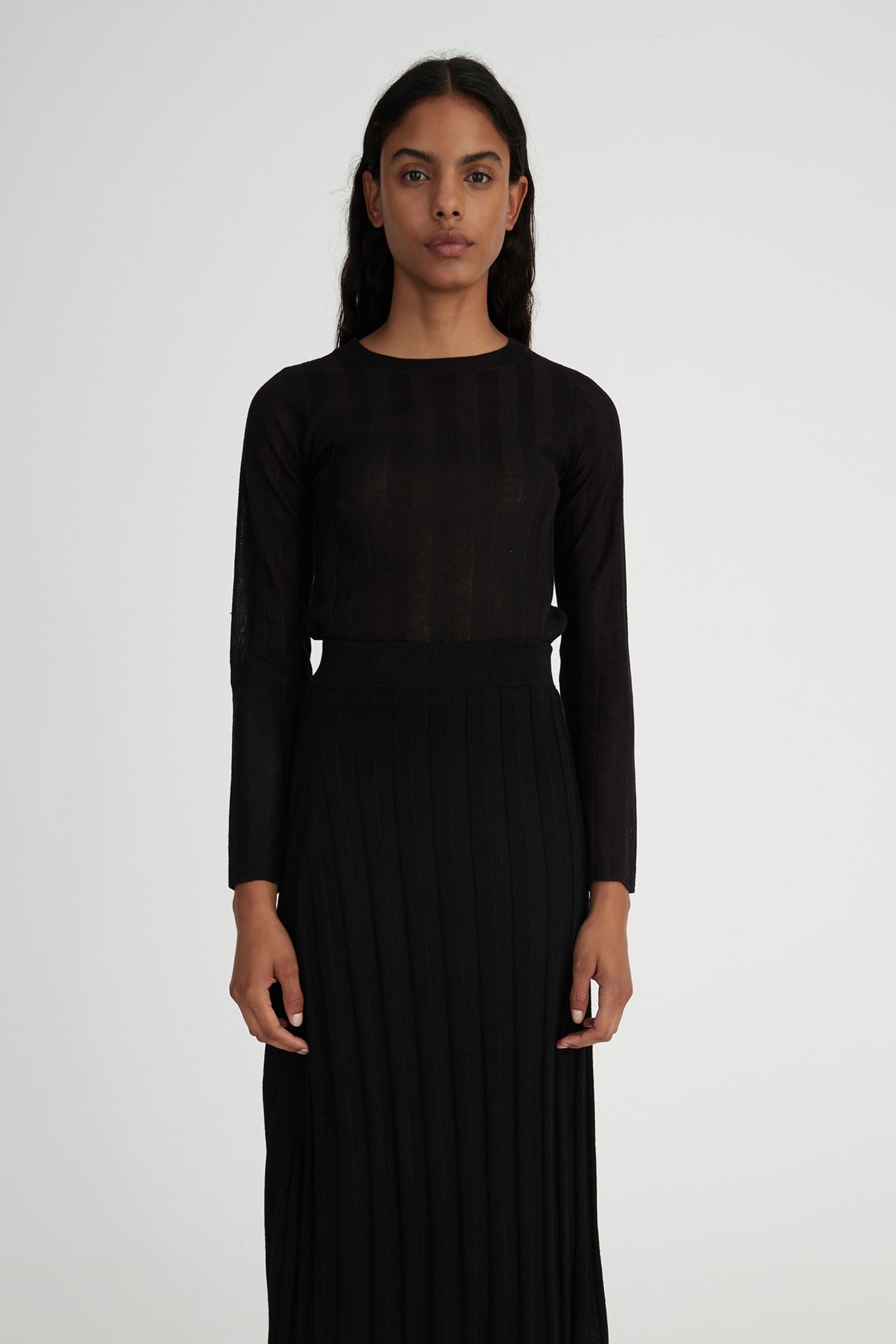 The Hansen & Gretel ‘Joey Top’ is a ribbed textured knit style top. It is fitted to the body and features a full length sleeve. Wear with the Breton Skirt for a matching look. Model is wearing a size Small.