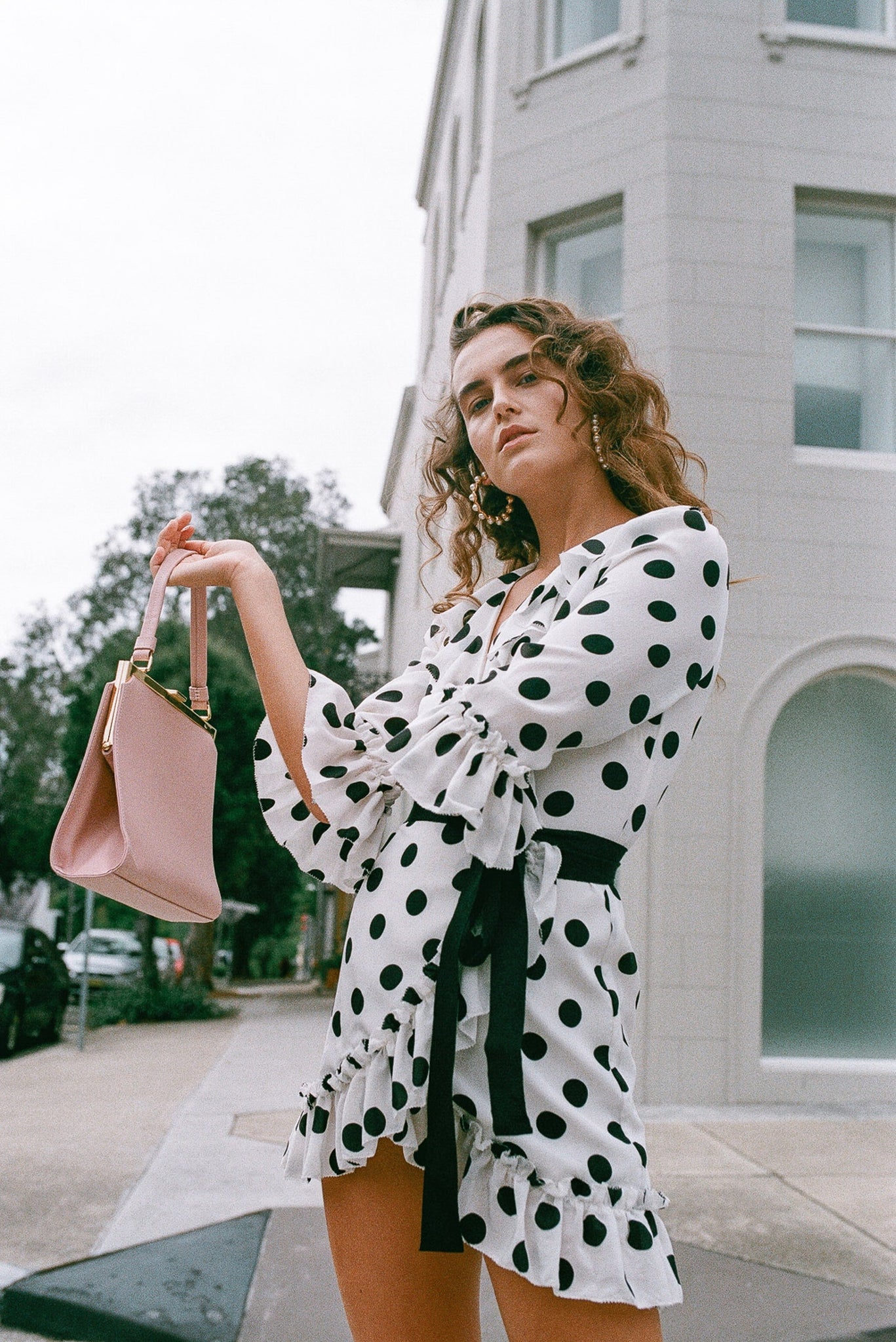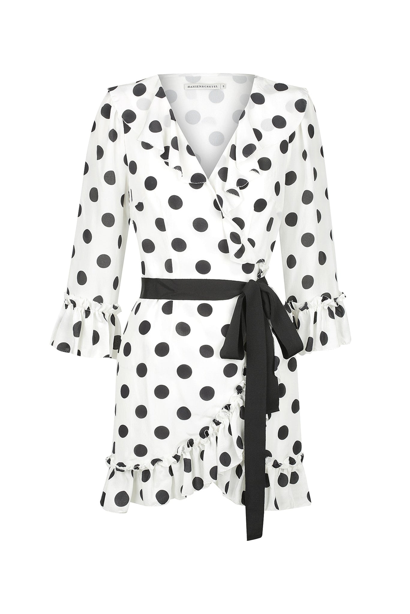 The Ingrid Dress is a part of H&G’s exclusive racewear collection, cut in a black and white polka in 100% Silk. Ingrid is a wrap style dress with cascading ruffles framing the neckline all the way down to them hem. The dress ties at the waist with a contrasting black tie and a ruffle detail finishing off the 3/4 sleeve.