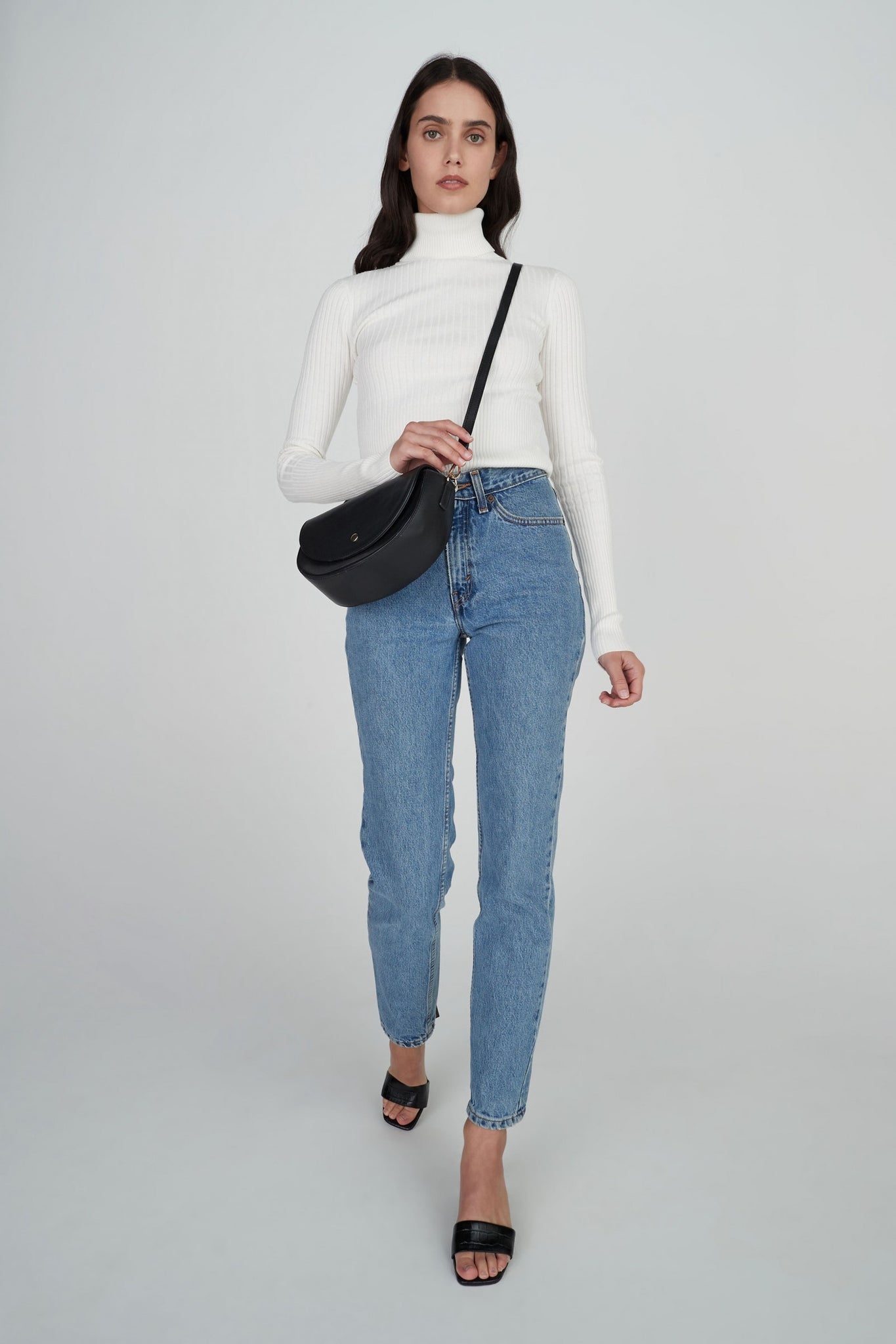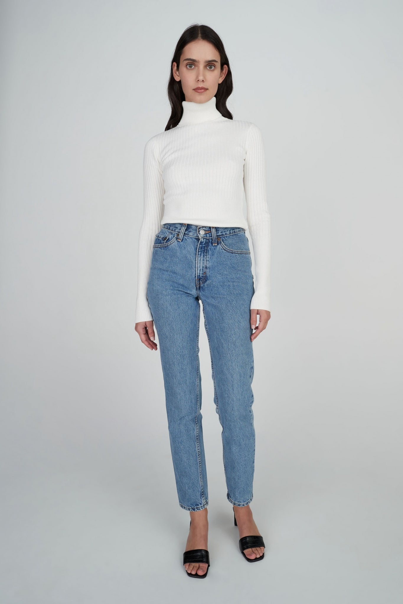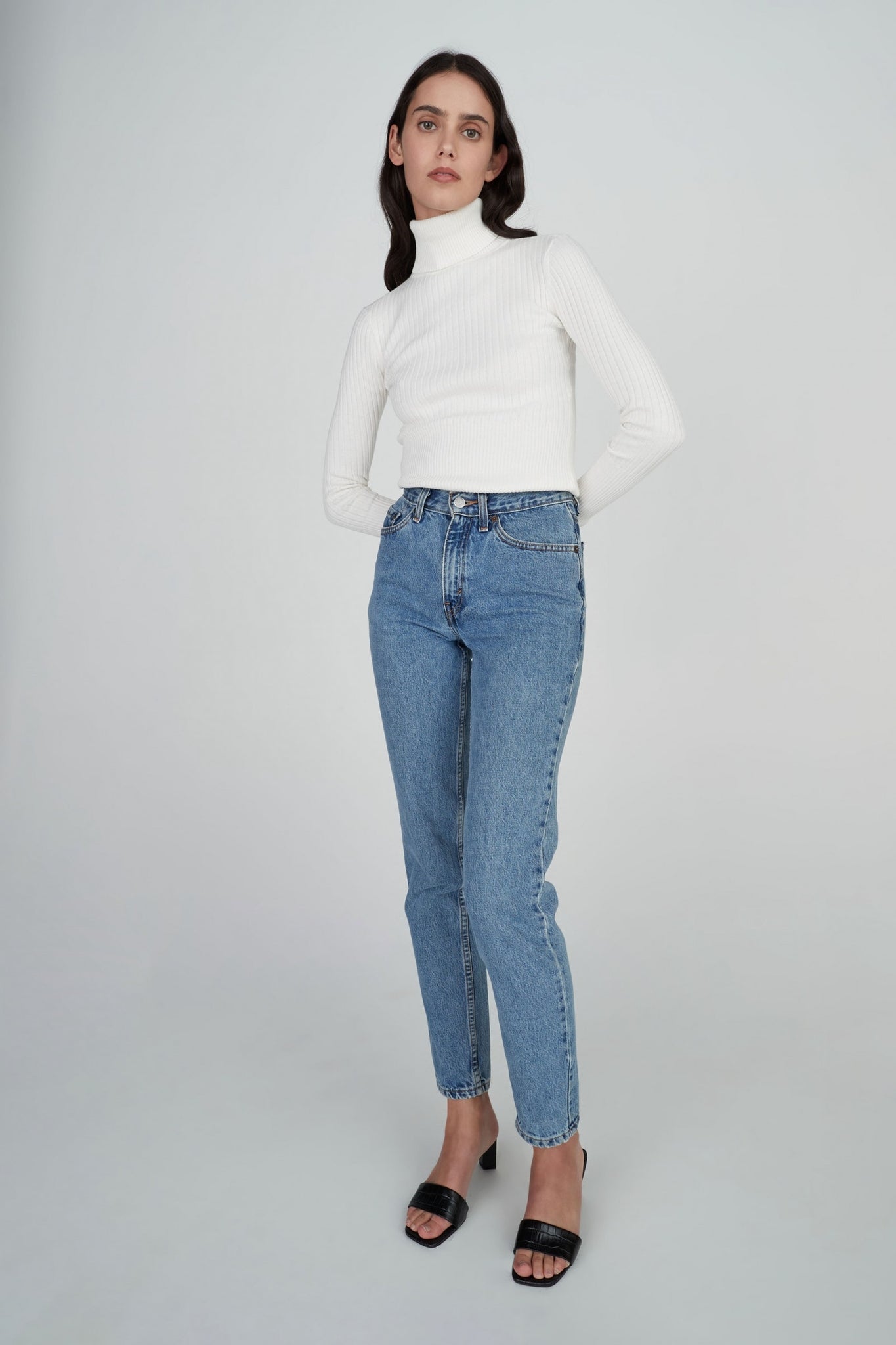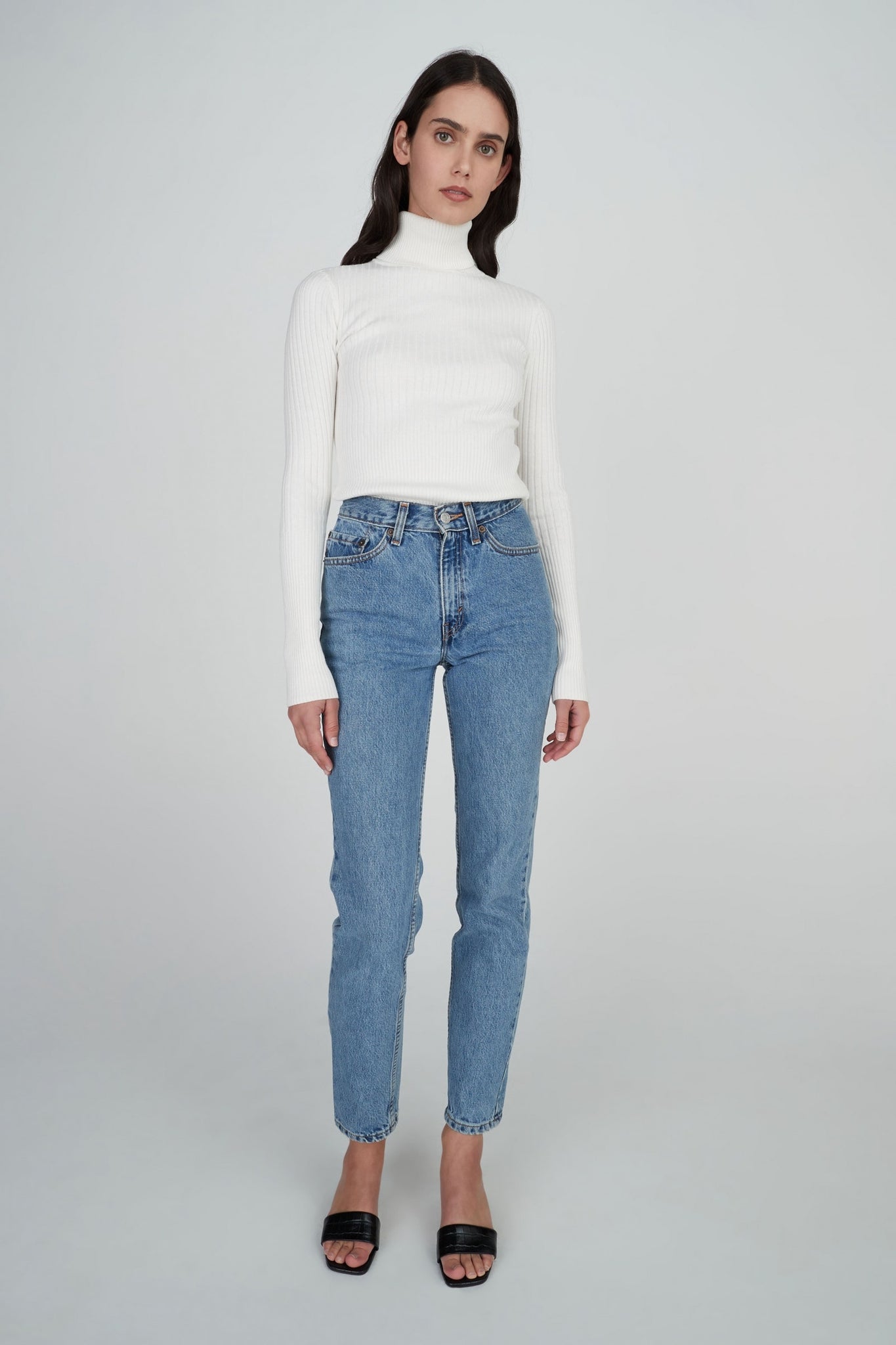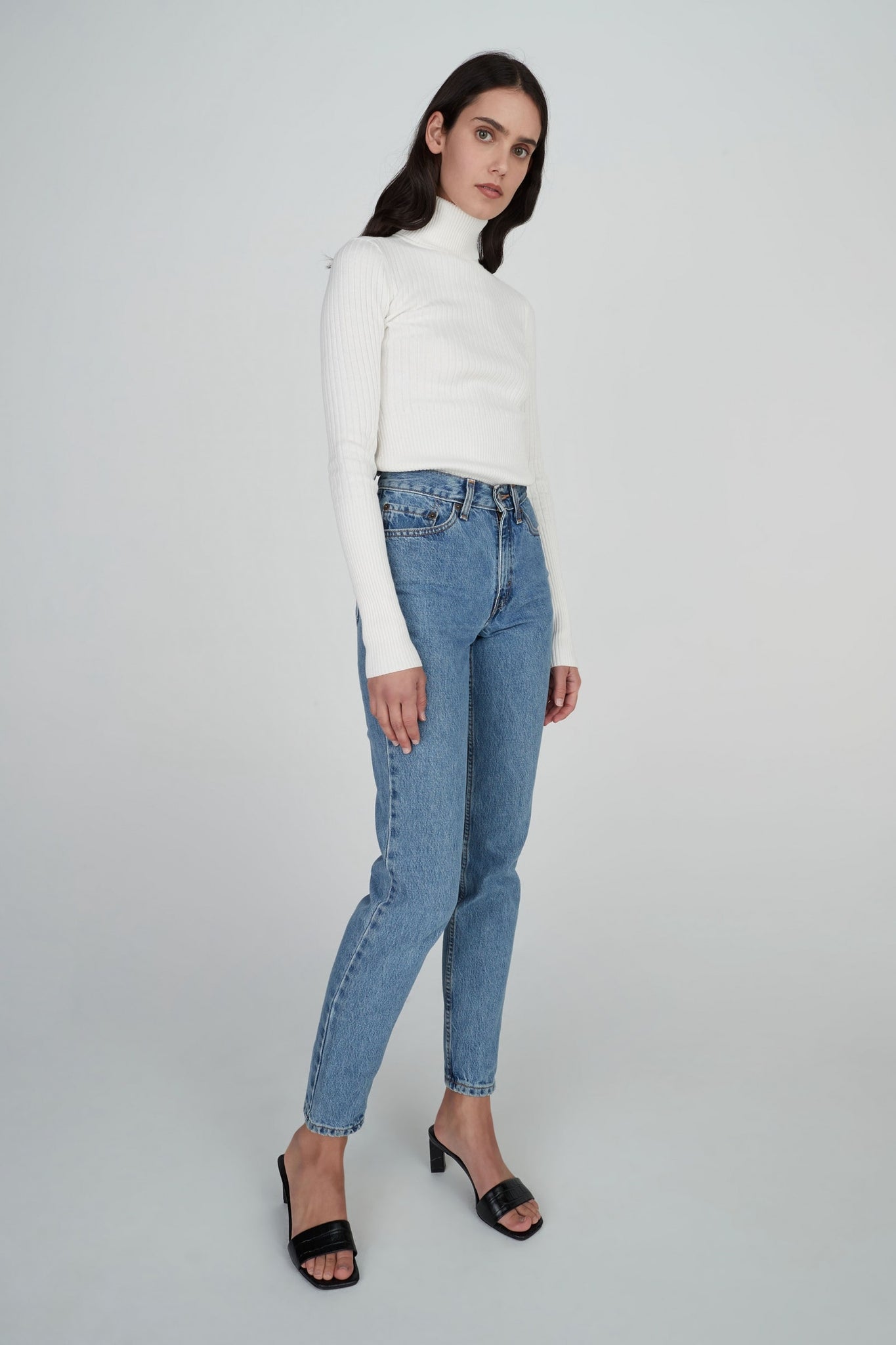 The Jaclyn Cashmere Turtleneck is a staple for your winter wardrobe. A soft, light, fitted cashmere blend ribbed knit with long sleeves and body finishing at the hips. Pair this underneath the Millard Coat for an effortless layered look. Model wears an XS.