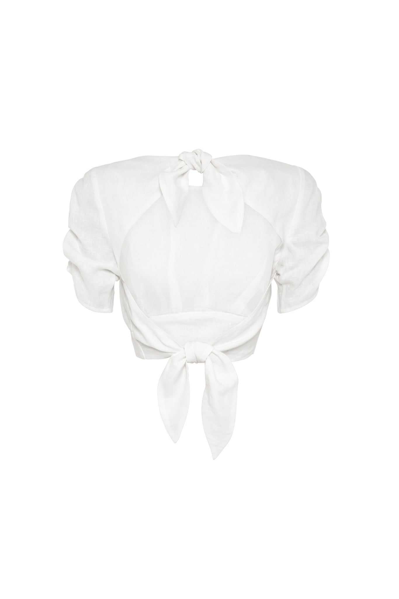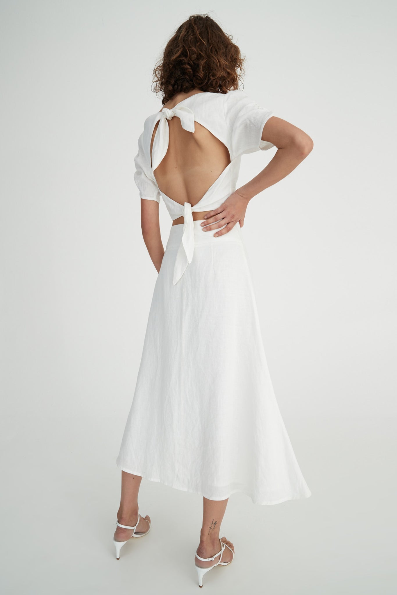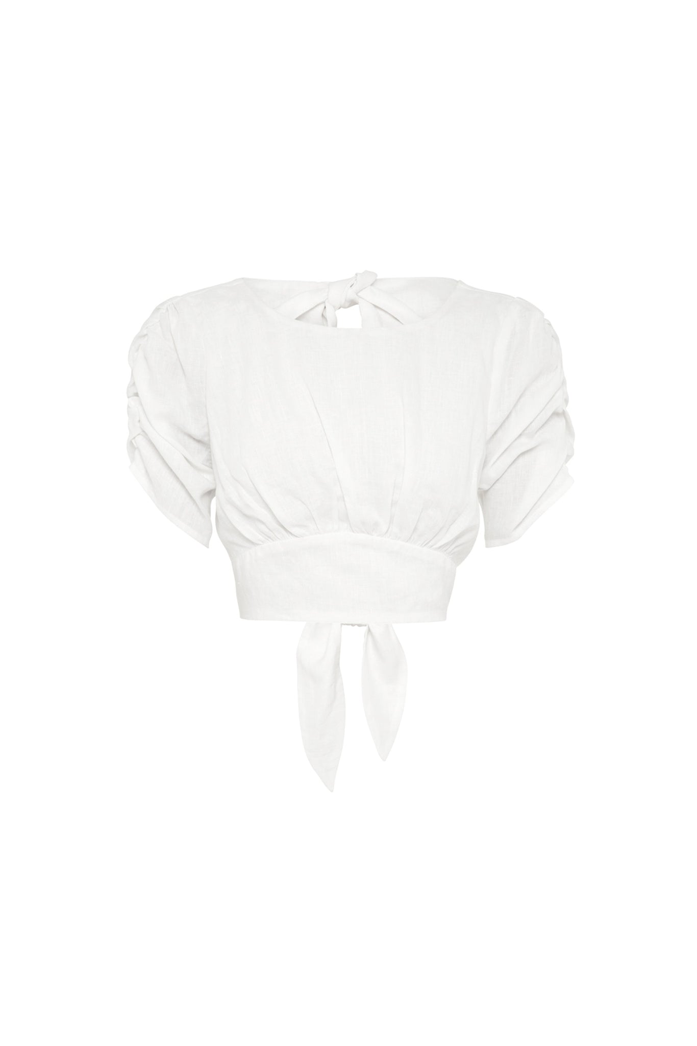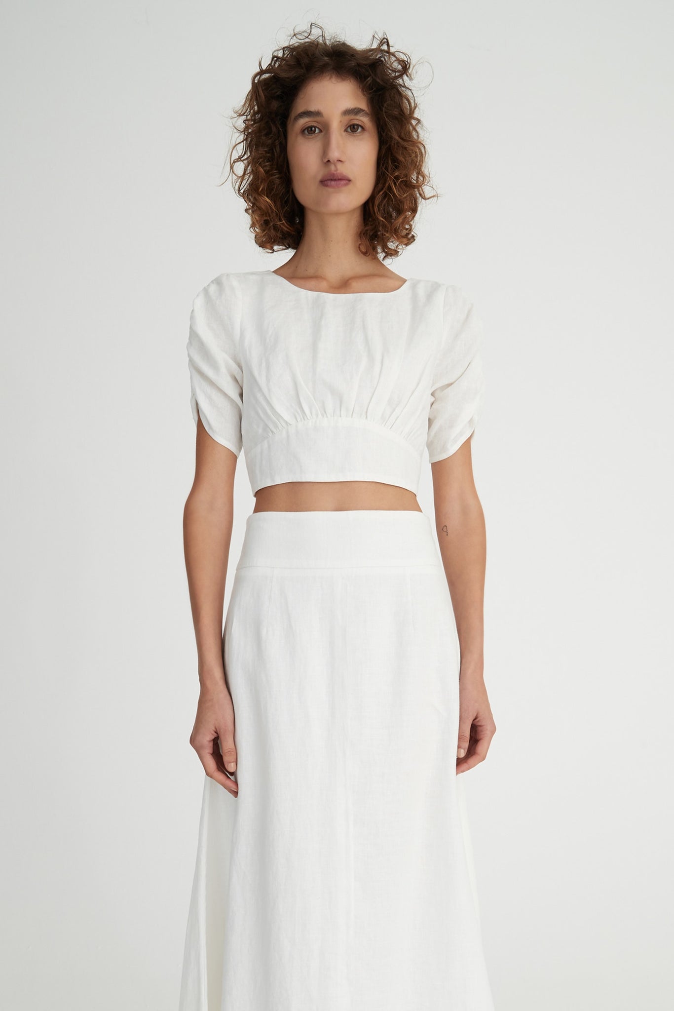 The Hansen & Gretel ‘Maddy Top’ cut in a crisp White linen. Featuring gathered capped sleeving, a large back opening tying together at the back. Perfectly paired with Mikaela Skirt for a matching linen Spring look. Model is wearing a size Small.