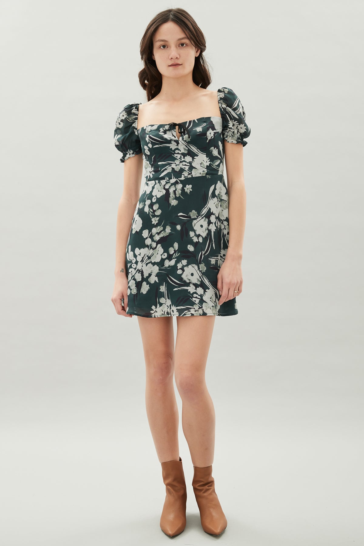 With a square neckline, short puff sleeves and short skirt the Raquel dress captures a youthful romance that is perfectly balanced with this subtle green blossom print. Paneled bodice and A-line skirt flatter and make this the ideal dress for autumn afternoons. Model is wearing a size Small.