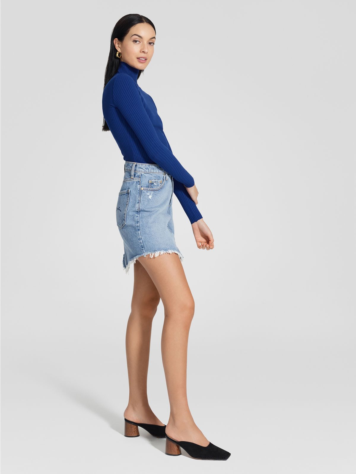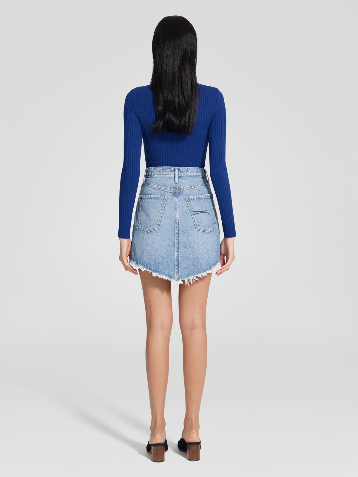 The Edge Skirt pays homage to 80's denim. A High-rise, A-line design crafted from light Authentic Indigo rigid denim featuring light distressing and cut out detailing at the hem.