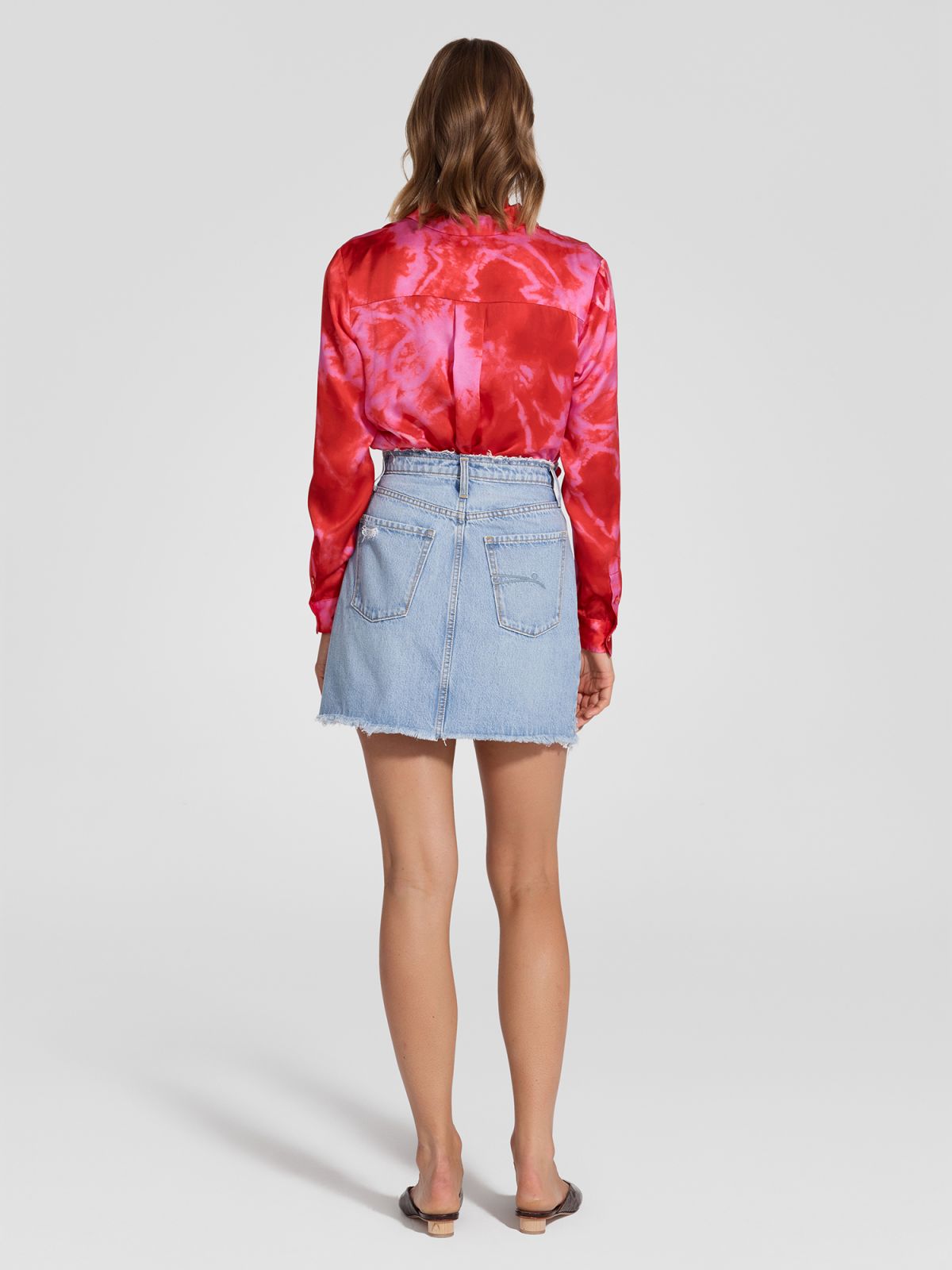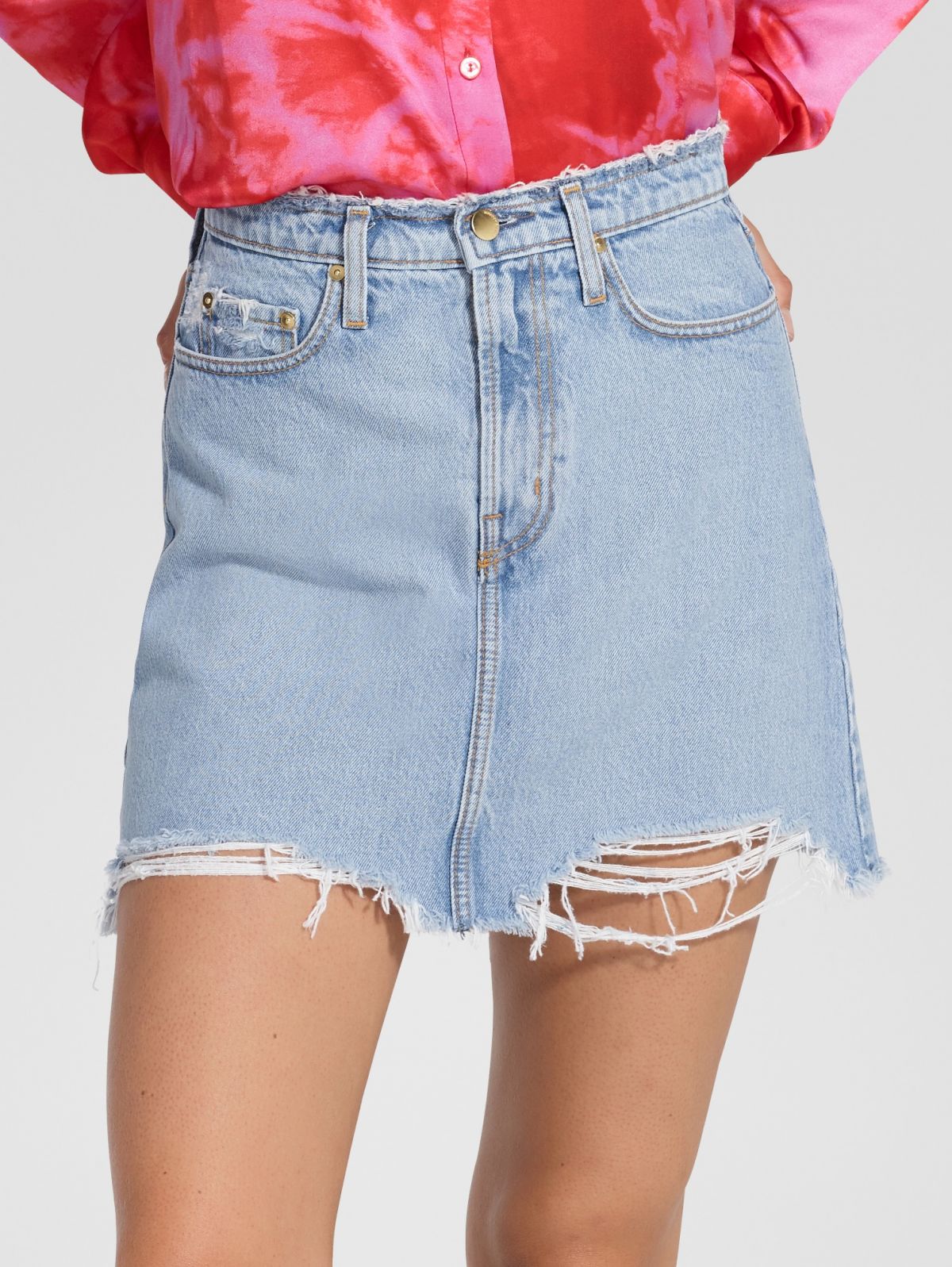 Light Authentic Indigo Rigid Denim is re-imagined in the Piper Skirt Excite. A wash deemed to excite you on all levels as this piece can be paired with anything. Featuring heavy distressing, a subtle a-line fit and frayed waistband. The epitome of ease of wear.