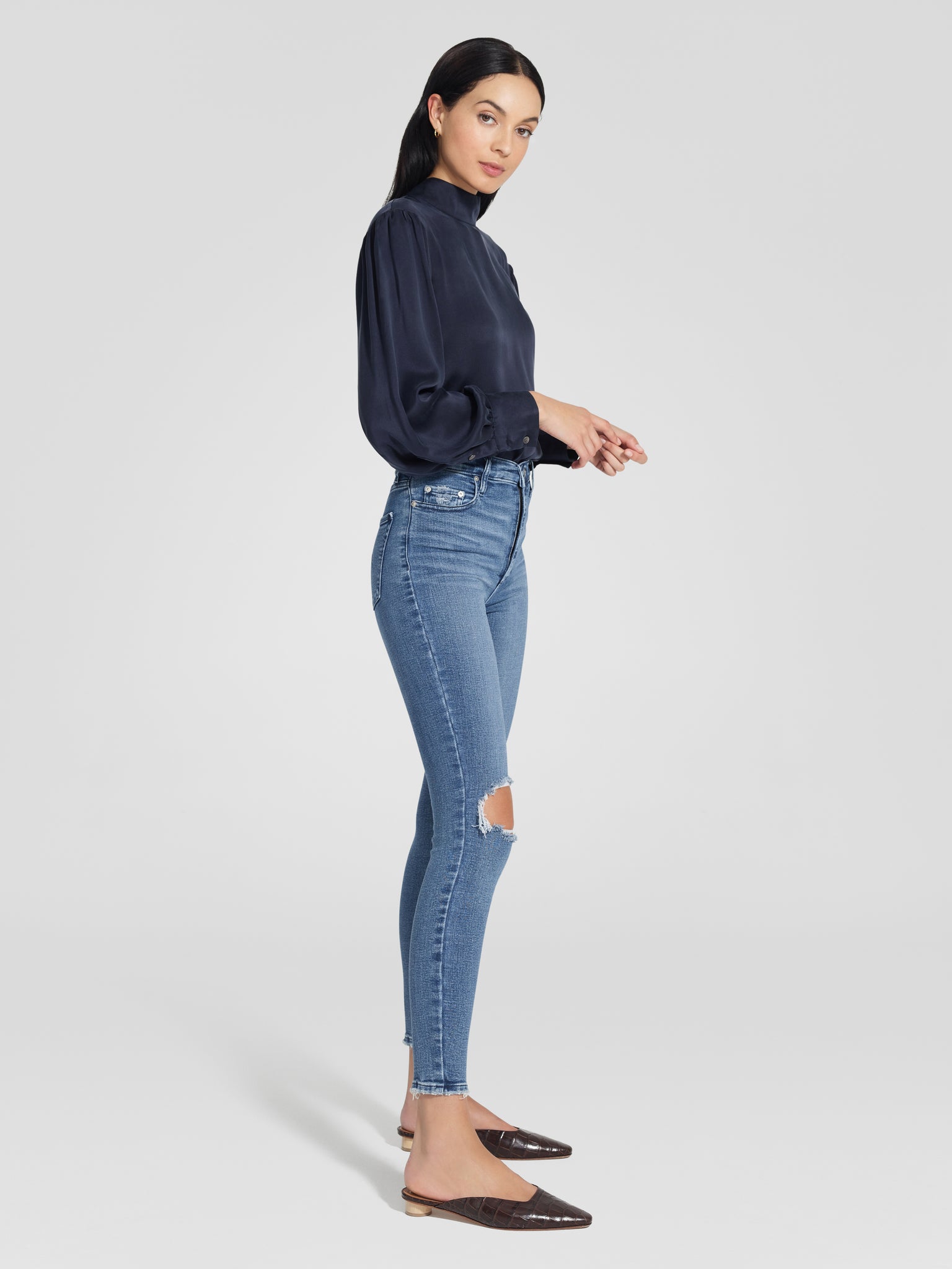 A super high rise, skinny leg, ankle crop jean constructed from mid authentic indigo engineered high stretch denim. Siren skinny ankle Instinct features a single knee rip, with subtle grinding at the hem and whiskering across the hips.