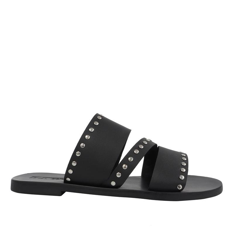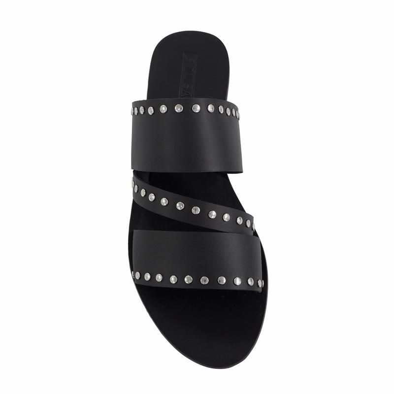 The black Betty Slide features two thick straps with a thin diagonal centre strip bordered with signature Sol Sana edgy silver studs. The classic rounded toe shape will make this your go-to slide when you need to elevate...Read more